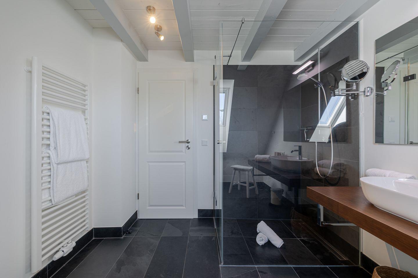 Das Highlight ist das Master-Schlafzimmer, das mit seinen charmanten Holzbalken eine warme, einladende Stimmung vermittelt. Jedes Schlafzimmer ist zudem mit einem eigenen Fernseher ausgestattet, sodass Sie den Tag entspannt und individuell ausklingen lassen können – ob mit einem Film, einer Serie oder einfach in Ruhe.