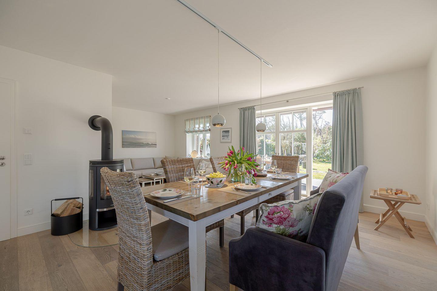 Erleben Sie das luxuriöse Ferienhaus „Hygge Hus“ auf Sylt mit Sauna, Kamin und großem Garten für erholsame Urlaubsmomente.