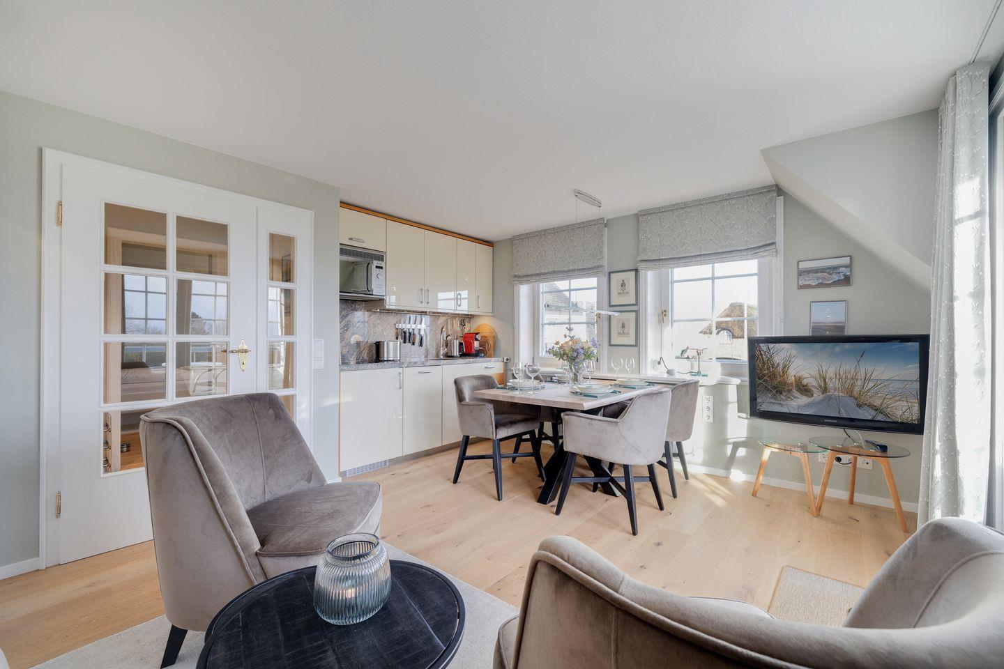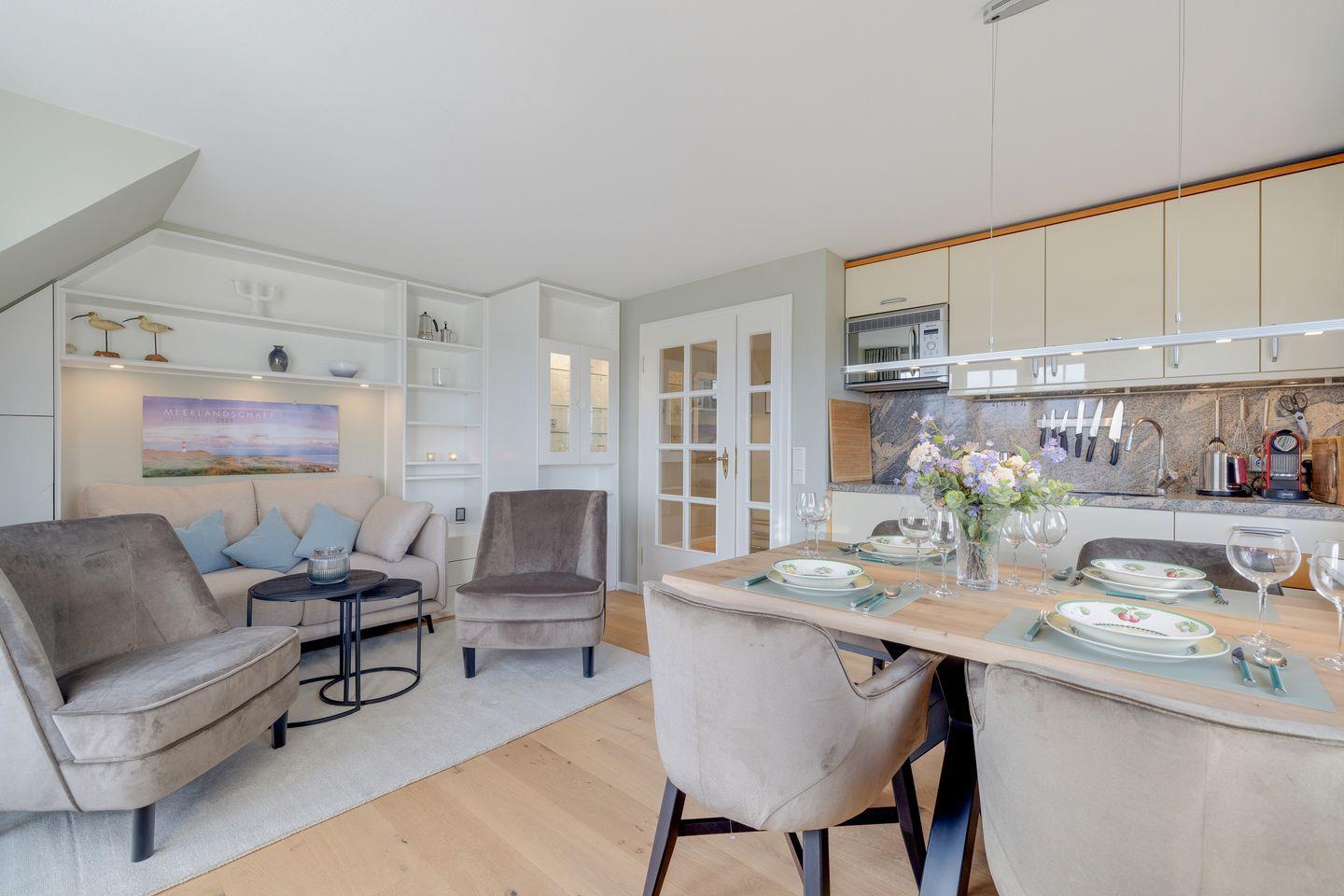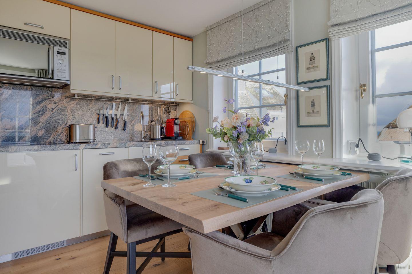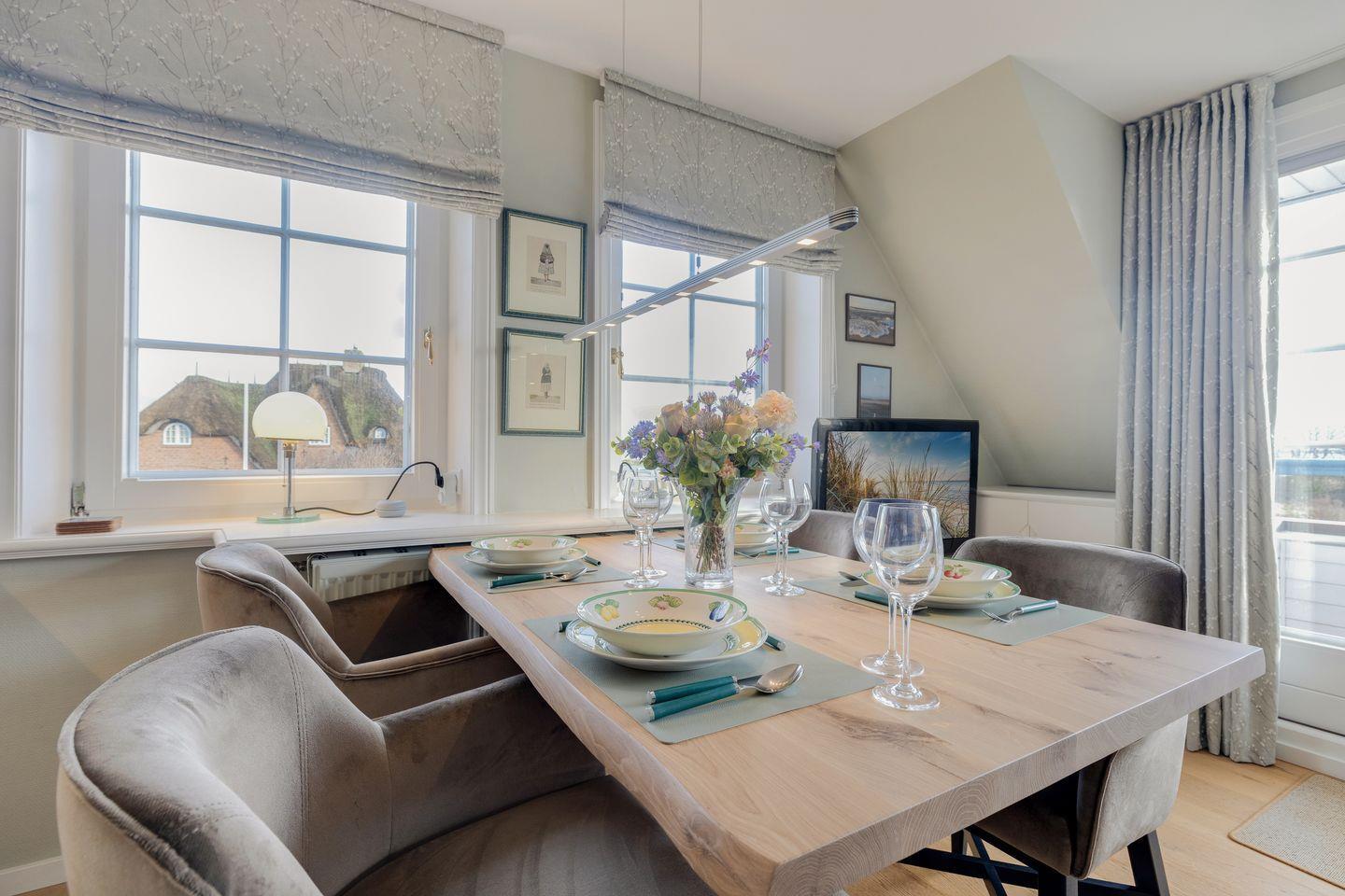 Stilvolle Ferienwohnung "Waterkant" in Munkmarsch mit seitlichem Blick aufs Wattenmeer. Über den Eingang gelangen Sie ins Obergeschoss: lichtdurchfluteter Wohn-/Essbereich mit geschmackvollen Möbeln, offener Küche und Südbalkon. Ebenfalls auf dieser Etage: (Kinder-)Schlafzimmer mit zwei Einzelbetten (1,20 x 2,00 m) und Bad mit Dusche/WC. Ein weiteres Schlafzimmer mit Boxspringbett (1,80 x 2,00 m) befindet sich im ersten Obergeschoss. Waschmaschine & Trockner sind im Gemeinschaftsraum verfügbar.