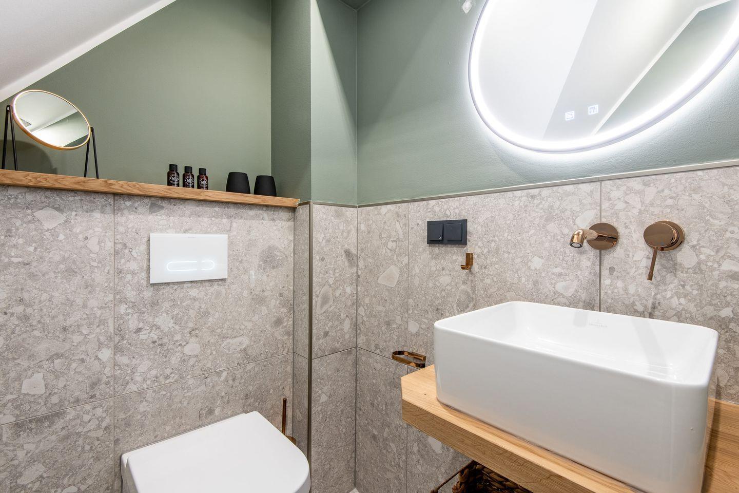 Die zwei modernen Badezimmer sind mit ebenerdigen Duschen ausgestattet. Ein zusätzliches Gäste-WC sorgt für noch mehr Komfort. Highlight ist der gemeinschaftlich nutzbare Wellnessbereich mit Sauna und Fitnessgeräten, der Ihnen pure Entspannung bietet.