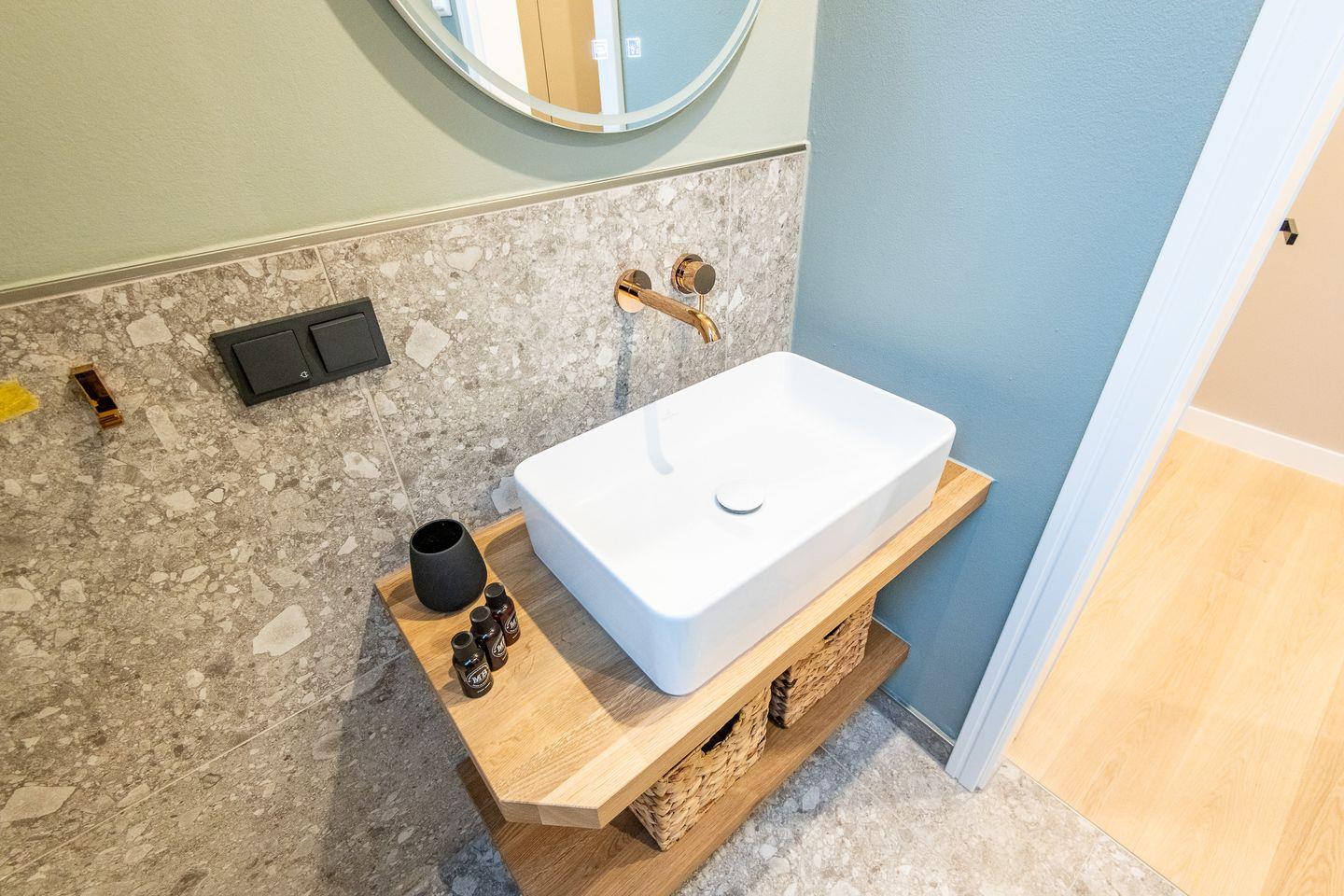 Die Ferienwohnung bietet Ihnen Zugang zu einem gemeinschaftlichen Wellness- und Fitnessbereich. Entspannen Sie in der Sauna, nutzen Sie den Fitnessraum oder die gemeinschaftlichen Wasch- und Trocknergeräte – alles wurde mit Ihrem Komfort im Blick gestaltet. Das Badezimmer mit moderner Dusche und ein zusätzliches Gäste-WC sorgen für zusätzliche Annehmlichkeiten.