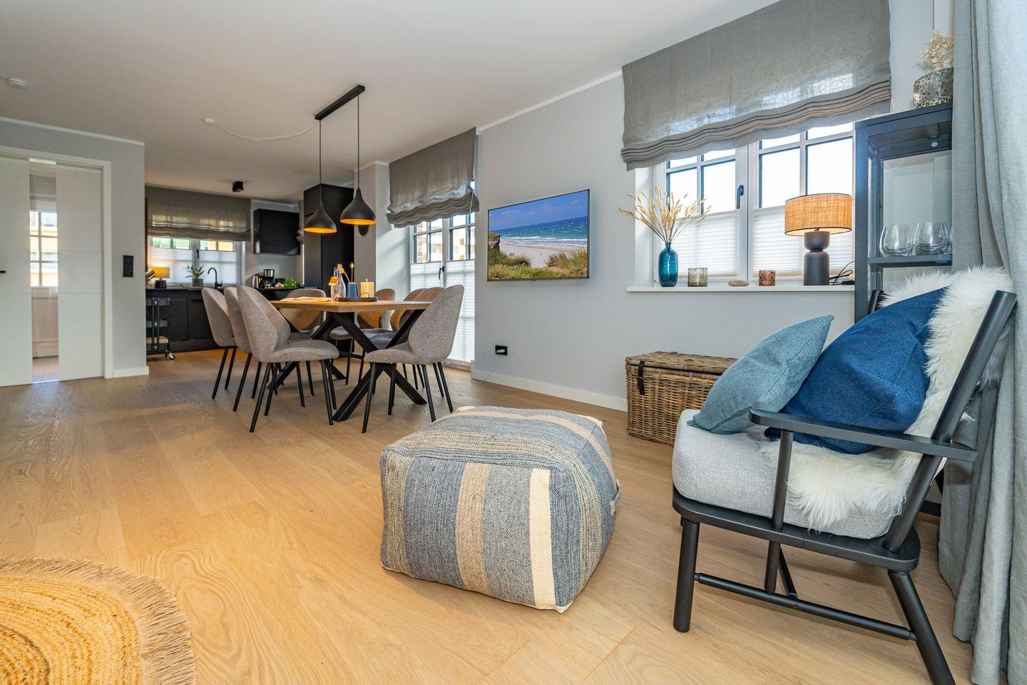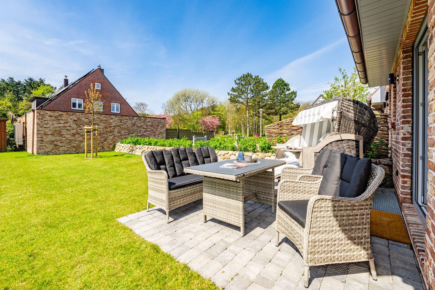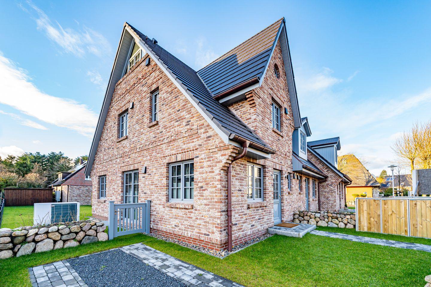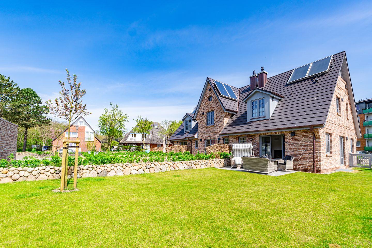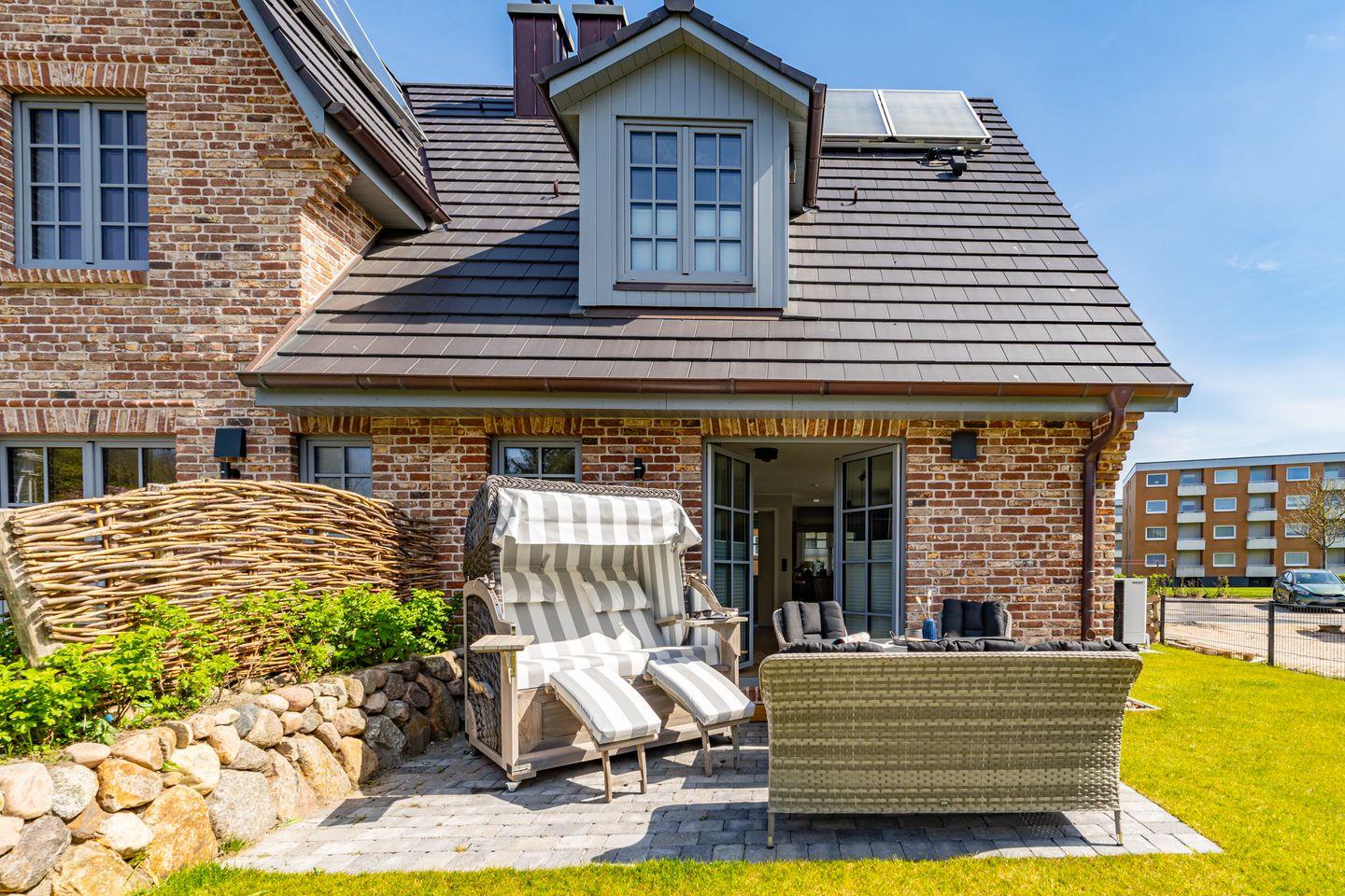 Die Ferienhaushälfte überzeugt mit einer offenen und lichtdurchfluteten Raumgestaltung. Die moderne, offene Küche, ausgestattet mit einem Kaffeevollautomaten, Backofen und Geschirrspüler, ermöglicht es Ihnen köstliche Mahlzeiten zu zaubern. Der große, einladende Wohnbereich mit Sofa und Kamin lädt zum Entspannen ein. Hier können Sie nach einem Tag am Strand oder in der Natur gemütliche Abende verbringen. Vom Wohnzimmer aus haben Sie Zutritt zum Garten mit Terrasse. Ebenfalls im Erdgeschoss befindet sich ein separates Gäste-WC. Über eine Treppe gelangen Sie ins Souterrain, hier befindet sich ein Schlafzimmer mit Doppelbett, TV und Kleiderschrank. Außerdem ist auf dieser Eben ein Badezimmer mit Dusche, Badewanne und, das absolute Highlight, eine eigene Sauna, die Ihnen das ganze Jahr über zur Verfügung steht. Nach einem erlebnisreichen Tag auf der Insel können Sie hier relaxen und neue Energie tanken. Im ersten Obergeschoss befindet sich ein Schlafzimmer mit Doppelbett und ein weiteres Schlafzimmer mit Einzelbett. Beide Räume verfügen über einen Kleiderschrank und TV. Ebenfalls auf dieser Ebene befindet sich das zweite Badezimmer, ausgestattet mit einer Dusche und Handtuchheizkörper. Über eine weitere Treppe gelangen Sie in das Dachgeschoss der Haushälfte, hier befindet sich das vierte Schlafzimmer ausgestattet mit einem Doppelbett und TV. Die Lage ist unschlagbar: Nur 650 Meter vom schönen Sandstrand entfernt, können Sie zu Fuß die frische Meeresluft und die funkelnden Wellen genießen.