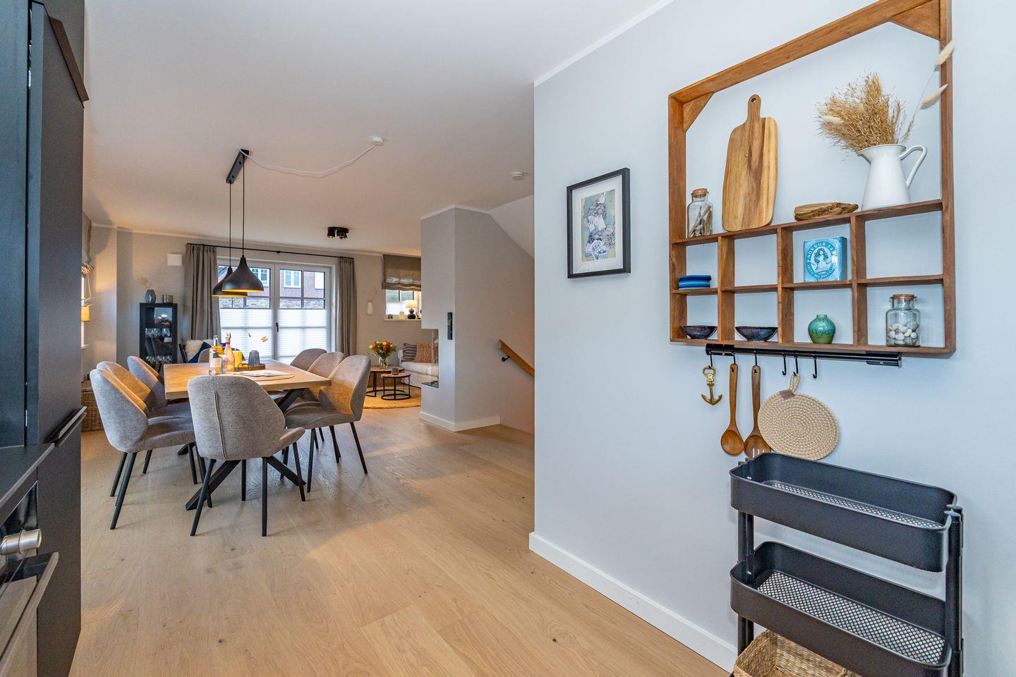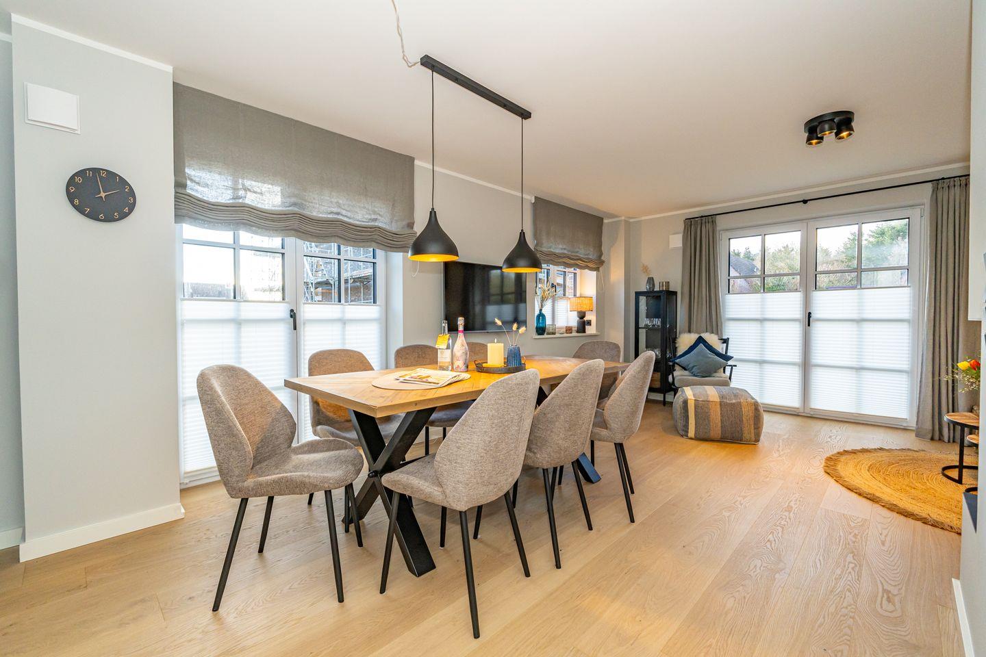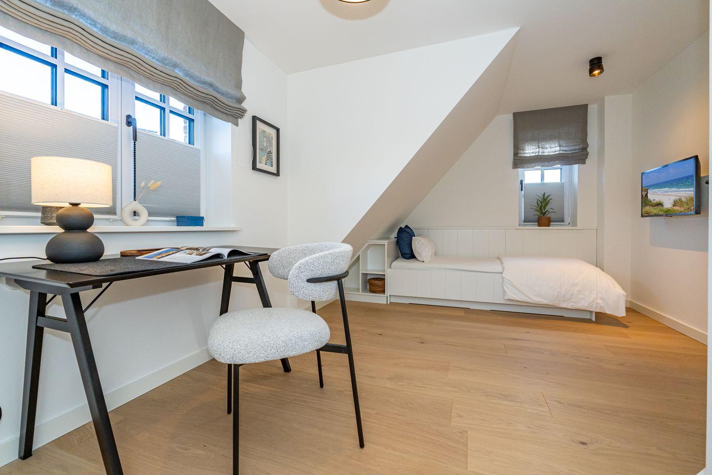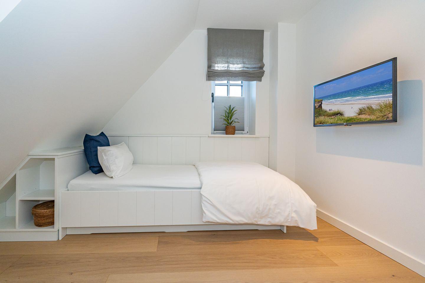 Die Ferienhaushälfte überzeugt mit einer offenen und lichtdurchfluteten Raumgestaltung. Die moderne, offene Küche, ausgestattet mit einem Kaffeevollautomaten, Backofen und Geschirrspüler, ermöglicht es Ihnen köstliche Mahlzeiten zu zaubern. Der große, einladende Wohnbereich mit Sofa und Kamin lädt zum Entspannen ein. Hier können Sie nach einem Tag am Strand oder in der Natur gemütliche Abende verbringen. Vom Wohnzimmer aus haben Sie Zutritt zum Garten mit Terrasse. Ebenfalls im Erdgeschoss befindet sich ein separates Gäste-WC. Über eine Treppe gelangen Sie ins Souterrain, hier befindet sich ein Schlafzimmer mit Doppelbett, TV und Kleiderschrank. Außerdem ist auf dieser Eben ein Badezimmer mit Dusche, Badewanne und, das absolute Highlight, eine eigene Sauna, die Ihnen das ganze Jahr über zur Verfügung steht. Nach einem erlebnisreichen Tag auf der Insel können Sie hier relaxen und neue Energie tanken. Im ersten Obergeschoss befindet sich ein Schlafzimmer mit Doppelbett und ein weiteres Schlafzimmer mit Einzelbett. Beide Räume verfügen über einen Kleiderschrank und TV. Ebenfalls auf dieser Ebene befindet sich das zweite Badezimmer, ausgestattet mit einer Dusche und Handtuchheizkörper. Über eine weitere Treppe gelangen Sie in das Dachgeschoss der Haushälfte, hier befindet sich das vierte Schlafzimmer ausgestattet mit einem Doppelbett und TV. Die Lage ist unschlagbar: Nur 650 Meter vom schönen Sandstrand entfernt, können Sie zu Fuß die frische Meeresluft und die funkelnden Wellen genießen.