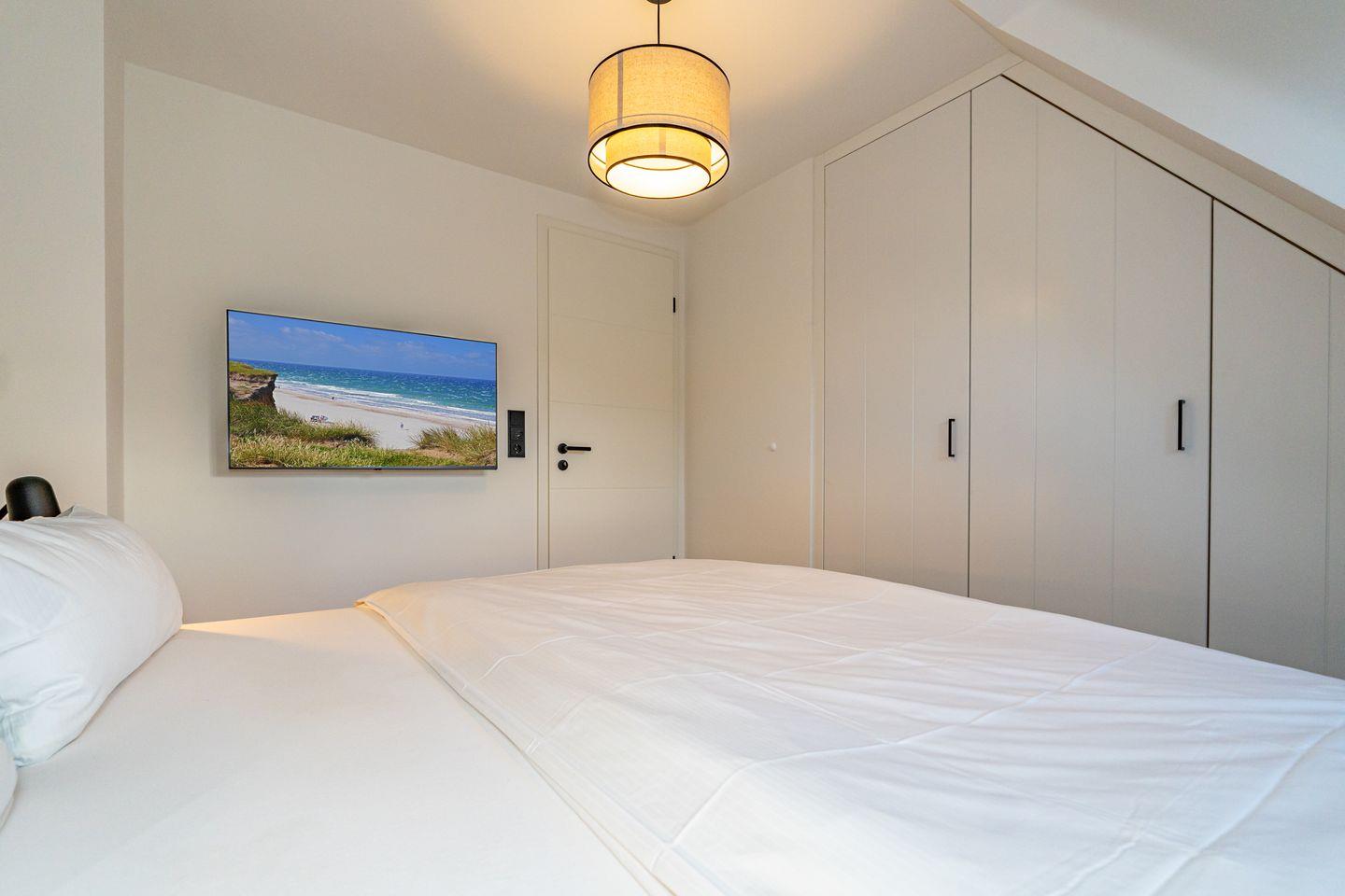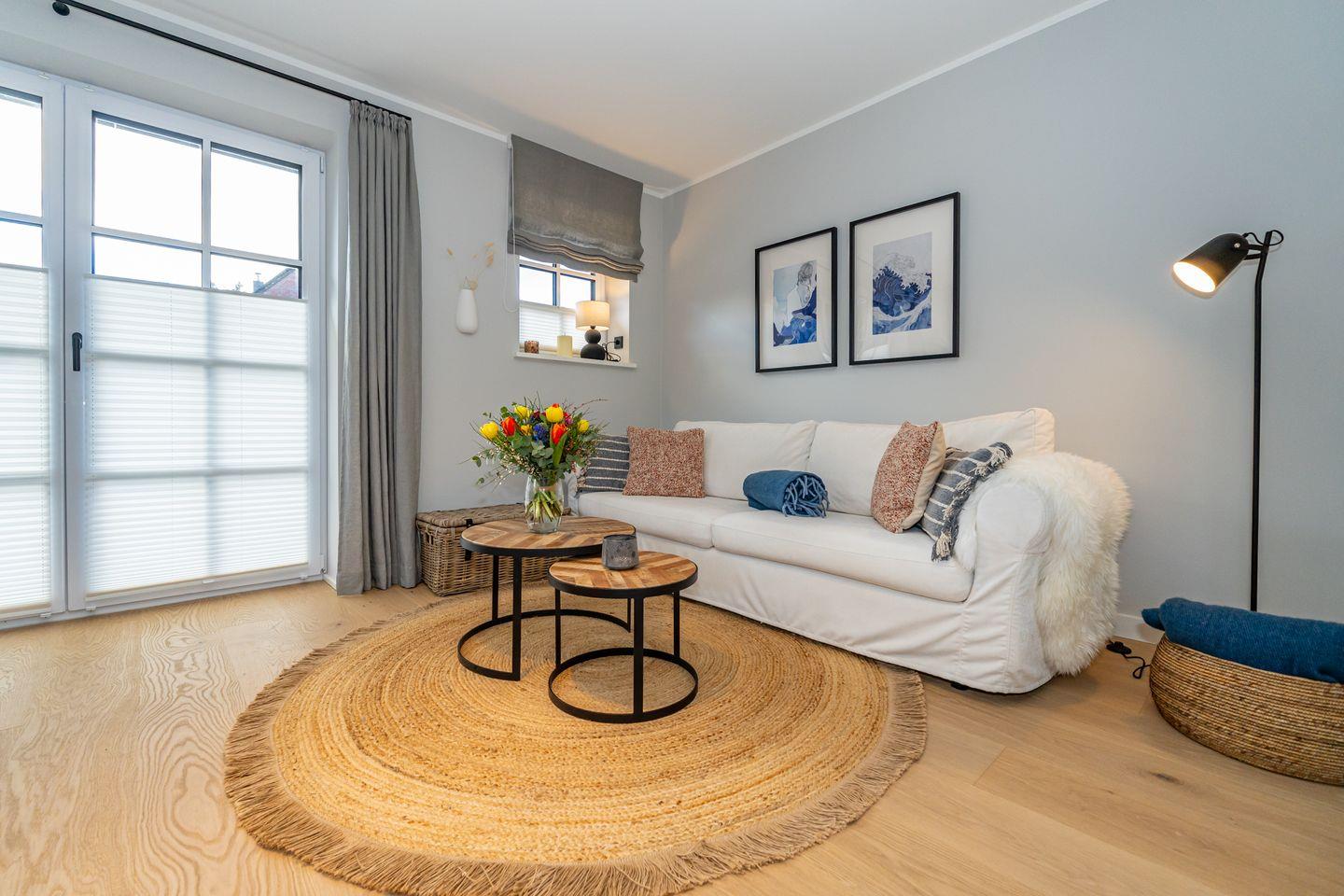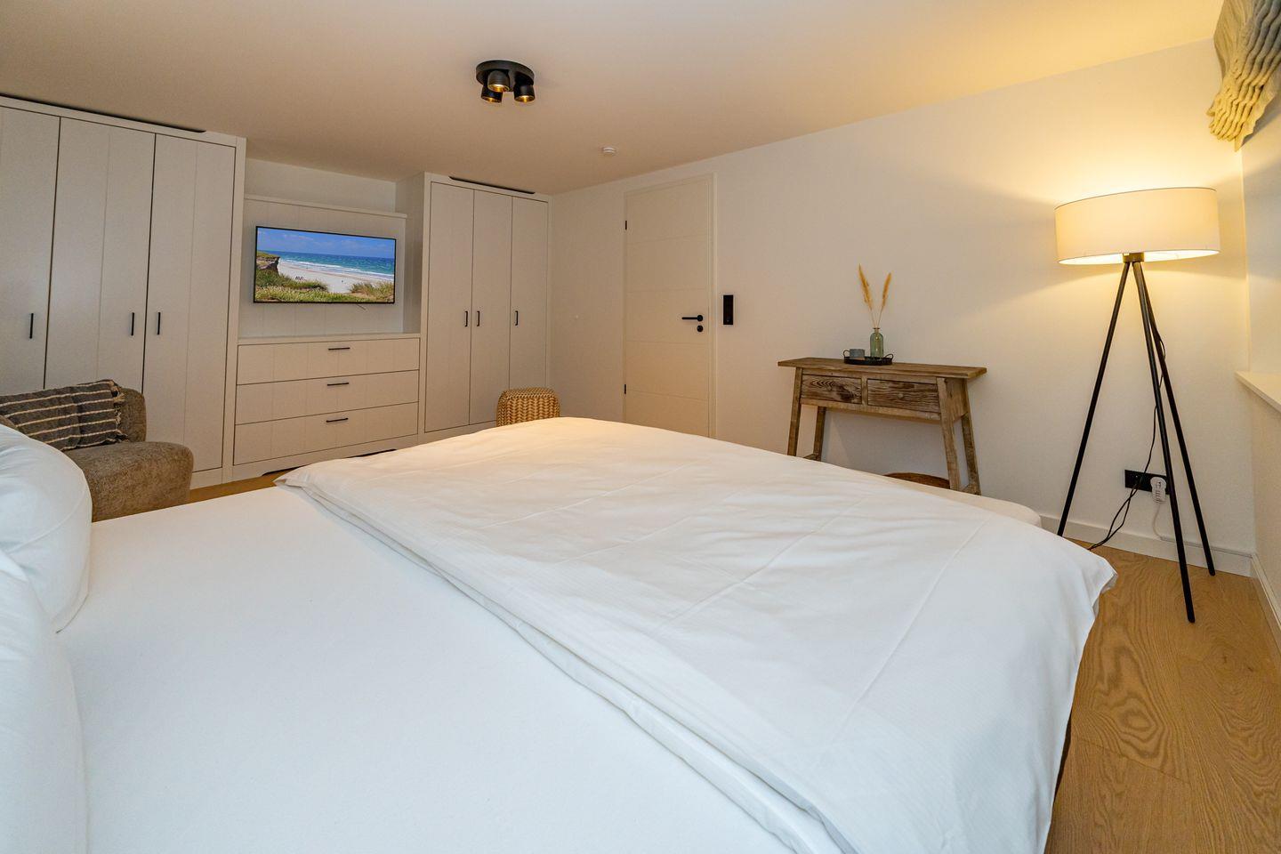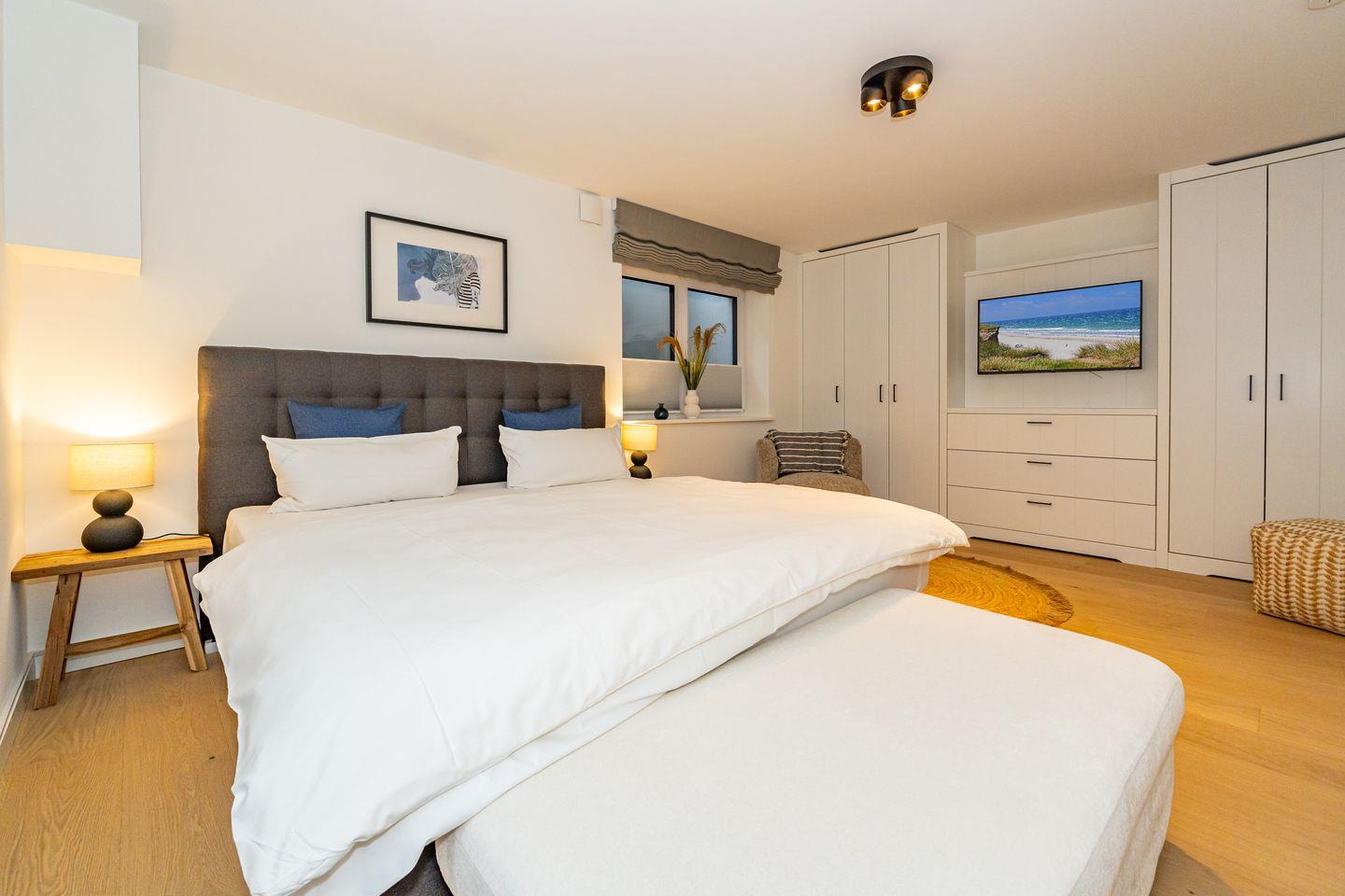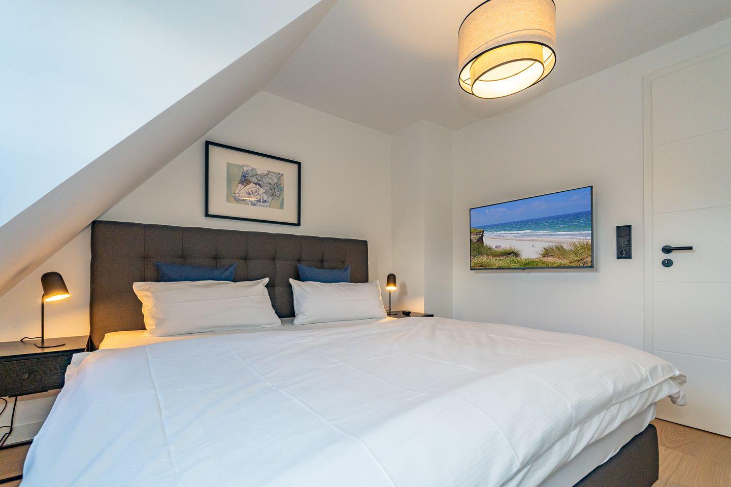 Die Ferienhaushälfte überzeugt mit einer offenen und lichtdurchfluteten Raumgestaltung. Die moderne, offene Küche, ausgestattet mit einem Kaffeevollautomaten, Backofen und Geschirrspüler, ermöglicht es Ihnen köstliche Mahlzeiten zu zaubern. Der große, einladende Wohnbereich mit Sofa und Kamin lädt zum Entspannen ein. Hier können Sie nach einem Tag am Strand oder in der Natur gemütliche Abende verbringen. Vom Wohnzimmer aus haben Sie Zutritt zum Garten mit Terrasse. Ebenfalls im Erdgeschoss befindet sich ein separates Gäste-WC. Über eine Treppe gelangen Sie ins Souterrain, hier befindet sich ein Schlafzimmer mit Doppelbett, TV und Kleiderschrank. Außerdem ist auf dieser Eben ein Badezimmer mit Dusche, Badewanne und, das absolute Highlight, eine eigene Sauna, die Ihnen das ganze Jahr über zur Verfügung steht. Nach einem erlebnisreichen Tag auf der Insel können Sie hier relaxen und neue Energie tanken. Im ersten Obergeschoss befindet sich ein Schlafzimmer mit Doppelbett und ein weiteres Schlafzimmer mit Einzelbett. Beide Räume verfügen über einen Kleiderschrank und TV. Ebenfalls auf dieser Ebene befindet sich das zweite Badezimmer, ausgestattet mit einer Dusche und Handtuchheizkörper. Über eine weitere Treppe gelangen Sie in das Dachgeschoss der Haushälfte, hier befindet sich das vierte Schlafzimmer ausgestattet mit einem Doppelbett und TV. Die Lage ist unschlagbar: Nur 650 Meter vom schönen Sandstrand entfernt, können Sie zu Fuß die frische Meeresluft und die funkelnden Wellen genießen.