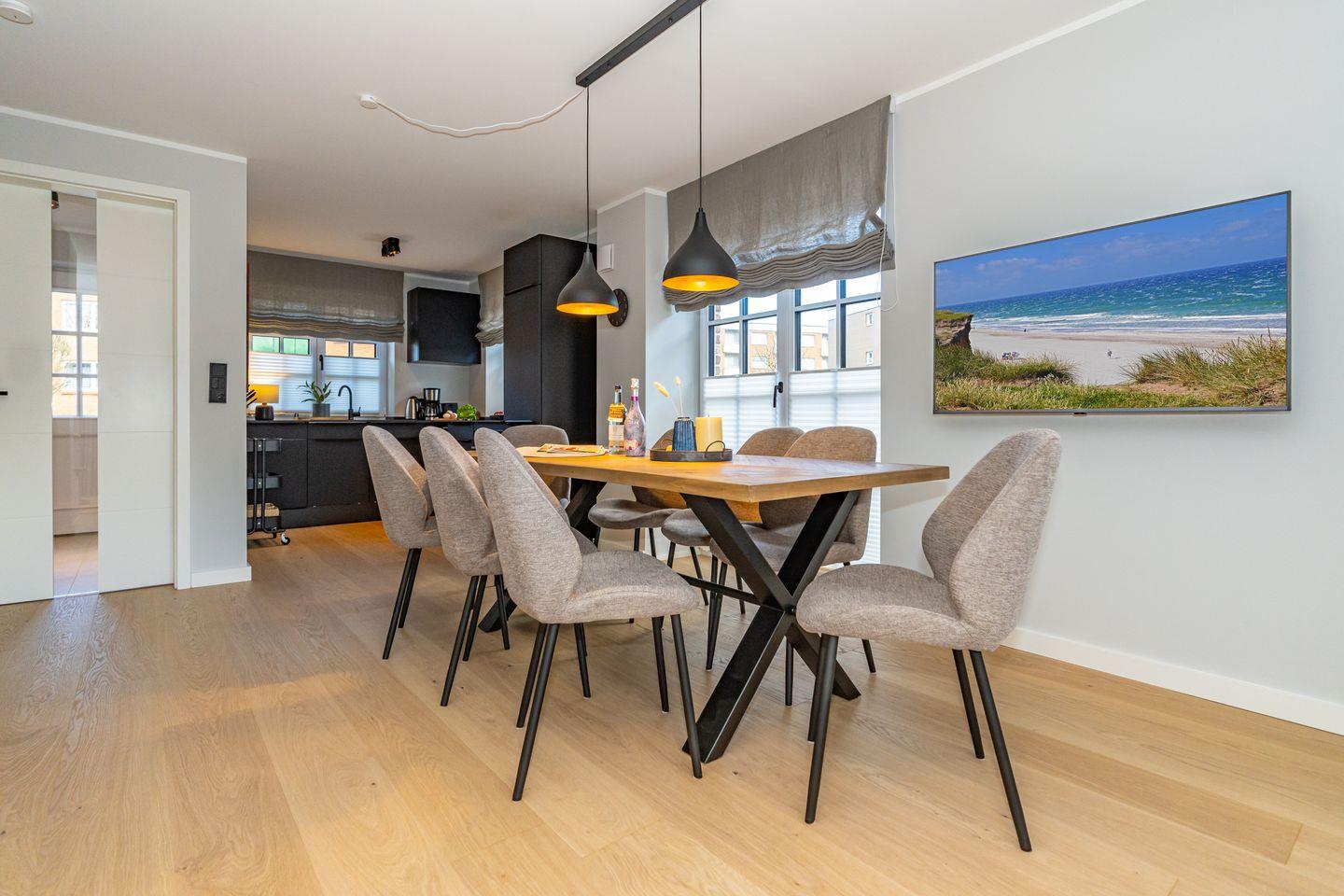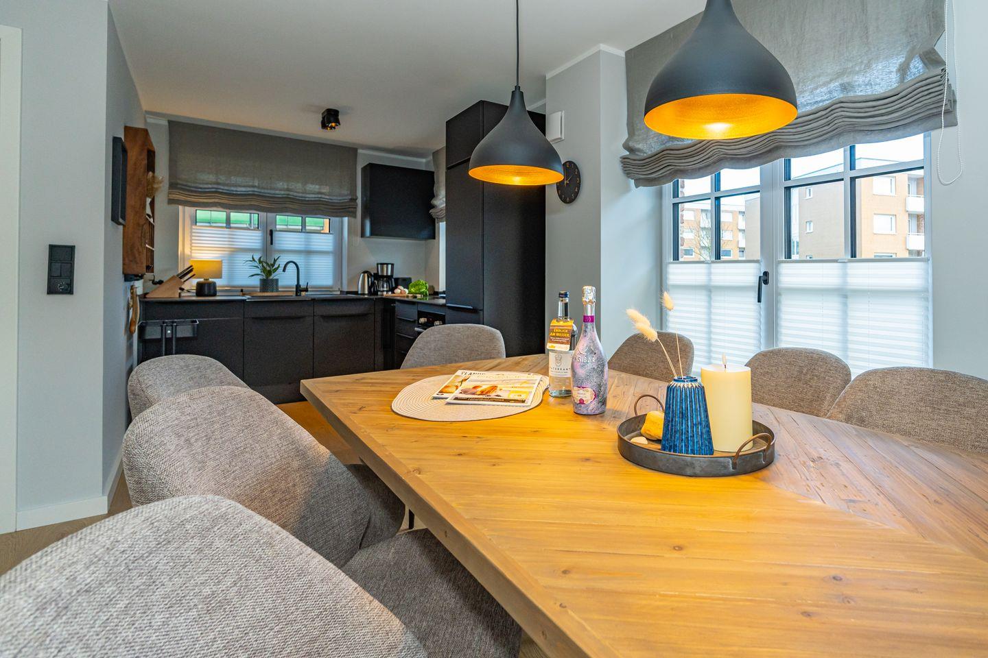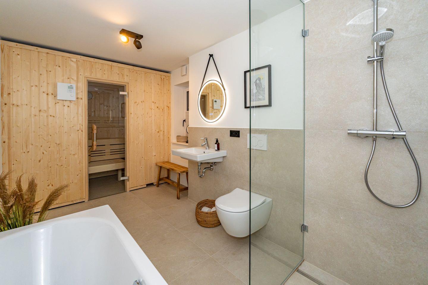 Diese geräumige 140 m² große Ferienhaushälfte, für bis zu sieben Personen, bietet 4 Schlafzimmer, 2 Badezimmer sowie ein Gäste-WC und eine moderne offene Küche. Entspannen Sie auf der gemütlichen Terrasse im Garten oder genießen Sie die Sauna zur Eigennutzung.