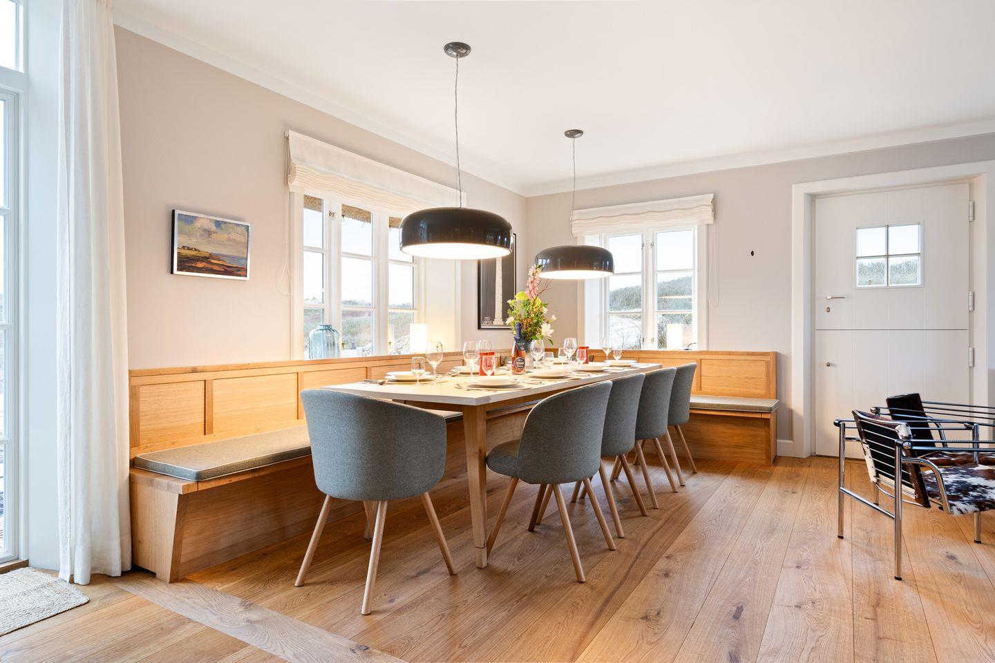 Die voll ausgestattete Küche ist ein Highlight für alle, die das Kochen lieben. Sie verfügt über modernste Geräte, darunter einen Induktionsherd, einen Backofen und eine Nespresso-Maschine – perfekt für den ersten Kaffee am Morgen. Der große Esstisch, ein rustikaler Brauhaustisch, lädt zu geselligen Mahlzeiten ein. Direkt von der Küche aus gelangen Sie auf die Südterrasse, die mit hochwertigen Gartenmöbeln ausgestattet ist und sich hervorragend für ein ausgedehntes Frühstück im Freien eignet.