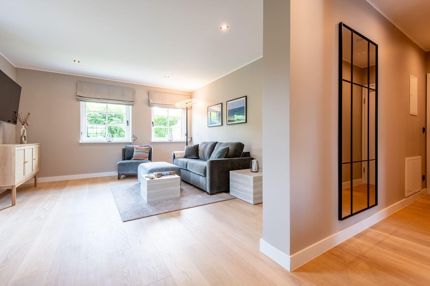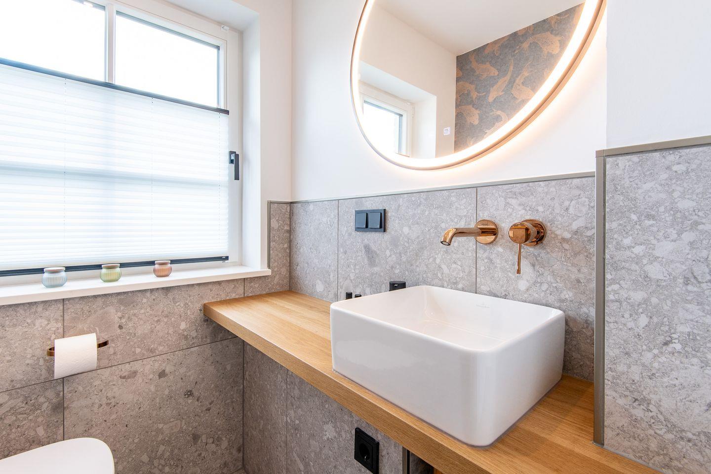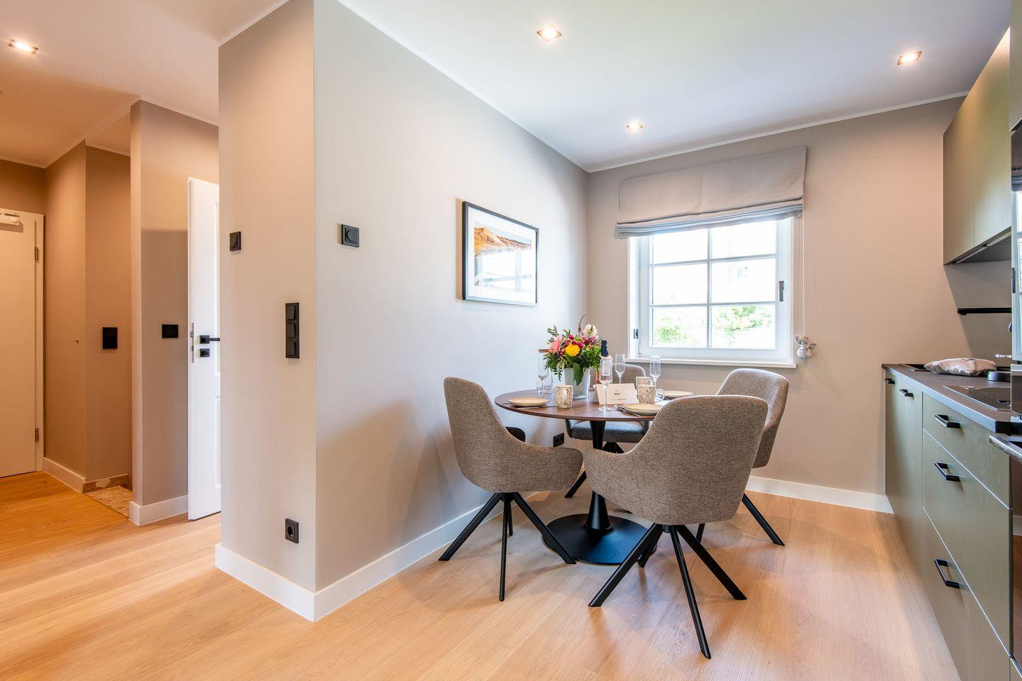 Der Wohnbereich lädt mit einer stilvollen Einrichtung und einer einladenden Atmosphäre zum Verweilen ein. Hier können Sie entspannte Stunden mit der verbringen oder den Tag bei einem Film ausklingen lassen. Der angrenzende Essbereich bietet Platz für gemeinsame Mahlzeiten und gesellige Abende. Auf der großen Süd-Terrasse scheint die Sonne nahezu den ganzen Tag für Sie.