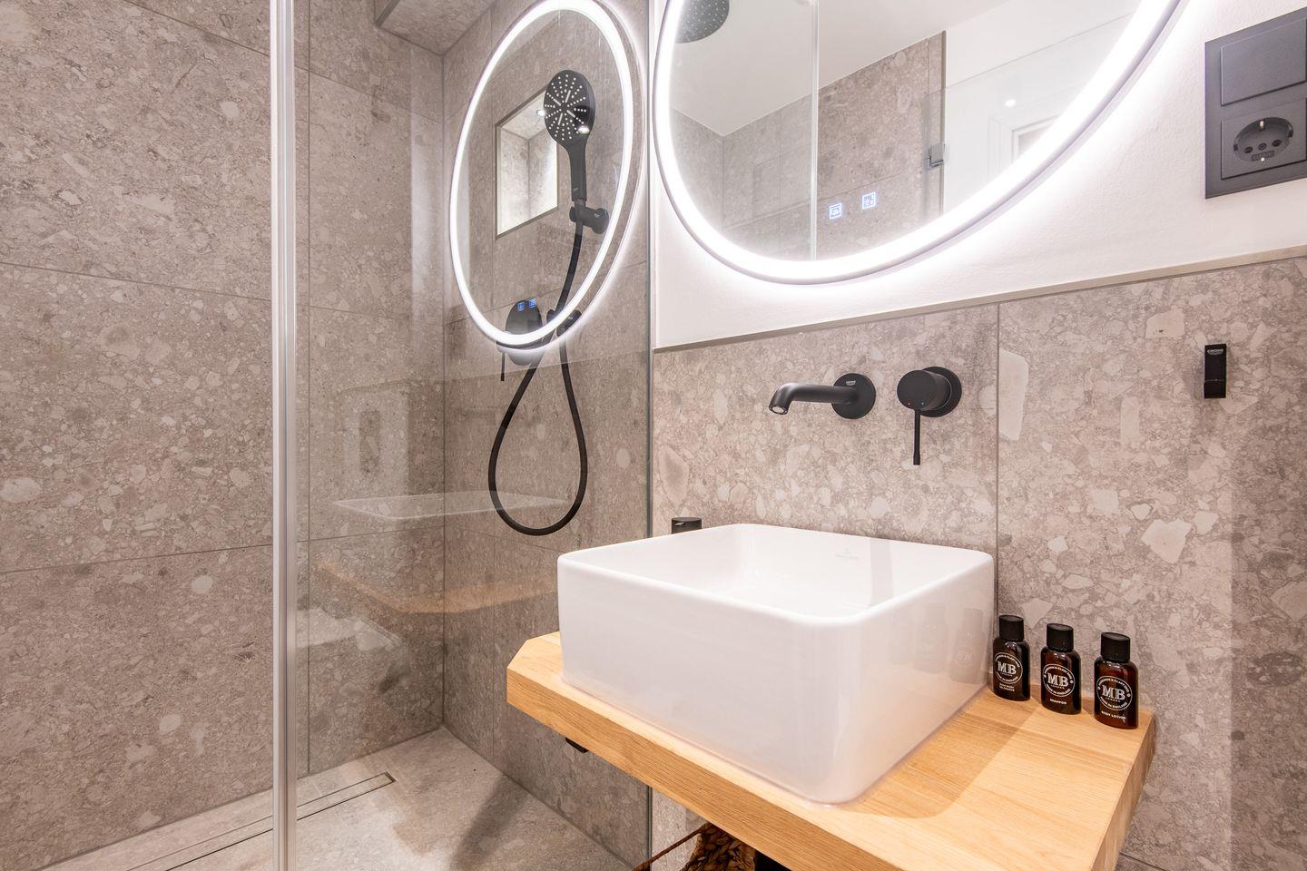 Das moderne Badezimmer ist mit einer ebenerdigen Dusche ausgestattet und ein Gäste-WC sorgt zusätzlich für Komfort. Highlight ist der gemeinschaftlich nutzbare Wellnessbereich mit Sauna und Fitnessgeräten, der Ihnen pure Entspannung bietet.