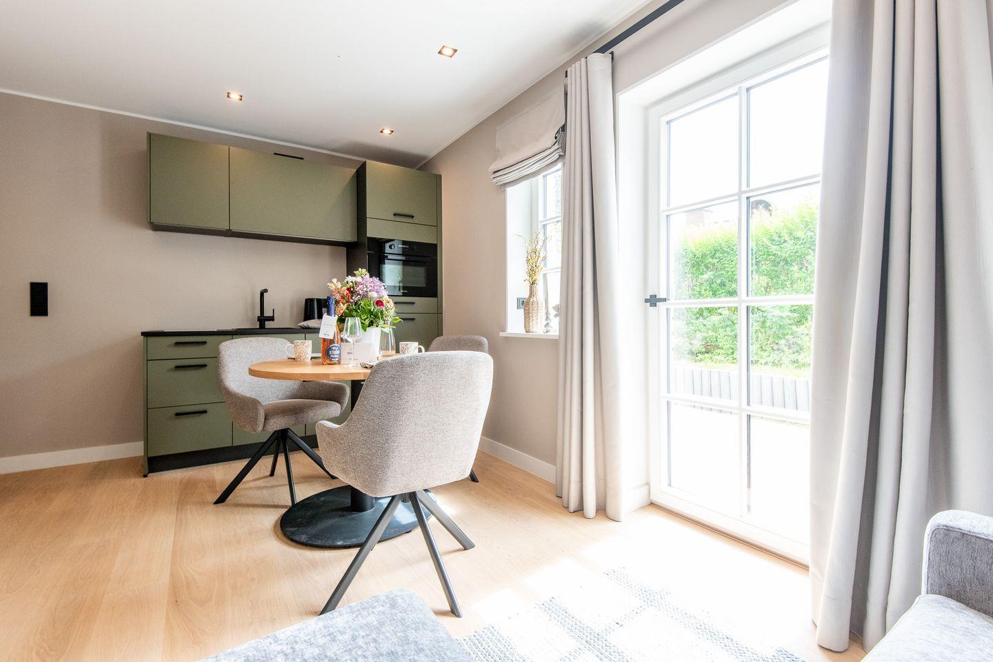 Der gemütliche Wohnbereich lädt mit einer stilvollen Einrichtung und einer einladenden Atmosphäre zum Verweilen ein. Hier können Sie entspannte Stunden zu zweit verbringen oder den Tag bei einem Film ausklingen lassen. Der angrenzende Essbereich bietet Platz für gemeinsame Mahlzeiten und schöne Abende. Auf der großen Süd-Terrasse scheint die Sonne nahezu den ganzen Tag für Sie.