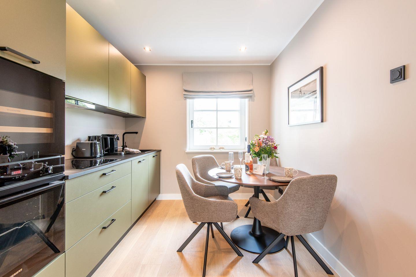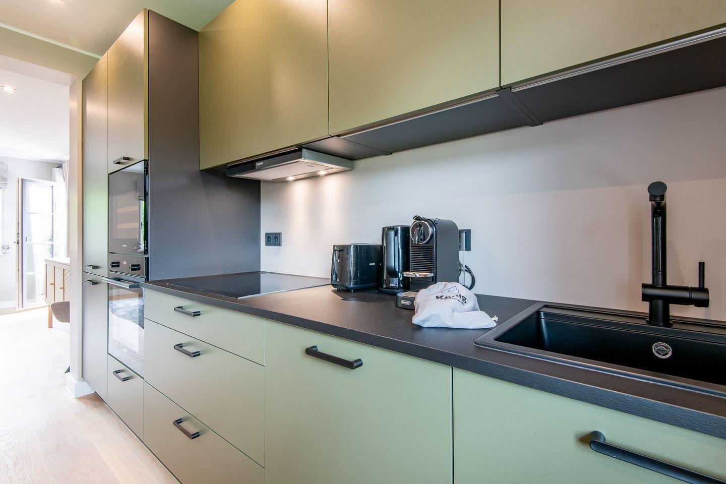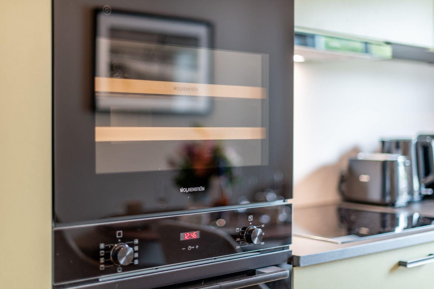 Die Wohnung besticht durch eine offene, moderne Küche, die perfekt ausgestattet ist. Hier können Sie gemeinsam mit Ihren Liebsten kochen und essen. Ausgestattet mit hochwertigen Geräten, darunter ein Herd, ein Backofen und eine Spülmaschine, macht die Küche das Zubereiten Ihrer Lieblingsgerichte zum Vergnügen.