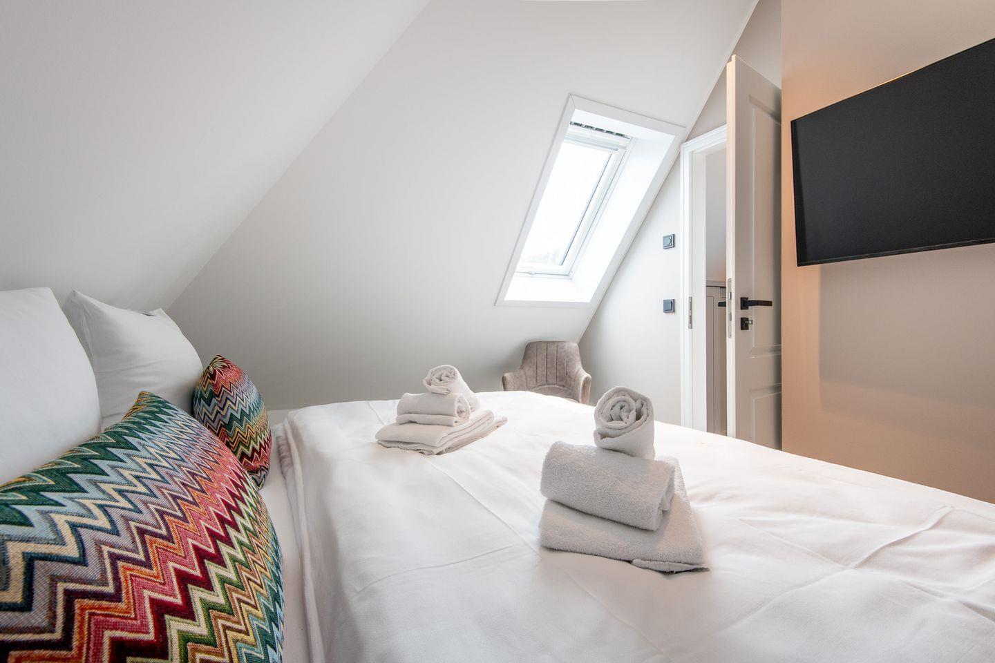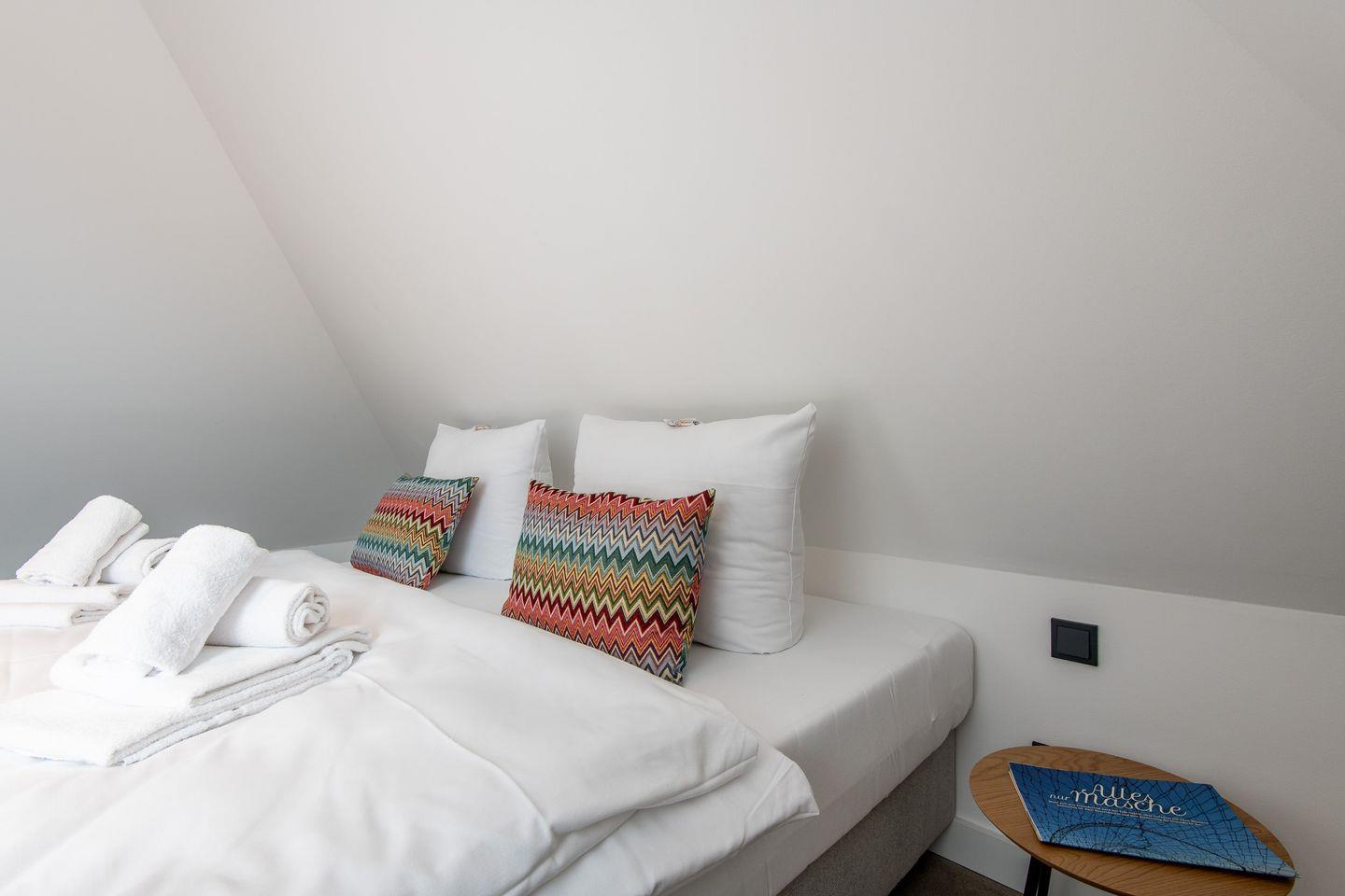 Das separate Schlafzimmer mit einem bequemen Boxspringbett garantiert erholsame Nächte. Die ruhige Atmosphäre sorgt für Entspannung nach einem Tag voller Inselerlebnisse. Für Ihre Kleidung steht Ihnen ein Einbauschrank im Nebenraum zur Verfügung.