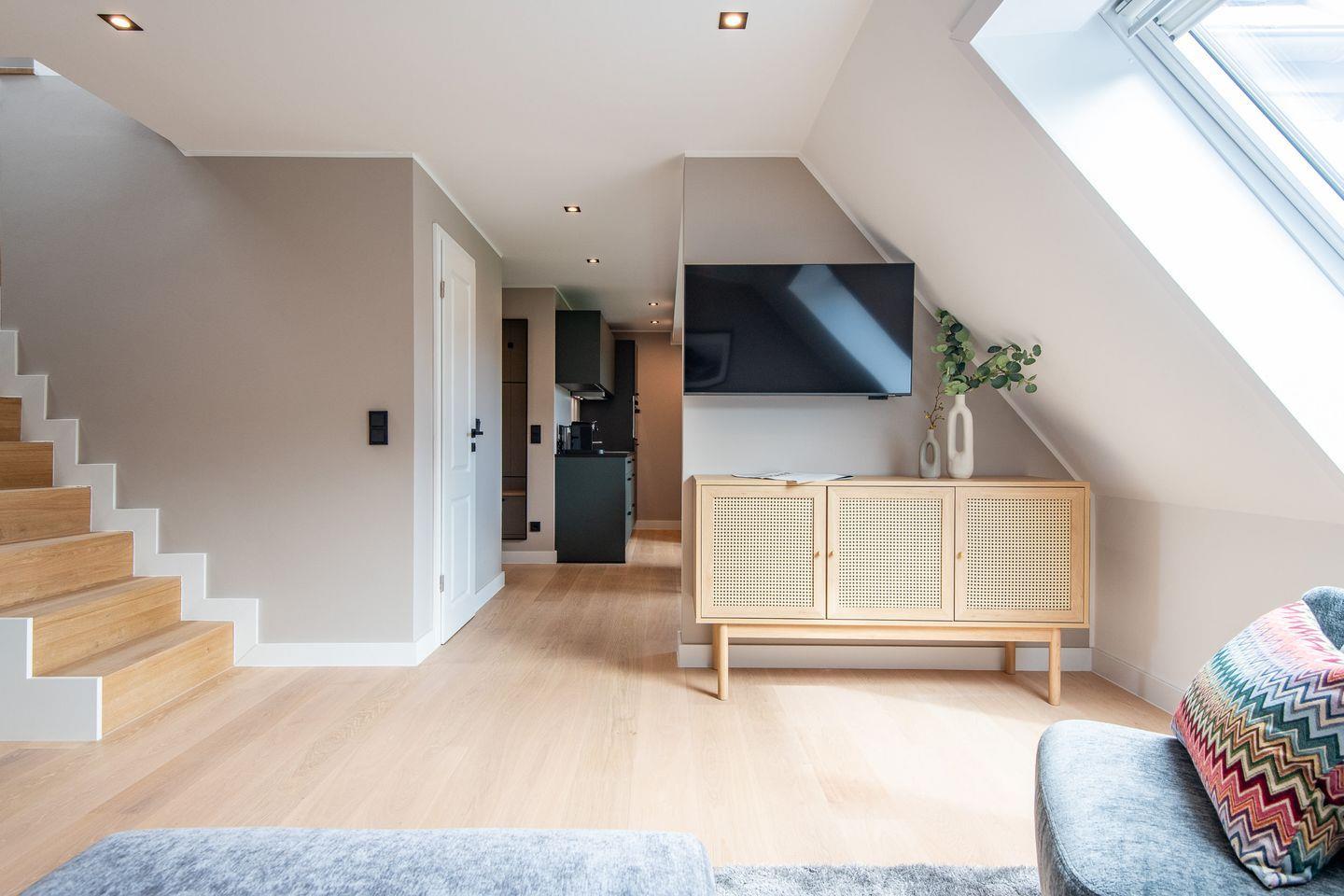 Der stilvolle Wohnbereich mit Parkettboden lädt mit einer bequemen Sofaecke und einem modernen TV zum Entspannen ein. Für zusätzlichen Komfort sorgt die Fußbodenheizung, die jeden Raum behaglich warm hält.