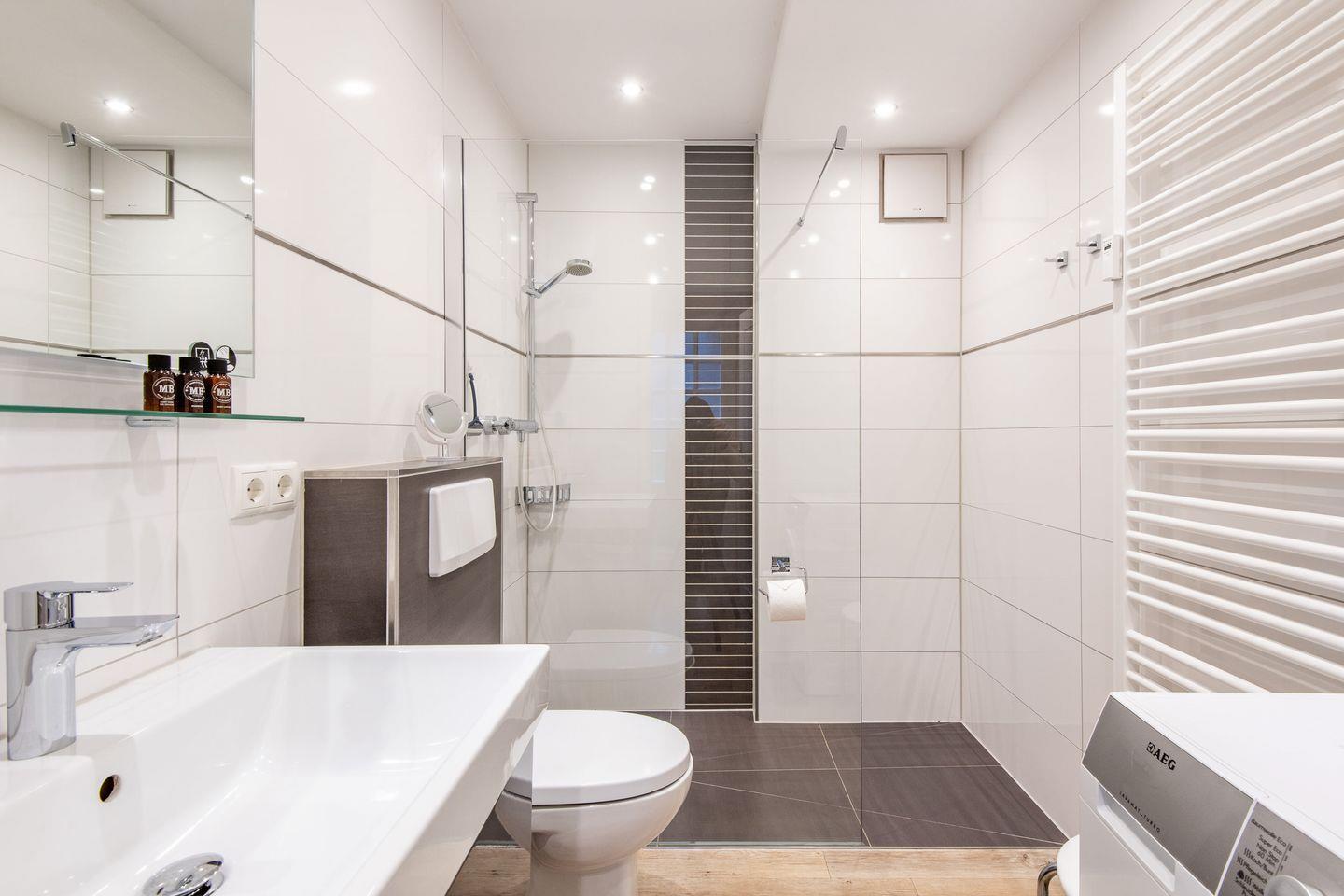 Das Badezimmer ist mit einer bodengleichen Dusche und einem WC ausgestattet. Ein Handtuchwärmer sorgt jederzeit für angewärmte Handtücher. Ein Fön steht Ihnen zur Verfügung, sodass Sie perfekt in den Tag starten können.