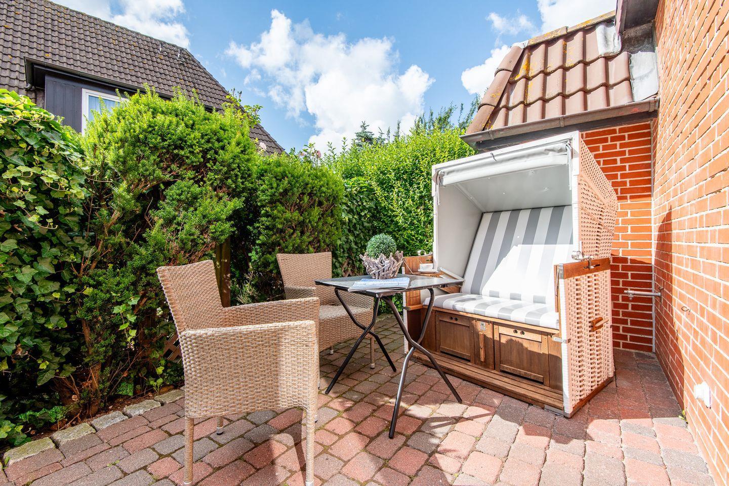 Auf der nach Westen ausgerichteten Terrasse können Sie den Tag gemütlich ausklingen lassen. Ein Strandkorb, ein Tisch mit zwei Stühlen und passende Auflagen laden zu gemütlichen Stunden an der frischen Luft ein.