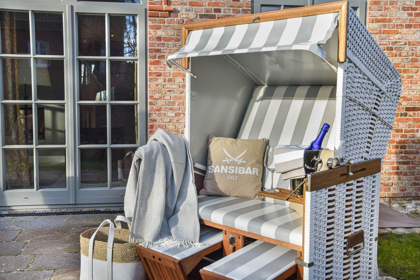 Der Garten ist ein Kapital für sich: Mit blühenden Hortensien, Friesenrosen und einem herrlichen Strandkorb für windgeschützte Lesestunden.