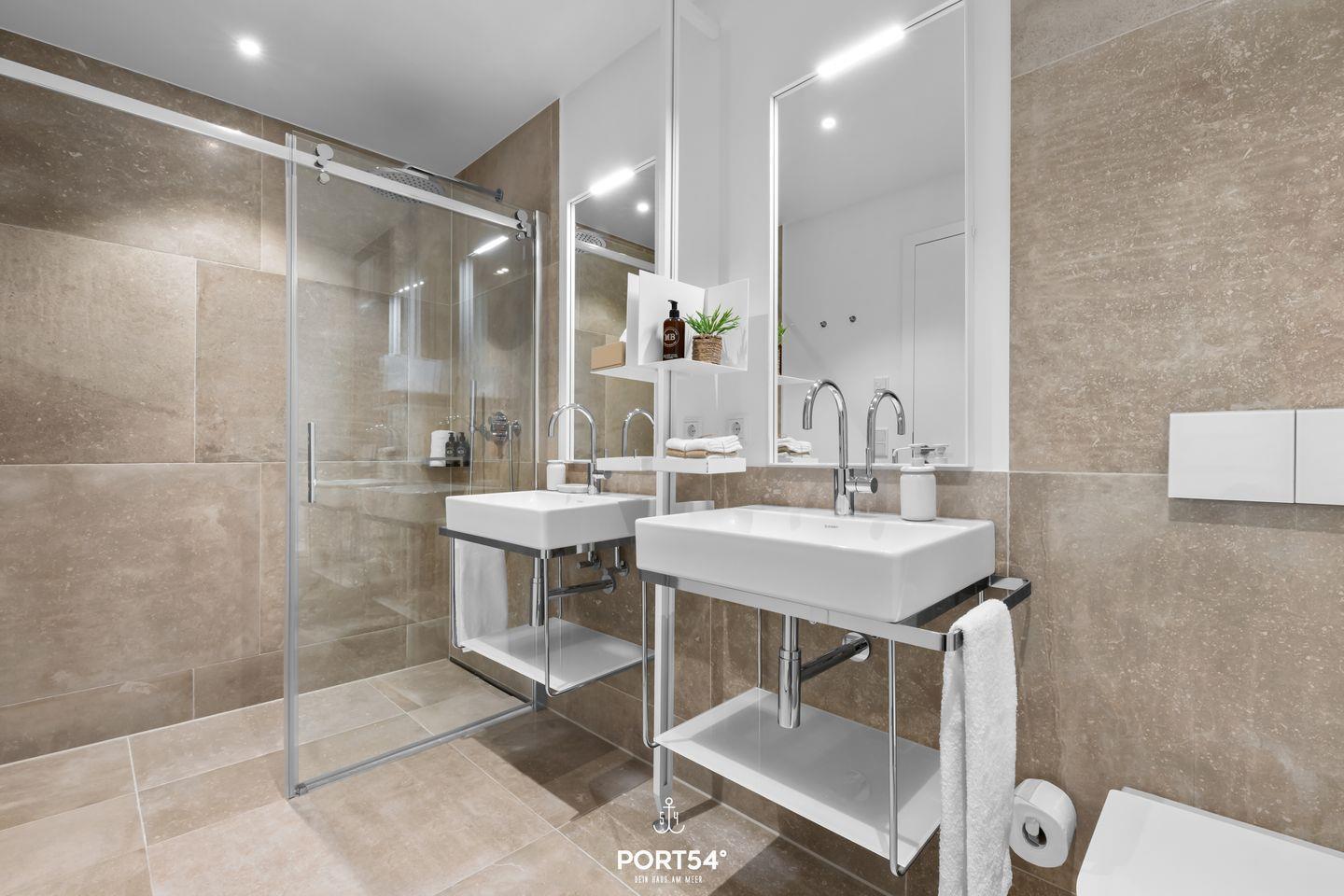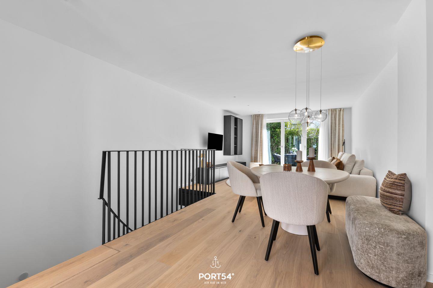 Großer Wohn- und Essbereich mit Sofa und Sessel sowie Esstisch mit vier Stühlen. Hochwertig eingerichtete, offene Küche mit Kühlschrank, Backofen und Herd. Zwei Schlafzimmer im Souterrain jeweils mit Doppelbett (200 x 200cm) und großem Schrank. Exklusives Master-Bad im Souterrain mit zwei Waschbecken, großer Regendusche und WC. Luxuriöse Holzterrasse mit Gartenmöbeln. Gäste-WC im Erdgeschoss.