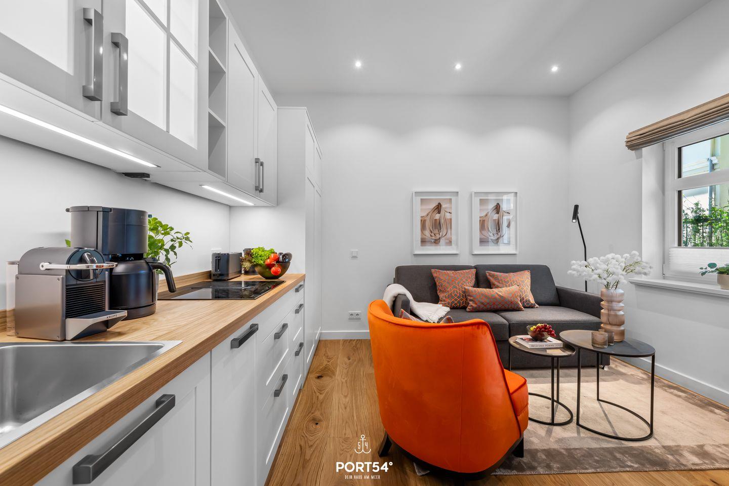 Mit einer großzügigen Grundfläche von 30 m² bietet die Ferienwohnung ausreichend Platz für bis zu zwei Personen. Die Räume sind geschmackvoll eingerichtet, und die offene Küche, die zum Wohnschlafbereich hin gestaltet ist, lädt dazu ein, kulinarische Köstlichkeiten zuzubereiten. Hier findest du alle notwendigen Geräte wie einen Elektro-Herd mit Induktionskochfeld, einen Backofen, eine Spülmaschine, einen Kühlschrank mit Gefrierfach sowie eine Filterkaffeemaschine und eine Nespressomaschine, die für deinen Genuss sorgen.