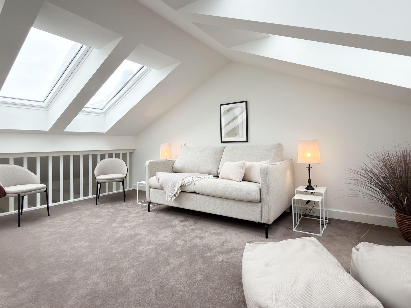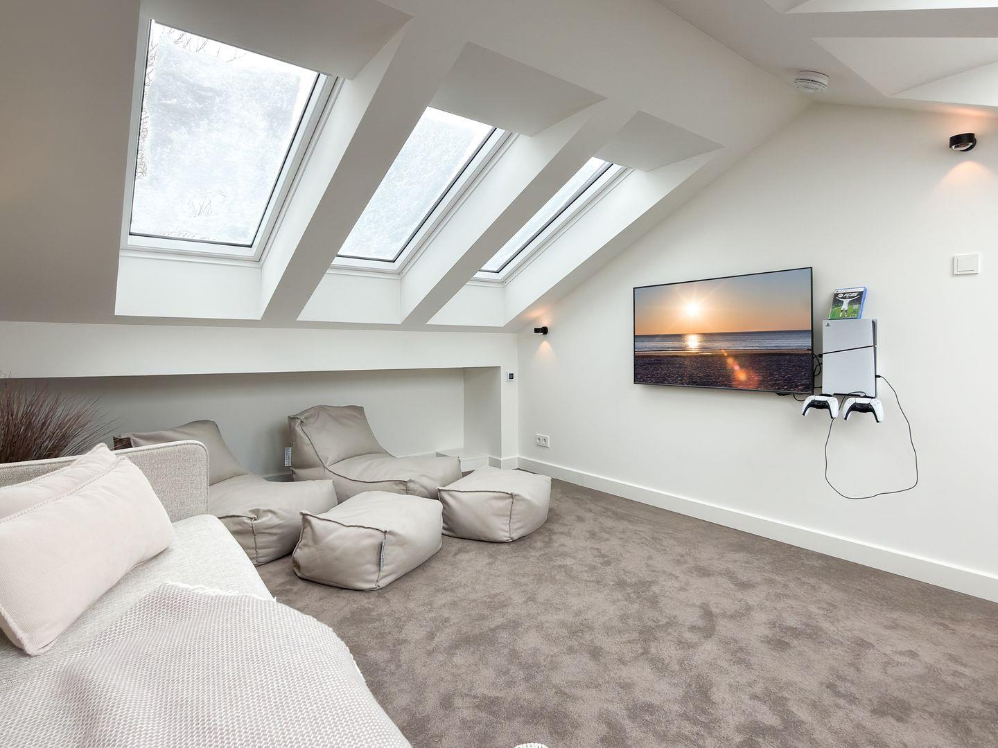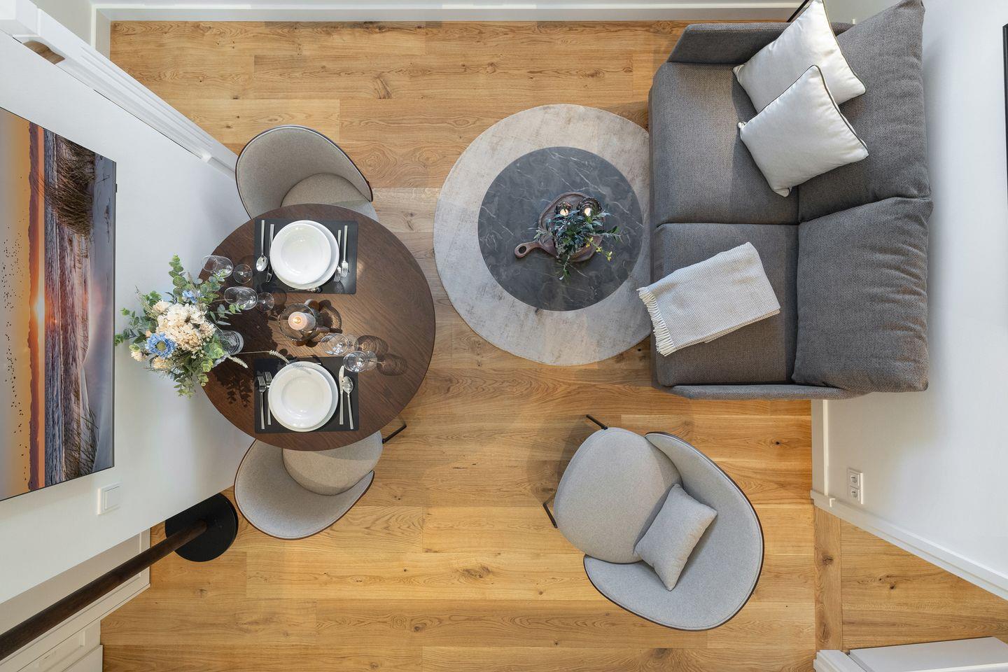 Mit einer großzügigen Grundfläche von 54 m² bietet die Ferienwohnung ausreichend Platz für bis zu 4 Personen (2 Erwachsene + 2 Kinder). Die lichtdurchfluteten Räume sind über zwei Etagen geschmackvoll eingerichtet, und die offene Küche, die zum Wohnzimmer hin gestaltet ist, lädt dazu ein, kulinarische Köstlichkeiten zuzubereiten. Hier findest du alle notwendigen Geräte wie einen Elektro-Herd mit Induktionskochfeld, einen Backofen, eine Spülmaschine, einen Kühlschrank mit Gefrierfach und vieles mehr. Das Schlafzimmer ist mit einem gemütlichen Doppelbett, einem Kleiderschrank vom Tischler, Verdunkelungsmöglichkeiten und einem Smart TV 43'' ausgestattet. In der zweiten Etage findest du für zwei Kinder oder einen Erwachsenen eine gemütliche Schlafcouch (140x200 cm), einen Smart TV mit 50'' und eine Sony Playstation mit 2 Controllern sowie FIFA für deine Unterhaltung.