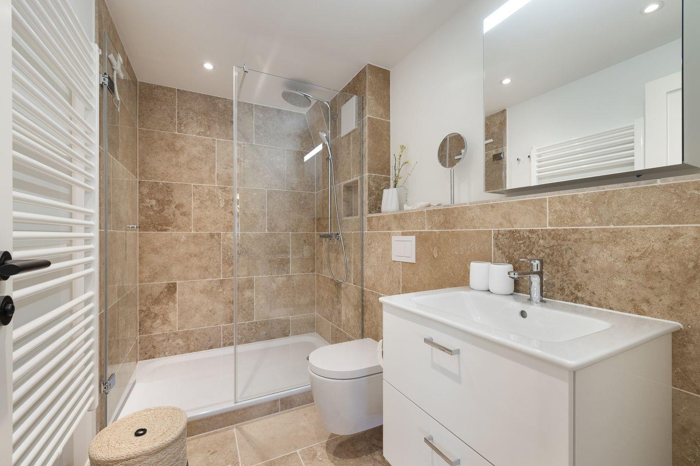 Im modernen Badezimmer findest du eine Rainshower-Dusche, WC, Föhn, Handtuchtrockner und Naturstein-Fliesen.