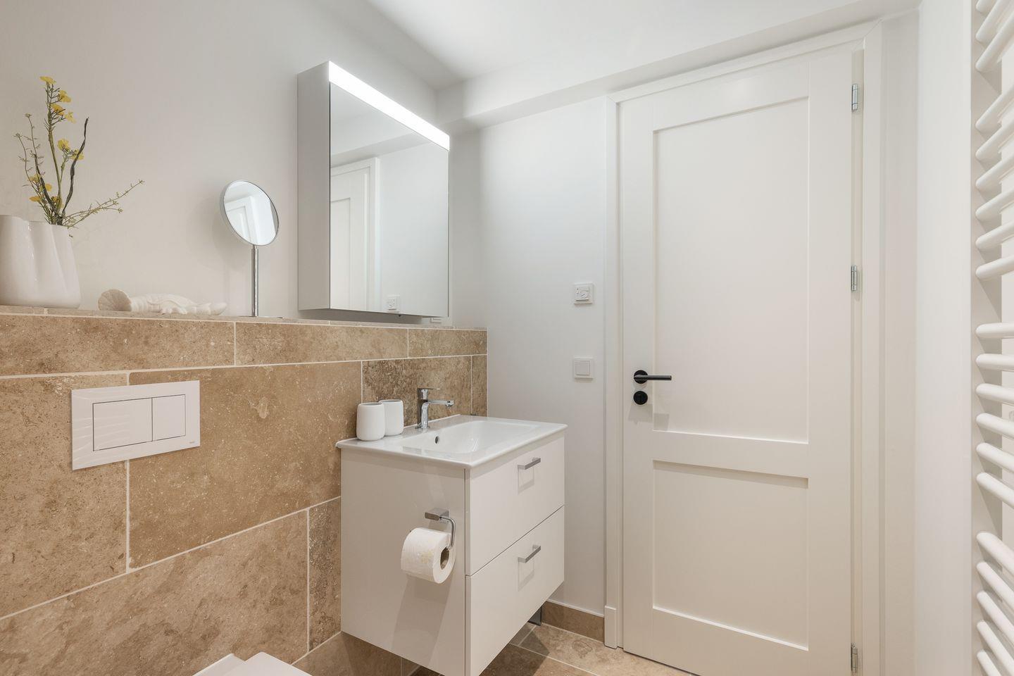 Im modernen Badezimmer finden Sie eine Rainshower Dusche, WC, Föhn, Handtuchtrockner und Naturstein-Fliesen.