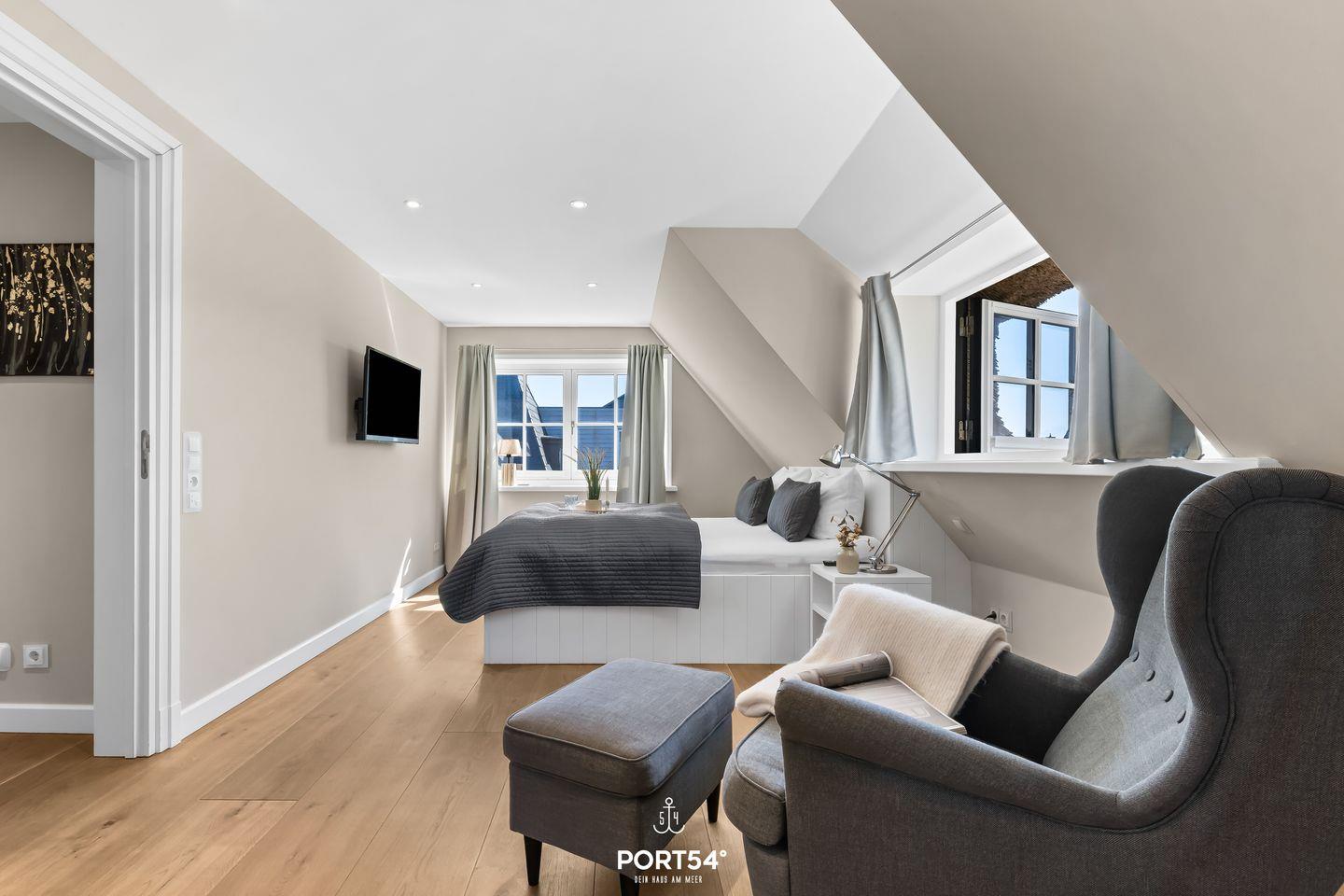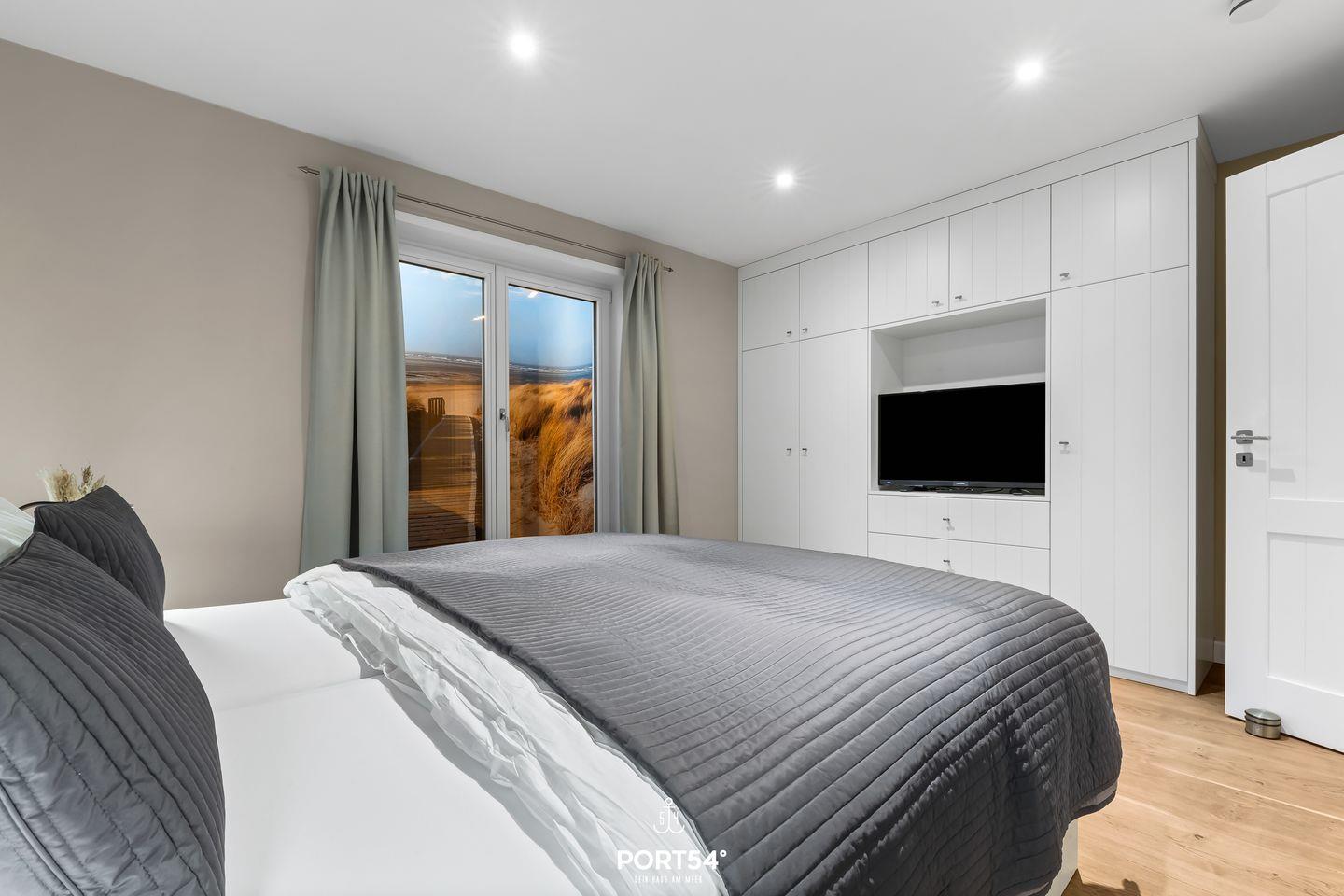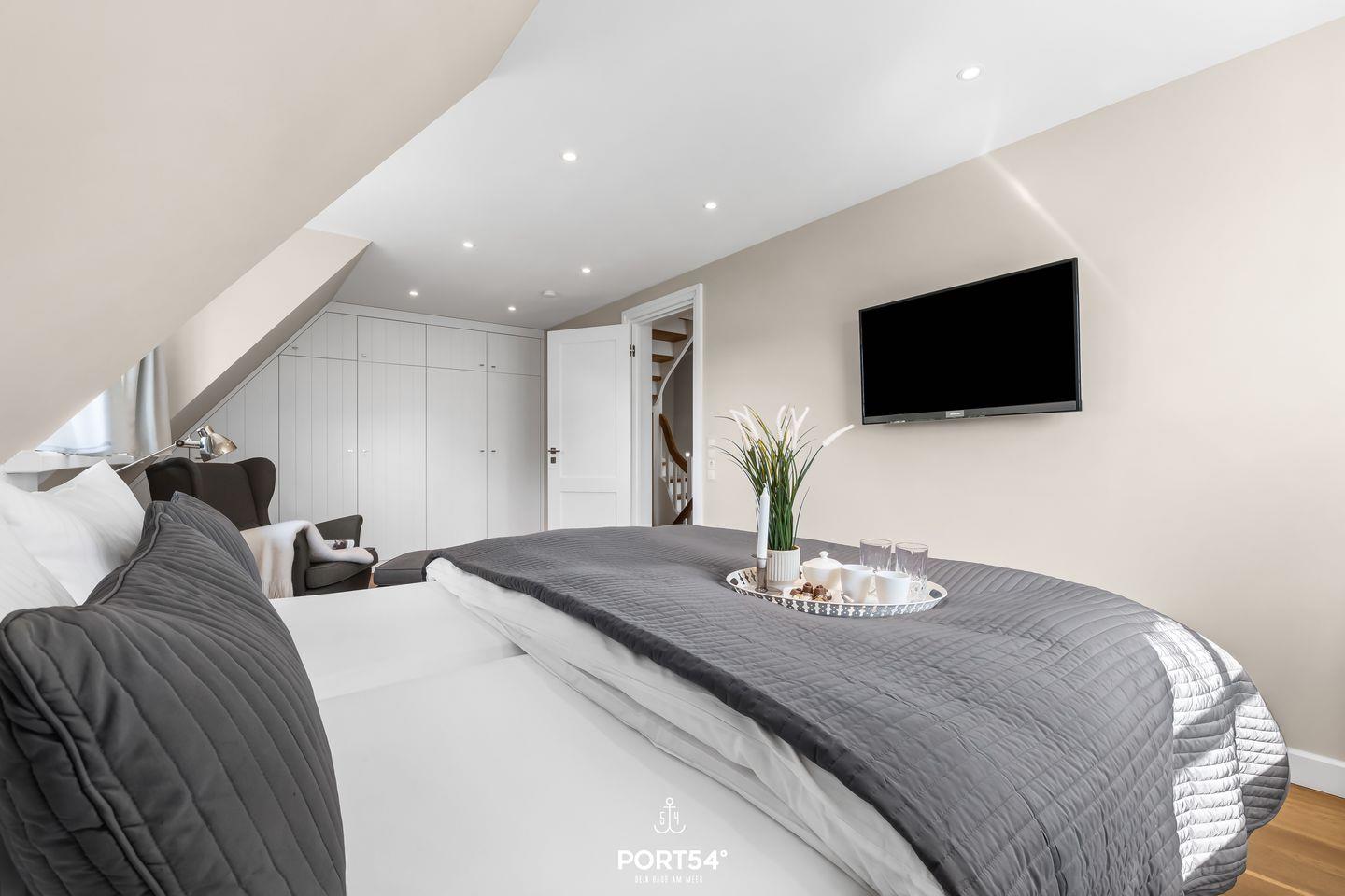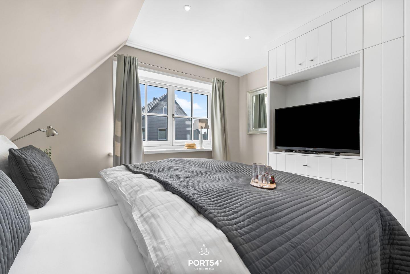 Drei der Schlafzimmer verfügen jeweils über ein Doppelbett (180x200 cm) und einen Flachbild-TV sowie Verdunkelungsmöglichkeiten, die für eine angenehme Nachtruhe sorgen. Ein weiteres Schlafzimmer ist mit 2 Einzelbetten ausgestattet, ideal für die kleinen Gäste. Für diese bieten wir auch ein Kinderbett und einen Hochstuhl an.