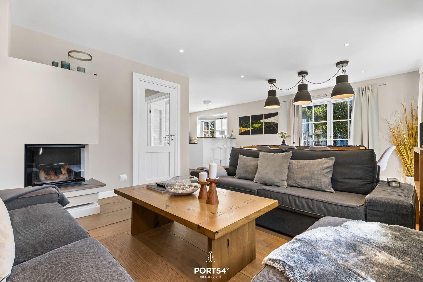 Im Erdgeschoss findest du das Gäste-WC, eine offene Küche und den gemütlichen Wohnbereich mit Kamin und direktem Zugang zur Terrasse und zum Garten. Lass den Tag nach einem langen Spaziergang vor dem Kamin ausklingen oder lehne dich im Strandkorb zurück und genieße den Gartenblick und die Ruhe.