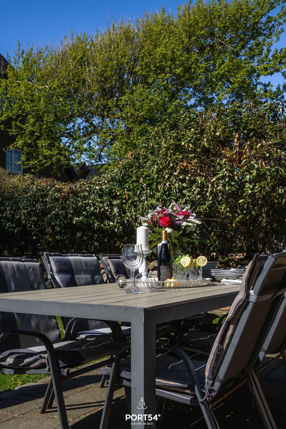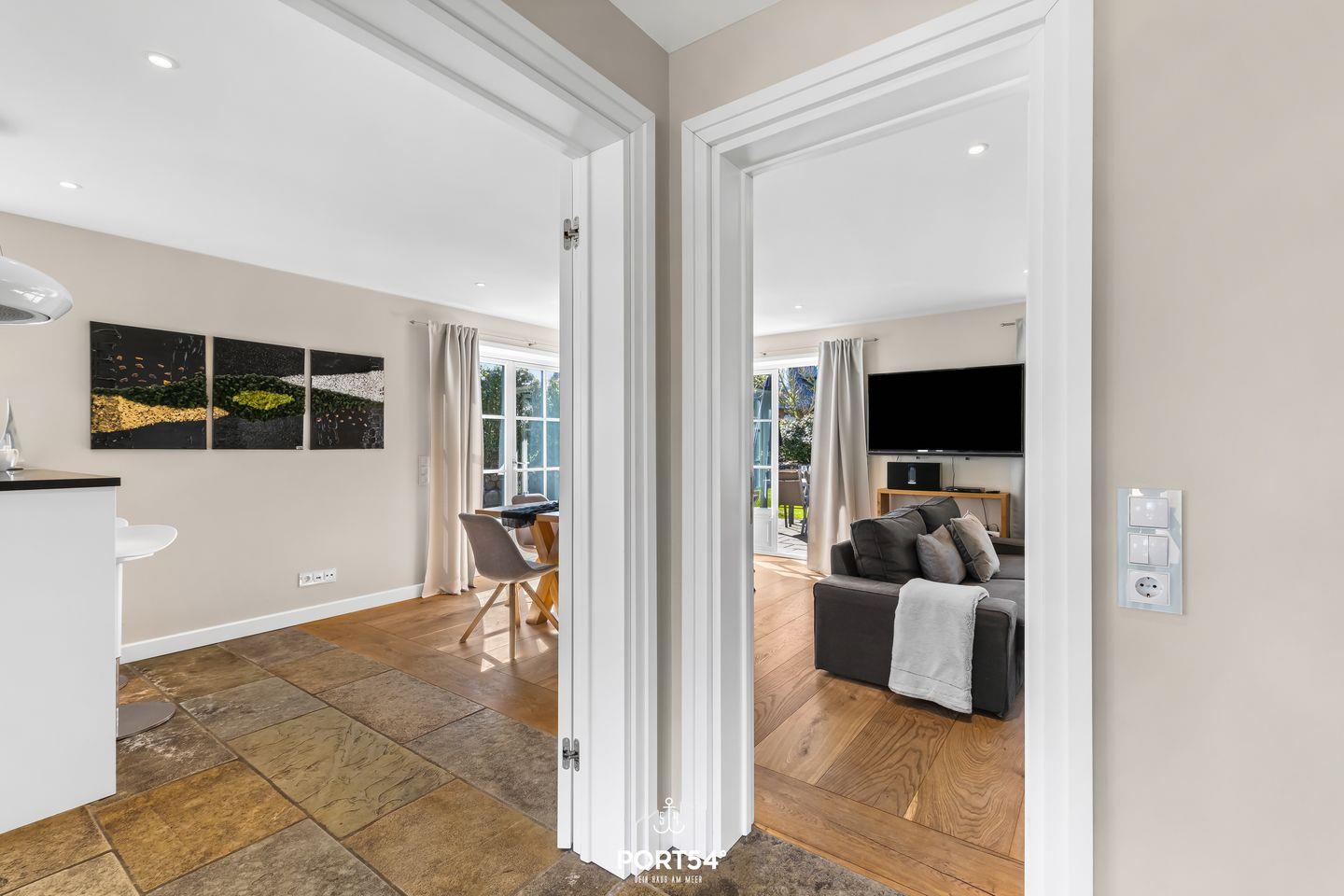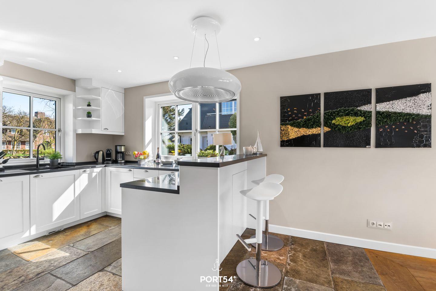 Die offene Küche zum Wohnzimmer ist perfekt für gesellige Abende. Sie ist vollständig ausgestattet und verfügt über hochwertige Geräte, darunter ein Cerankochfeld, einen Elektrobackofen, eine Spülmaschine und einen Kühlschrank mit separatem Gefrierschrank. Genieße deine Mahlzeiten im eleganten Essbereich oder im Freien auf der Terrasse, die Gartenblick bietet und dir die Möglichkeit gibt, die frische Luft von Sylt in vollen Zügen zu erleben.