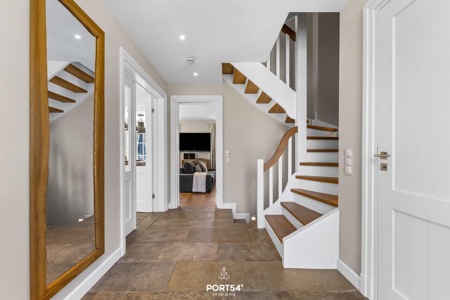 Im Erdgeschoss befindet sich das Gäste-WC, eine offene Küche und der gemütliche Wohnbereich mit Kamin und direktem Zugang zur Terrasse und zum Garten. Lassen Sie den Tag nach einem langen Spaziergang vor dem Kamin ausklingen oder lehnen sich im Strandkorb zurück und genießen den Gartenblick und die Ruhe.