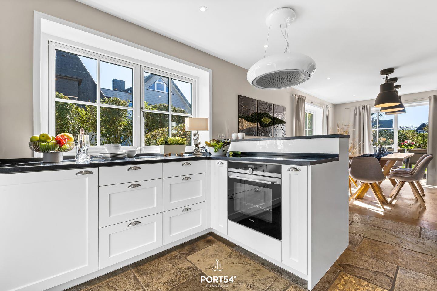 Die offene Küche zum Wohnzimmer ist perfekt für gesellige Abende. Sie ist vollständig ausgestattet und verfügt über hochwertige Geräte, darunter ein Cerankochfeld, einen Elektrobackofen, eine Spülmaschine und einen Kühlschrank mit einem separaten Gefrierschrank. Genießen Sie Ihre Mahlzeiten im eleganten Essbereich oder im Freien auf der Terrasse, die Gartenblick bietet und Ihnen die Möglichkeit gibt, die frische Luft Sylt's in vollen Zügen zu erleben.