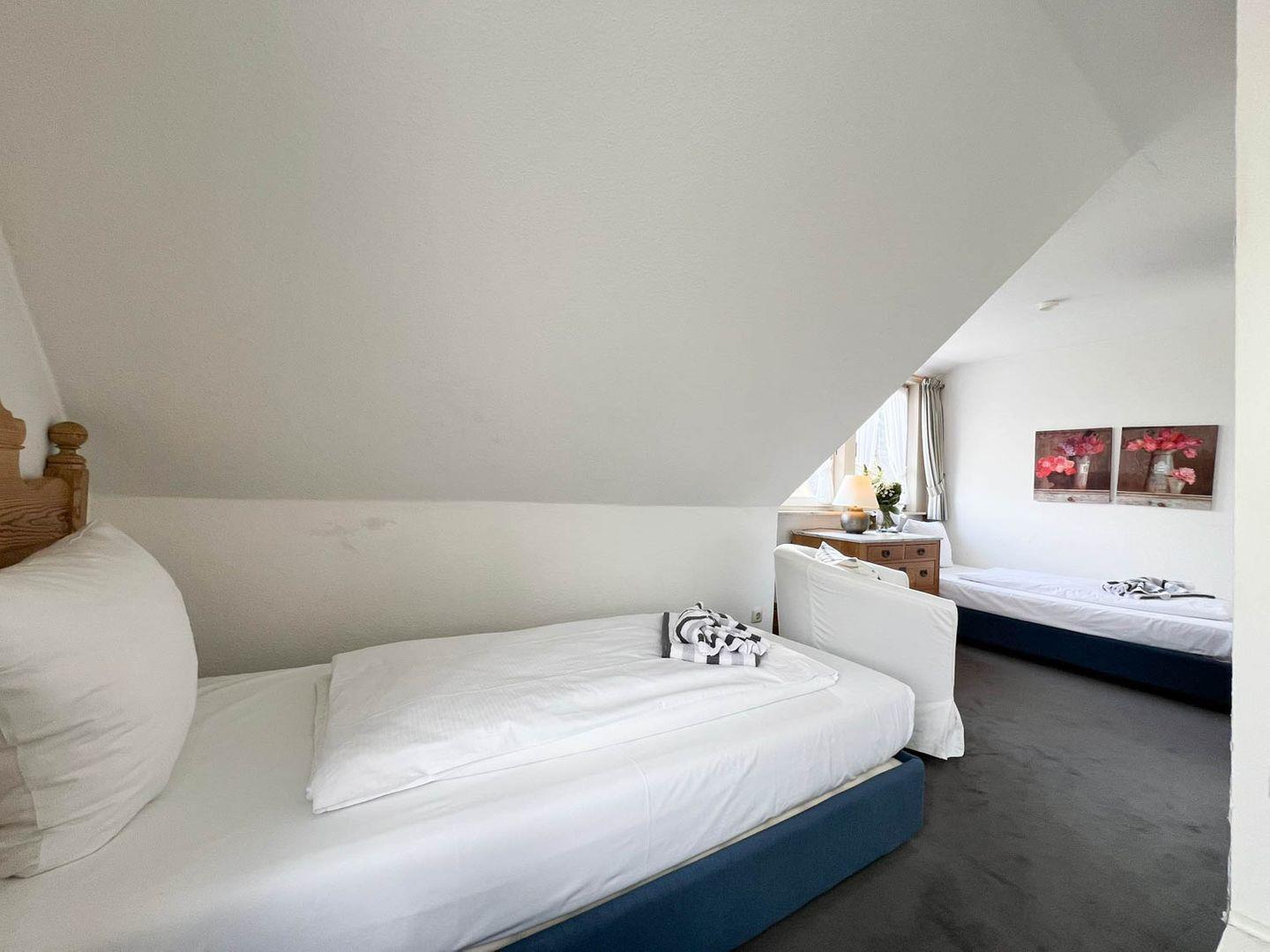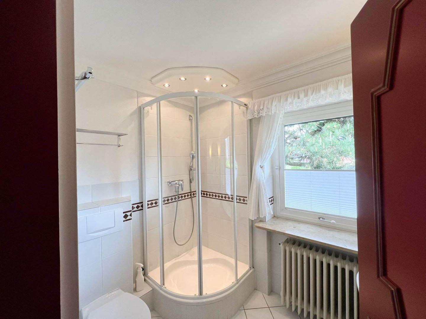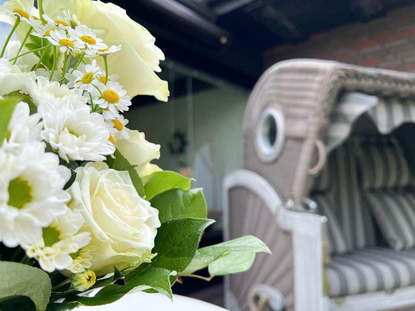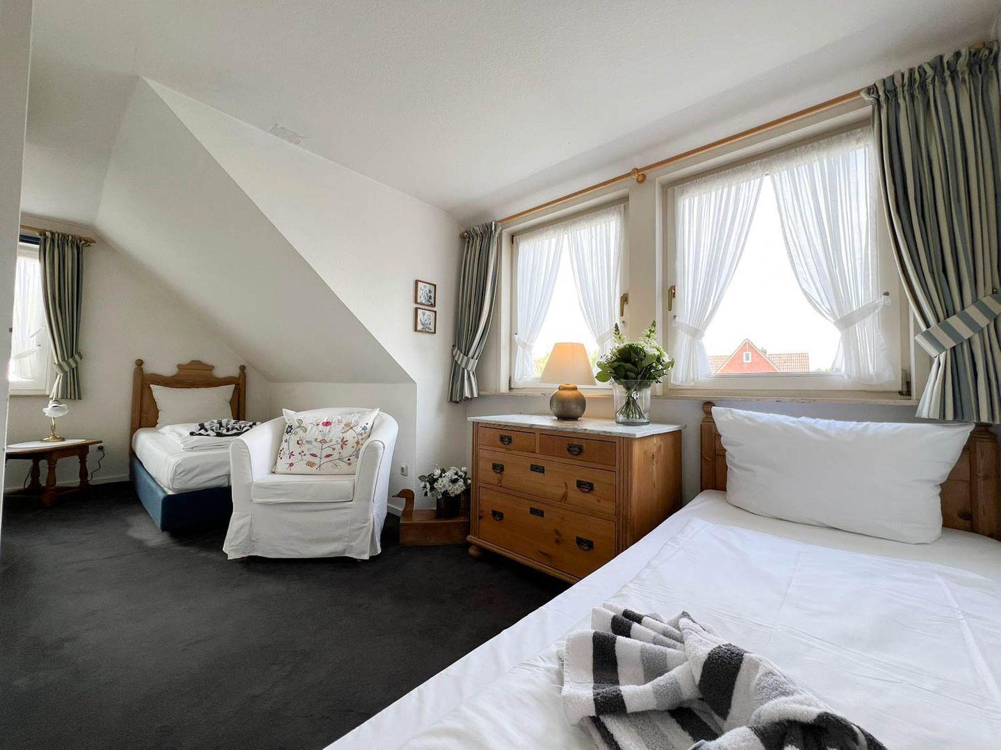 Neben einem großen Wohnraum mit Couch, Sesseln, Schrank, Esstisch, Kabel-TV, W-LAN und Südterrasse mit Strandkorb und Gartenmöbeln finden Sie im Dachgeschoss 2 Schlafzimmer mit einem Doppelbett und 2 Einzelbetten. Die Küche ist natürlich komplett eingerichtet mit Ceran-Kochfeld, Backofen, Kühlschrank, Geschirrspüler, Kaffeemaschine, Toaster und Wasserkocher. Im Erdgeschoss befindet sich unser luxuriöses und geräumiges Badezimmer.