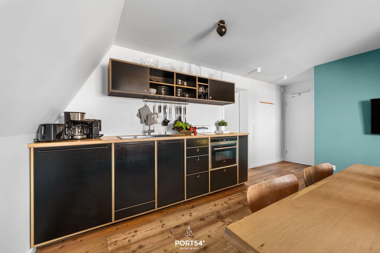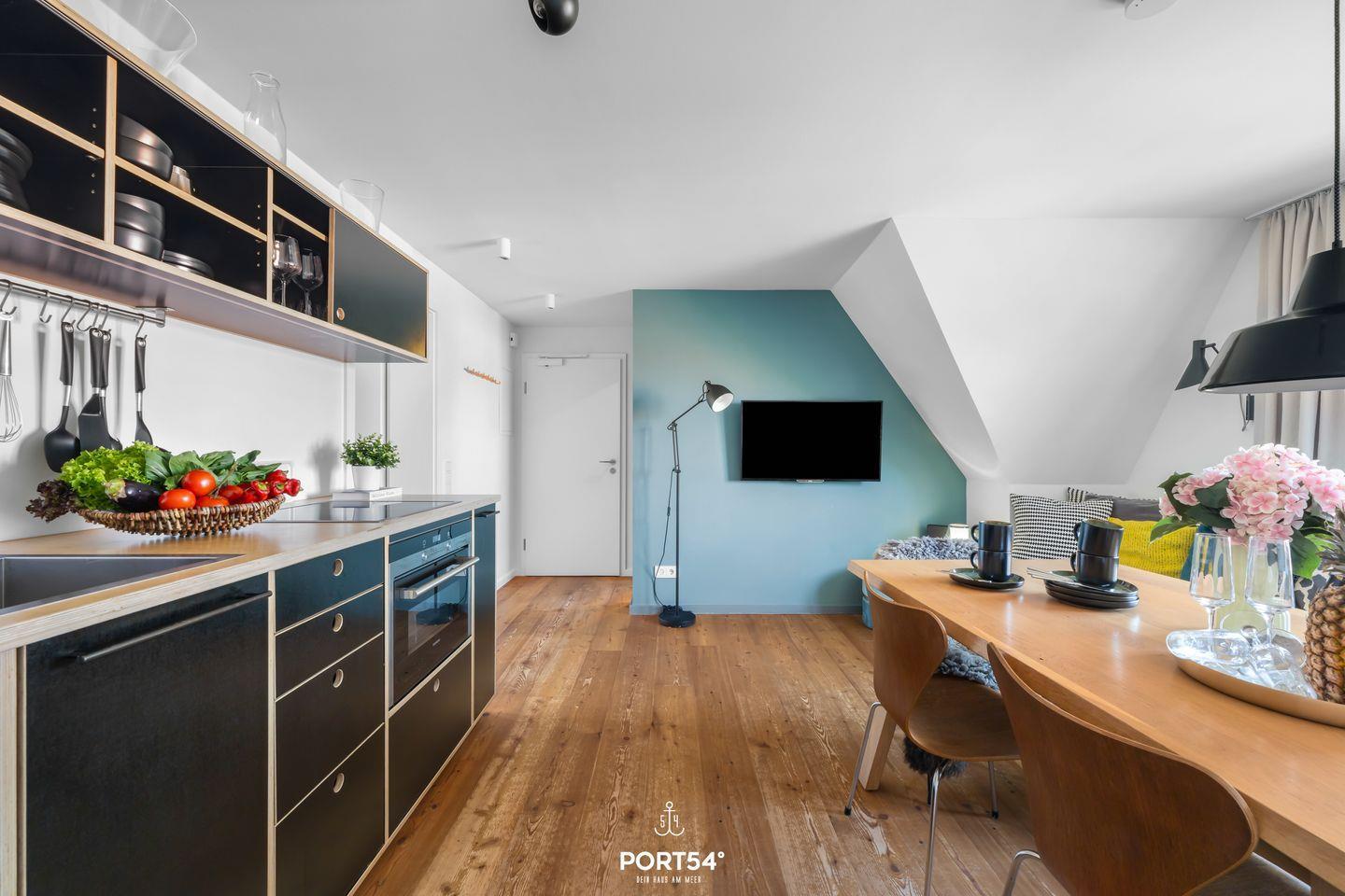 Auf 44?m² (Sylter Maß) Wohnfläche bietet die „Grüne Ella“ Platz für bis zu 3 Personen (2 Erwachsene + 1 Kind), Die Wohnung verfügt über ein Schlafzimmer mit gemütlichem Doppelboxspringbett (180x200 cm), einem Smart TV und Verdunkelungsmöglichkeiten. Außerdem befindet sich im Schlafzimmer noch eine gemütliche Matratze für unsere kleinen Gäste. Die moderne vollausgestattete Küche ist unter anderem mit Herd, Backofen, Kühlschrank, Geschirrspüler und Mikrowelle ausgestattet und liegt offen zum Wohnbereich. Der Wohnbereich bietet eine großzügige Lounge Bank, hier können Sie als Familie die Seele baumeln lassen. Das stilvolle Vollbad lädt mit seiner schlichten Eleganz zum Entspannen ein.