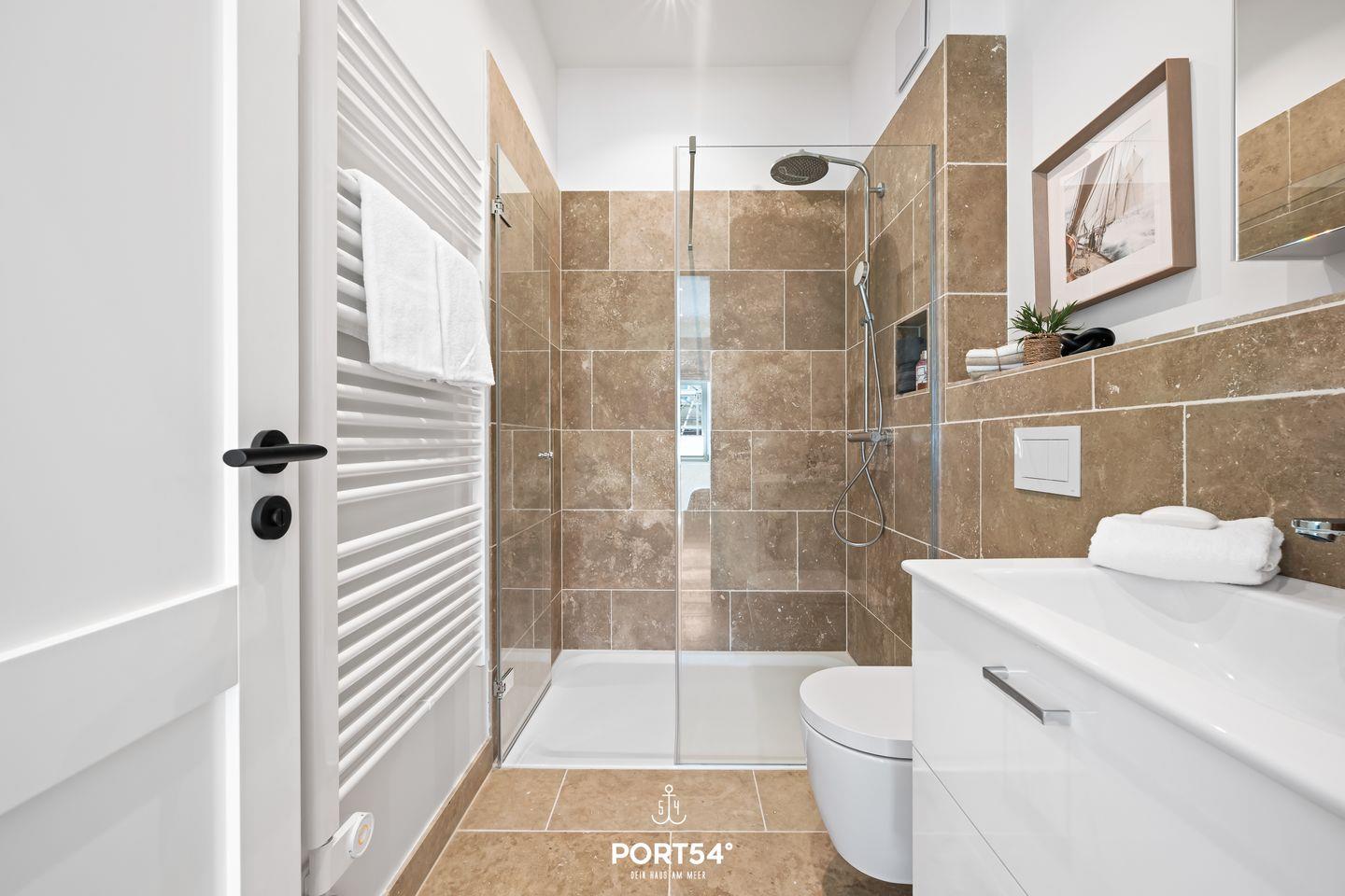 Im modernen Badezimmer findest du eine ebenerdige Dusche, ein WC, einen Föhn, einen Handtuchtrockner und Natursteinfliesen.