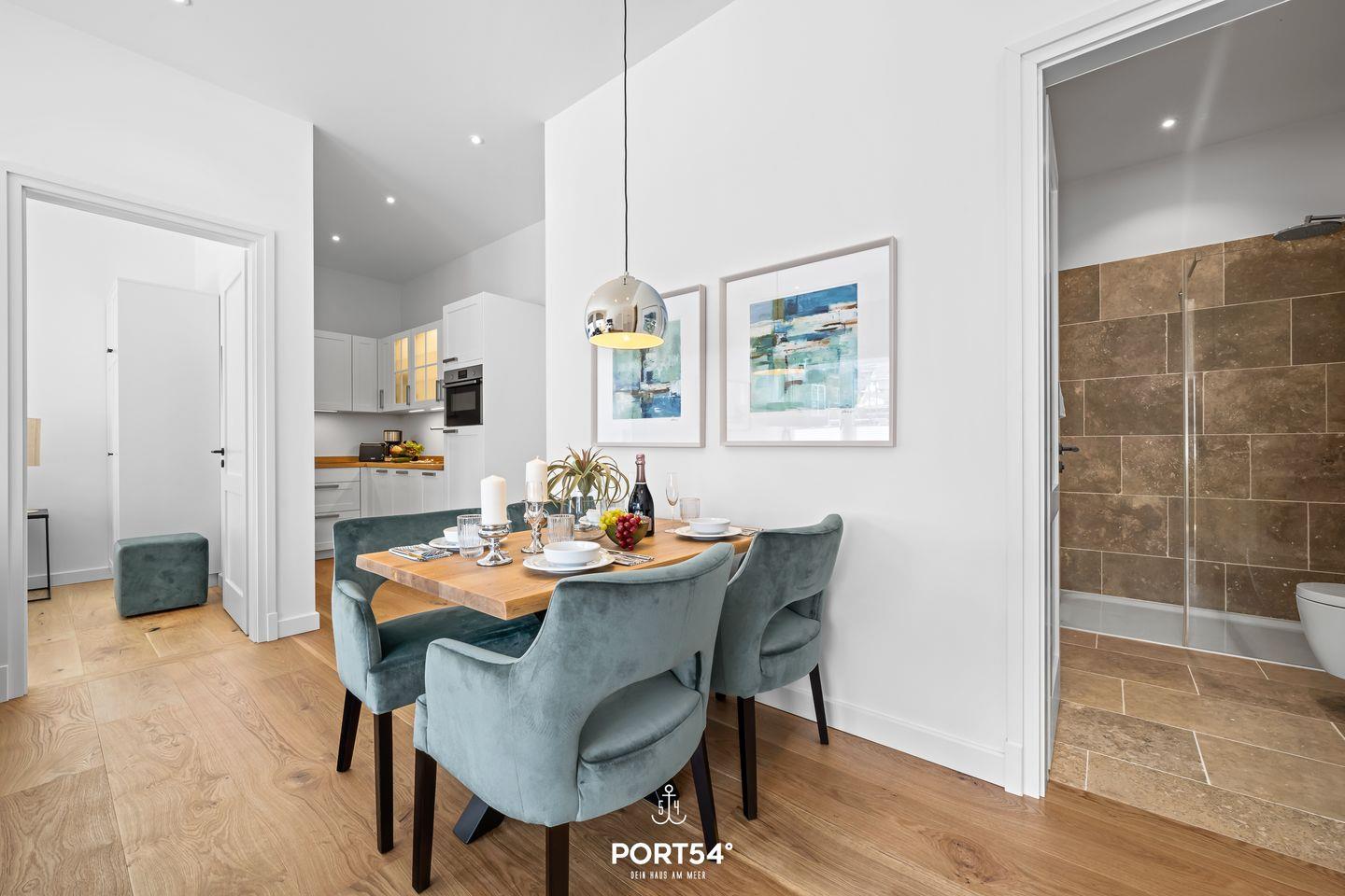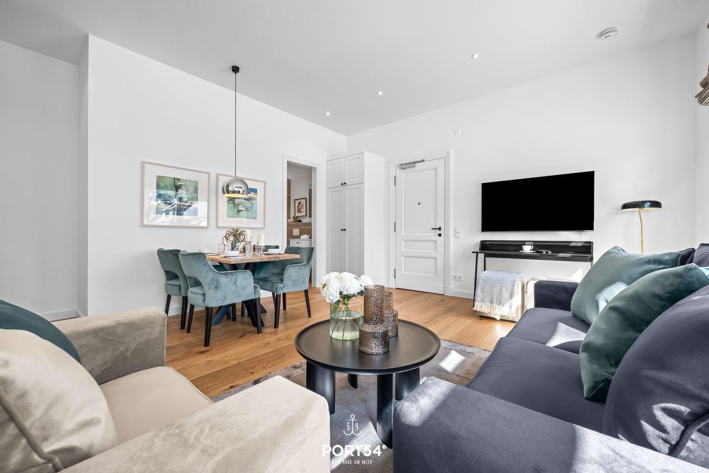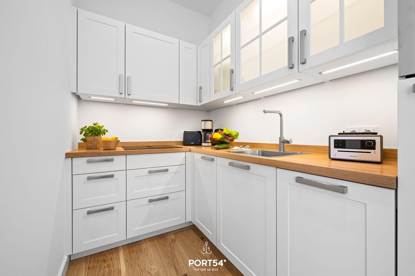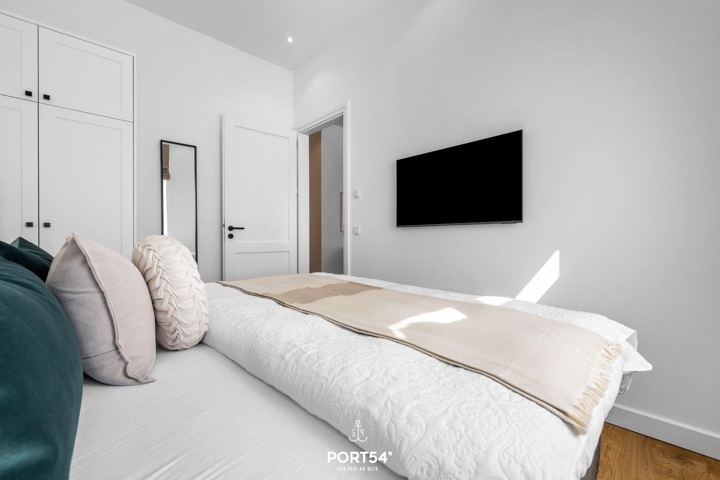 Mit einer großzügigen Grundfläche von 45 m² bietet die im Erdgeschoss gelegene Ferienwohnung ausreichend Platz für bis zu vier Personen. Die lichtdurchfluteten Räume sind geschmackvoll eingerichtet, und die offene Küche, die zum Wohnzimmer hin gestaltet ist, lädt dich dazu ein, kulinarische Köstlichkeiten zuzubereiten. Hier findest du alle notwendigen Geräte wie einen Elektroherd mit Induktionskochfeld, einen Backofen, eine Spülmaschine, einen Kühlschrank mit Gefrierfach und vieles mehr. Das Schlafzimmer ist mit einem gemütlichen Doppelbett, Verdunkelungsmöglichkeiten und einem Smart-TV ausgestattet. Einen weiteren Schlafplatz bietet dir die gemütliche Schlafcouch (160 x 200 cm).