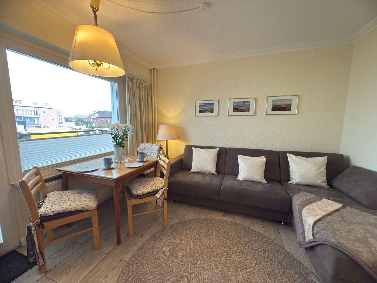 Modernes 2-Zimmer-Appartement mit Südbalkon, Hallenschwimmbad und Sauna in Westerland, ideal für bis zu 3 Personen.