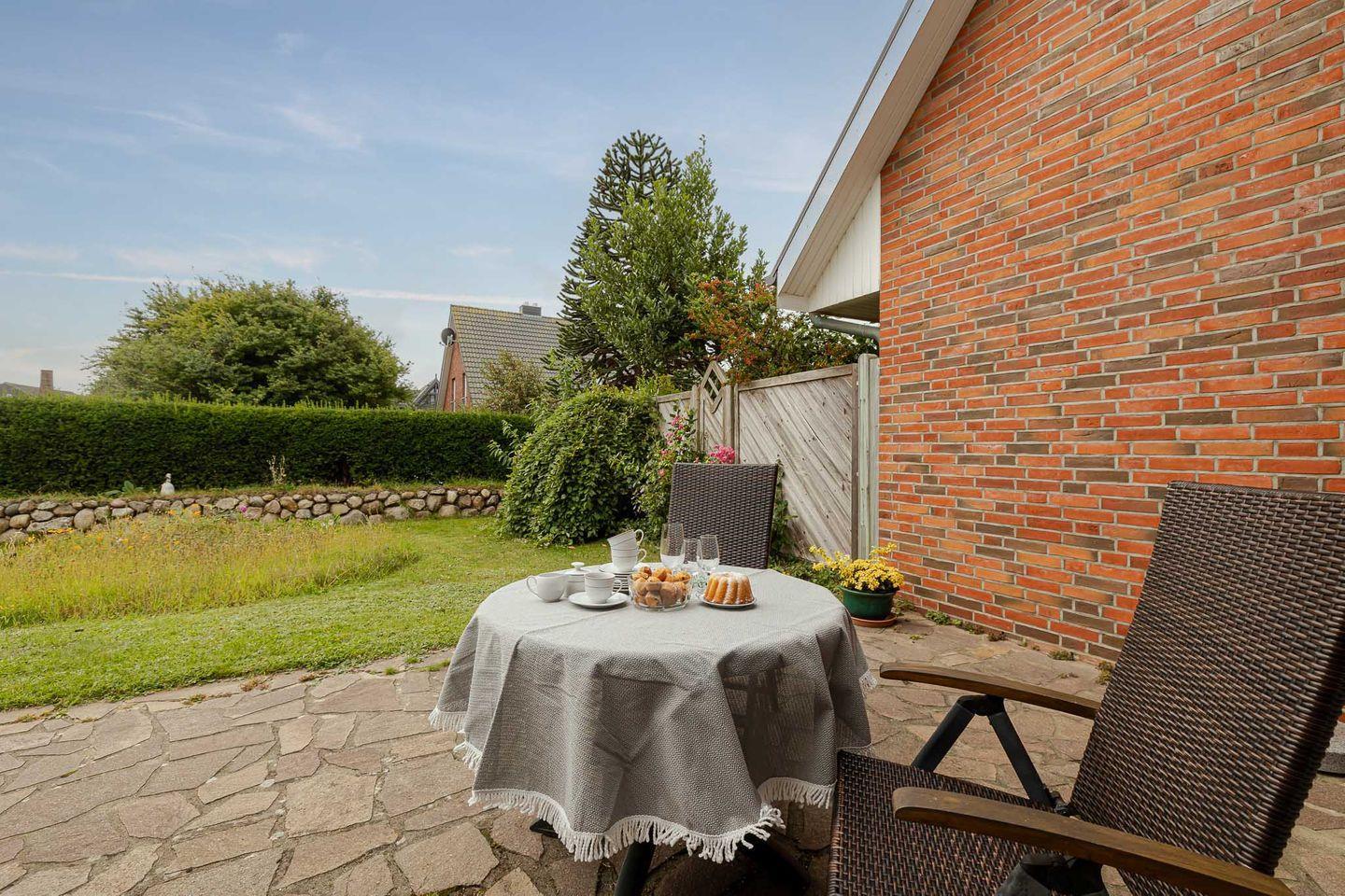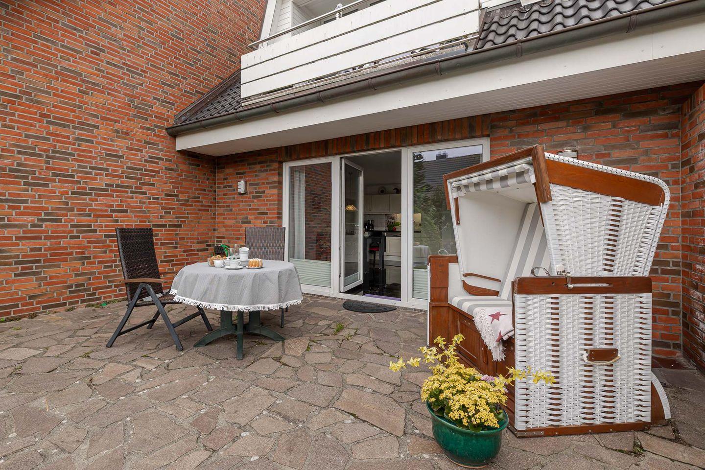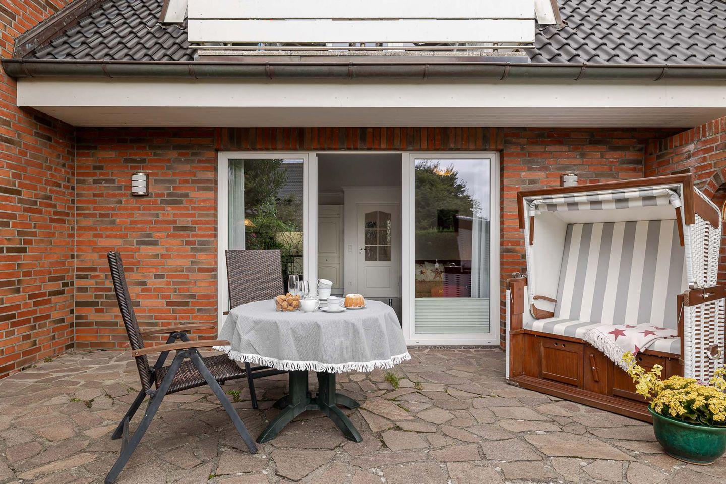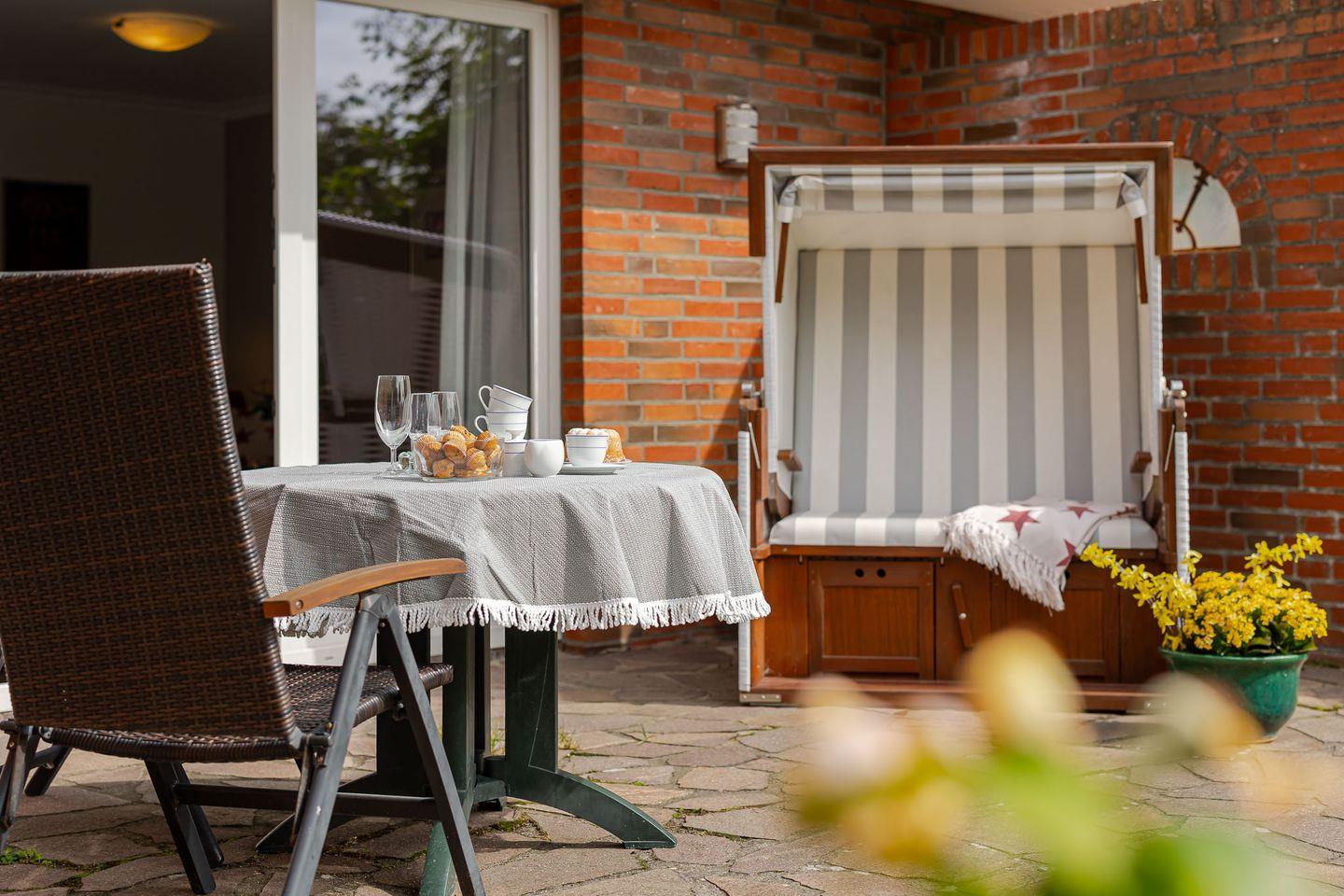 Moderne Ferienwohnung Muschel auf Sylt mit Terrasse, Strandkorb und Fußbodenheizung für entspannten Urlaub zu zweit.