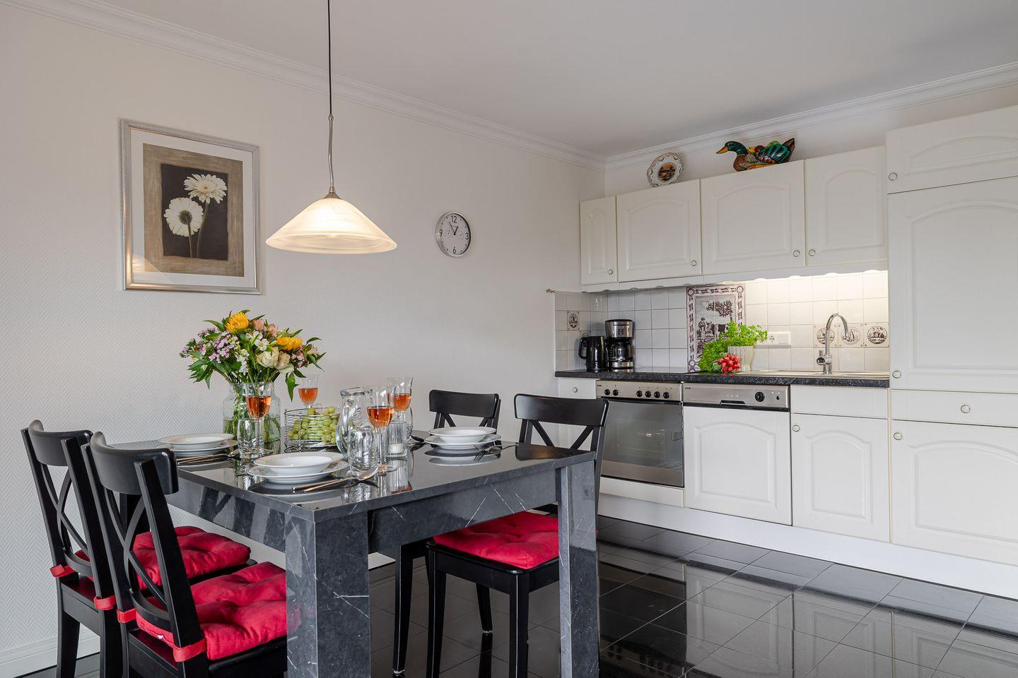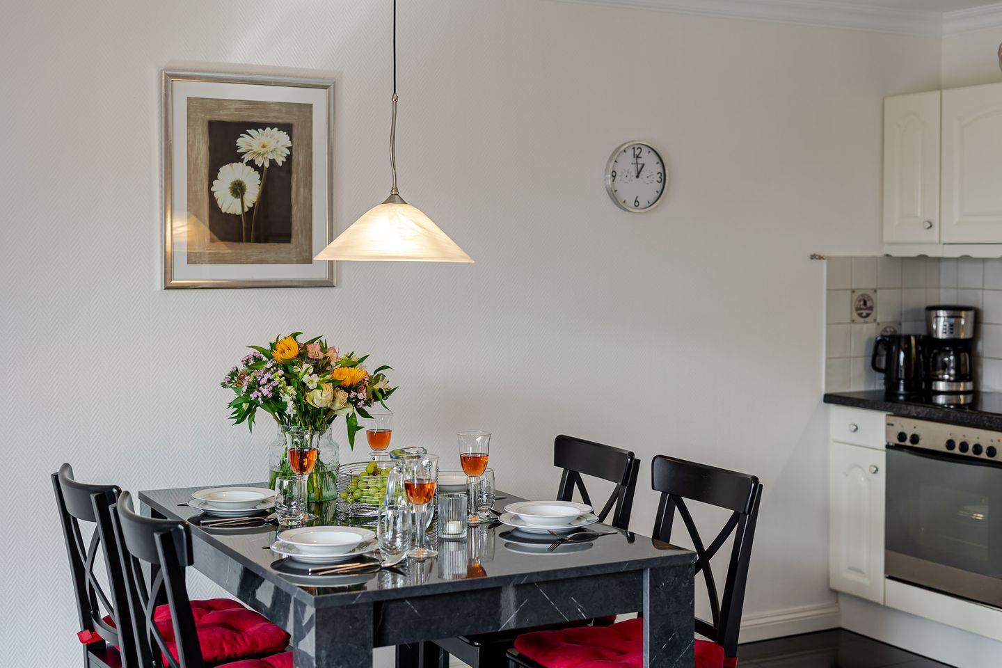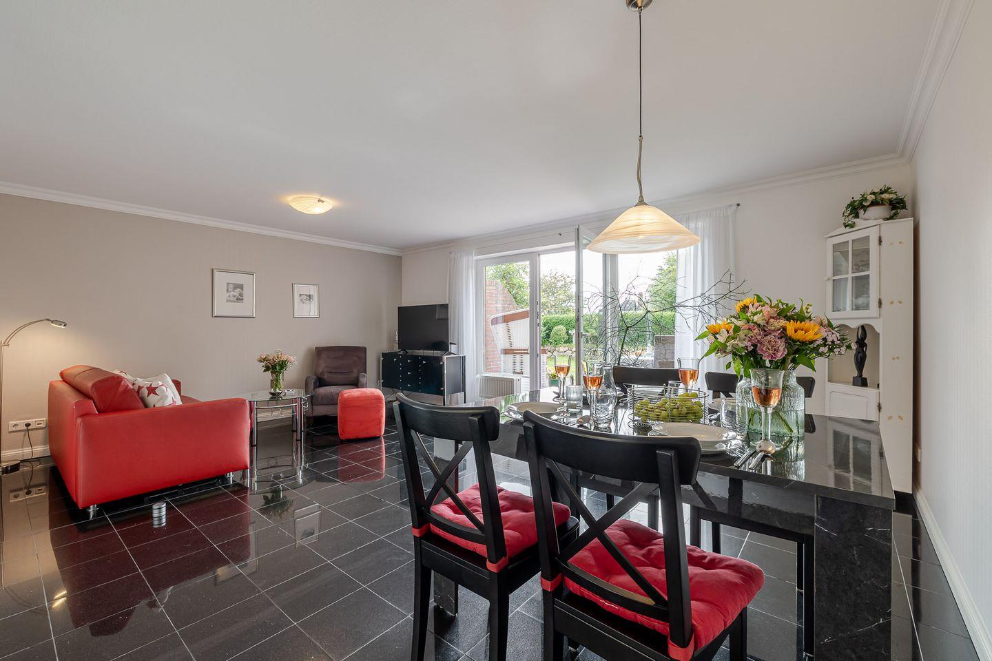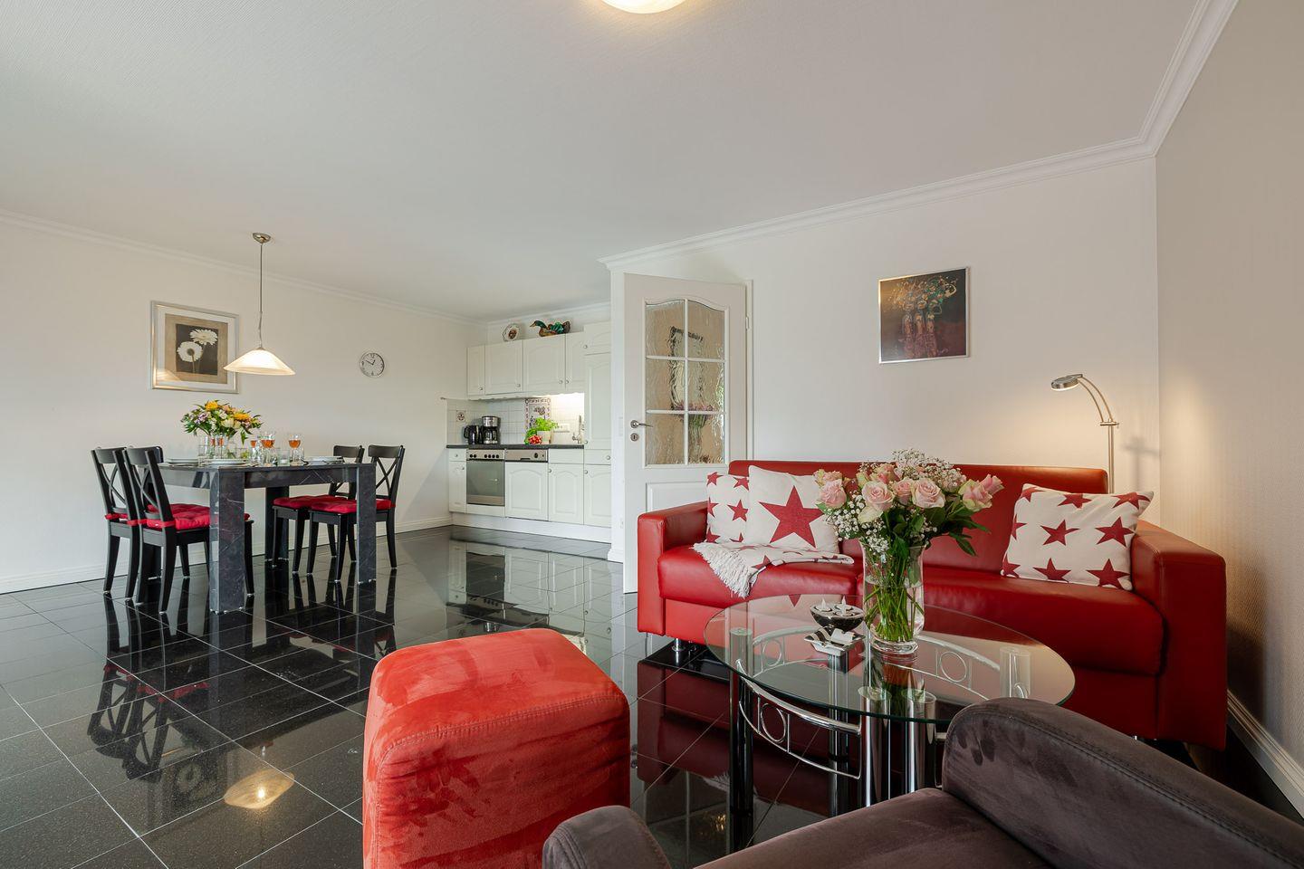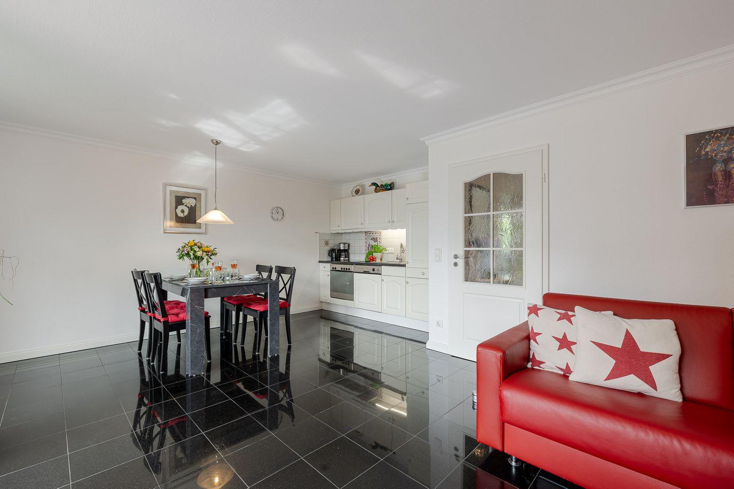 Im Wohnzimmer erwarten Sie ein Kabel-TV und eine Musikanlage für entspannte Stunden. Die Couch im Wohnbereich lässt sich bei Bedarf zu einem Doppelbett umfunktionieren und sorgt so für zusätzliche Flexibilität. Die möblierte Südterrasse mit eigenem Strandkorb ist das Herzstück der Wohnung – hier können Sie die Sylter Sonne und die frische Meeresbrise in vollen Zügen genießen.