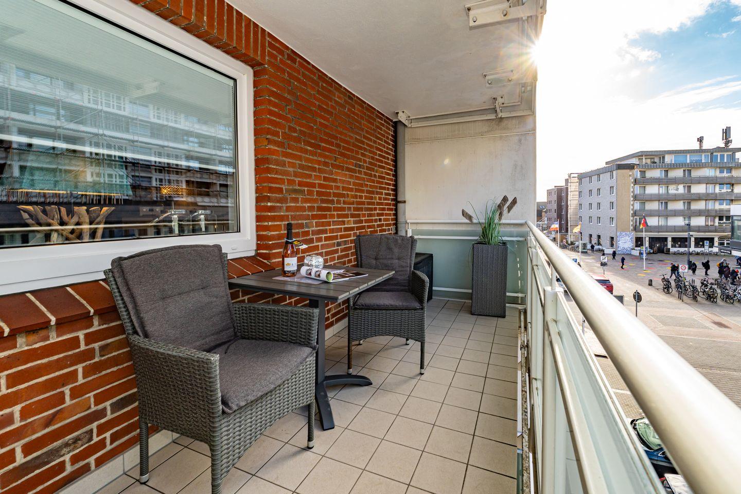 Dünenkoje App. 205 ist ein 30 m² großes 1-Zimmer-Appartement im 2. Stock (Aufzug) für 2 Personen – nur 100 m bis Strand und Meer, zentral in der Stadt. Offene Küche zum Wohnbereich mit Cerankochfeld, Spülmaschine, Mikrowelle und Nespresso. Überdachter Balkon mit Gartenmöbeln und Strandkorb. WLAN/TV, Erstausstattung, Bettwäsche/Handtücher; Waschmaschine/Trockner gemeinschaftlich. Nichtraucher, 1 Haustier erlaubt.