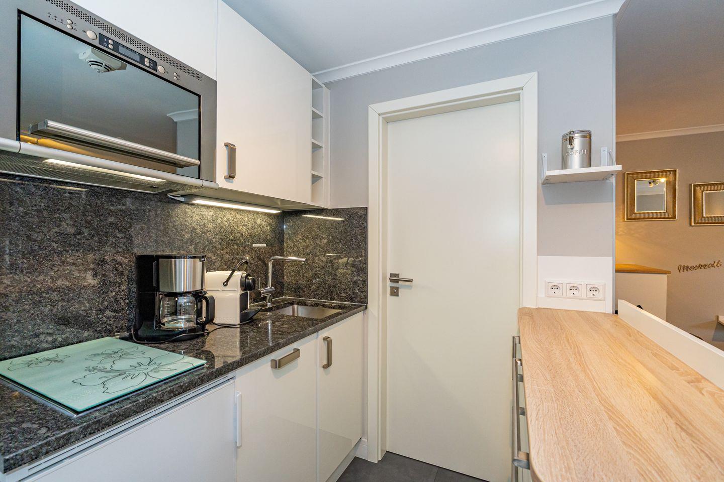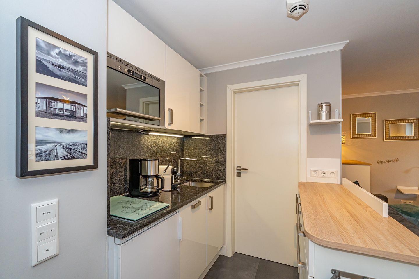 Der Wohn- und Schlafbereich ist als offener, klar strukturierter Raum gestaltet und bietet ein Sofa und TV. Ein Esstisch ergänzt den Raum für Mahlzeiten oder entspannte Abende. Die offene Küche ist zum Wohnzimmer hin gestaltet und praktisch ausgestattet: Ceran-Herd, Mikrowelle, Spülmaschine, Kühlschrank mit Gefrierfach, Kaffeemaschine sowie eine Nespresso-Espressomaschine, dazu Toaster und Wasserkocher.