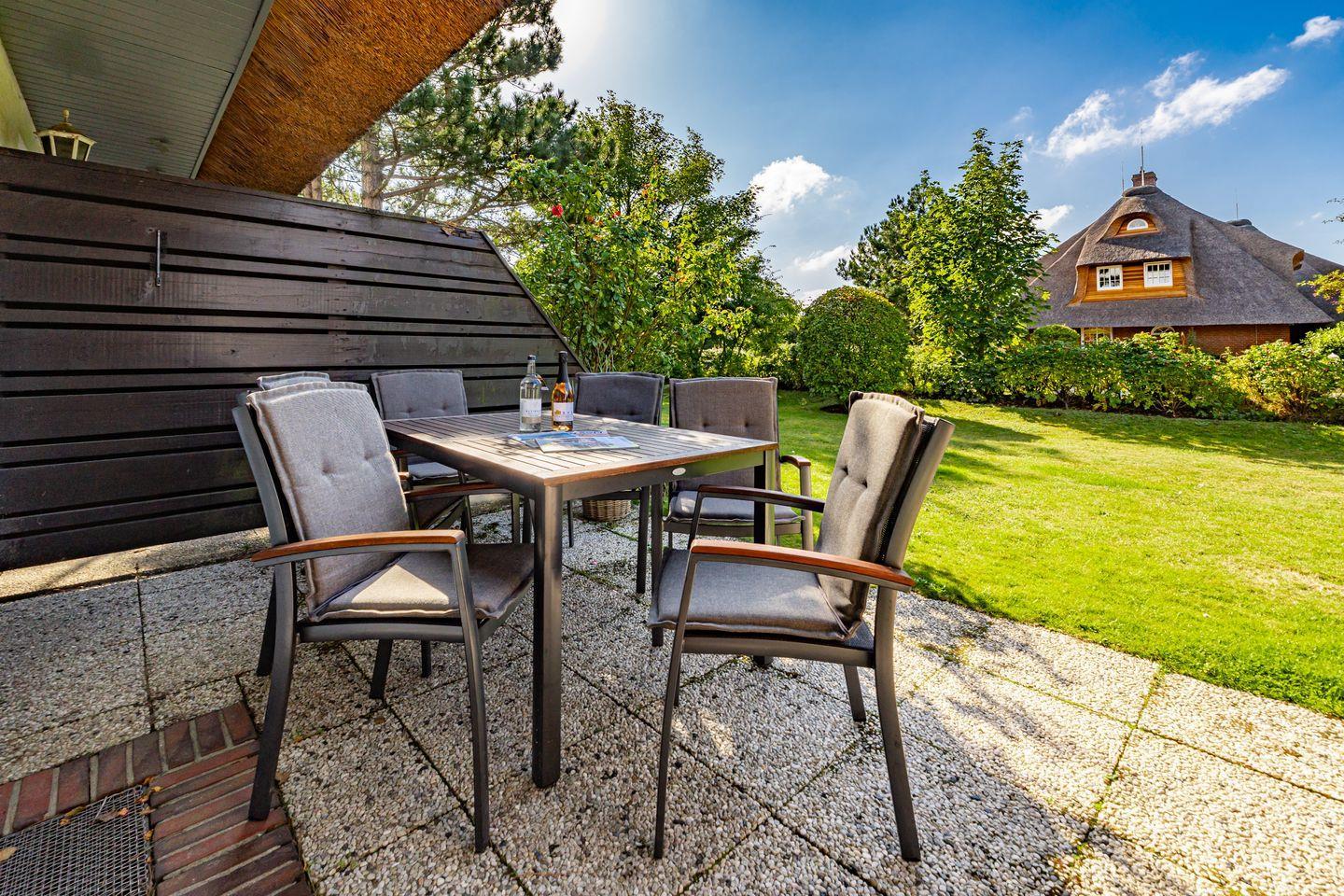 Moderne Ferienwohnung Rüm hart auf Sylt mit Terrasse, Gartenmöbeln und Privatparkplatz für erholsame Urlaube.