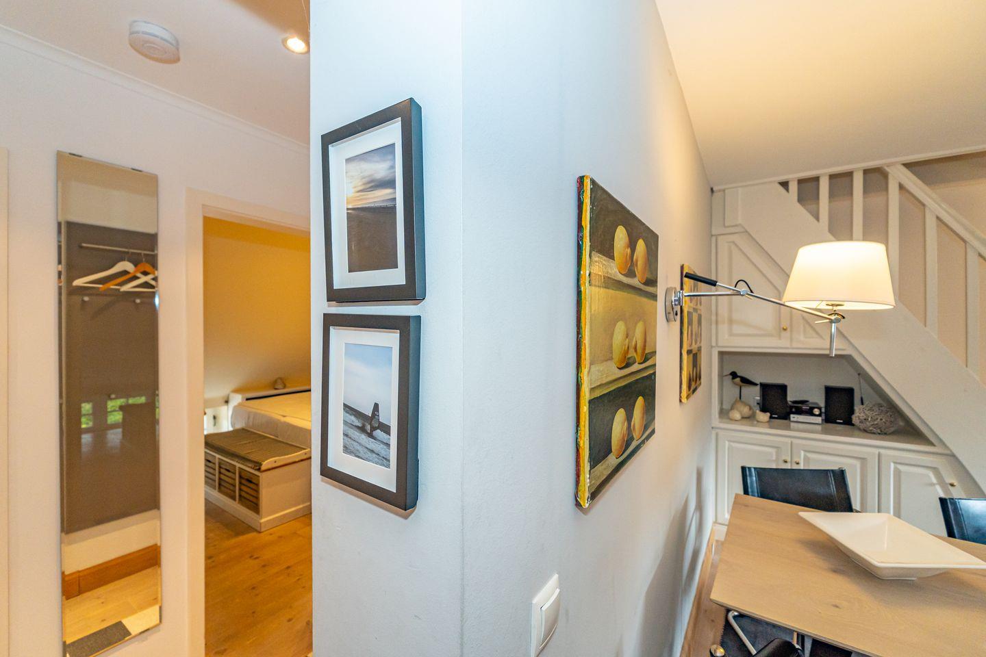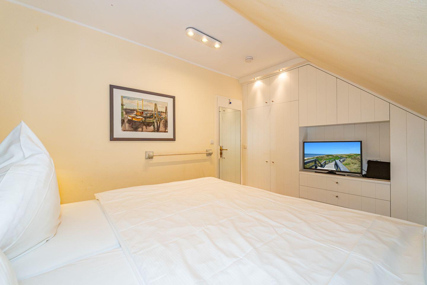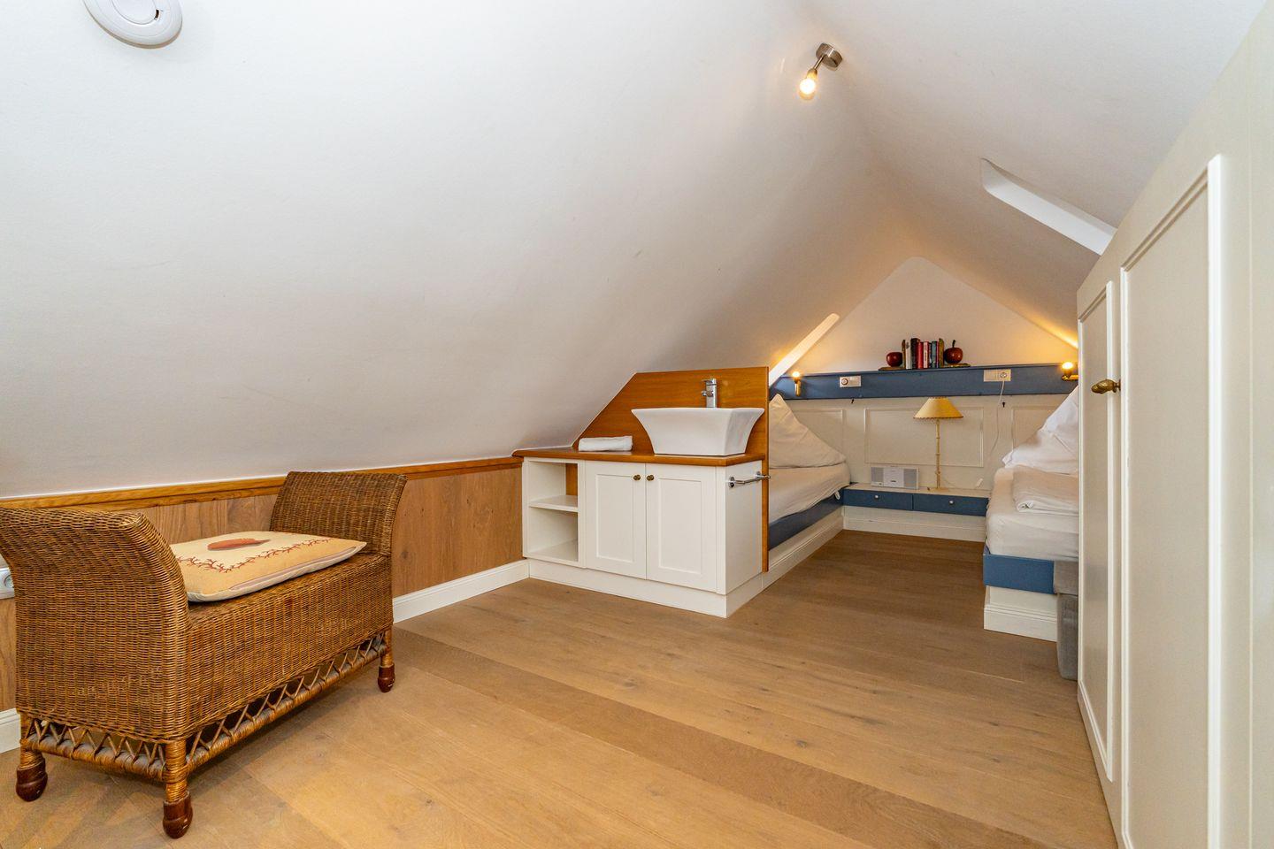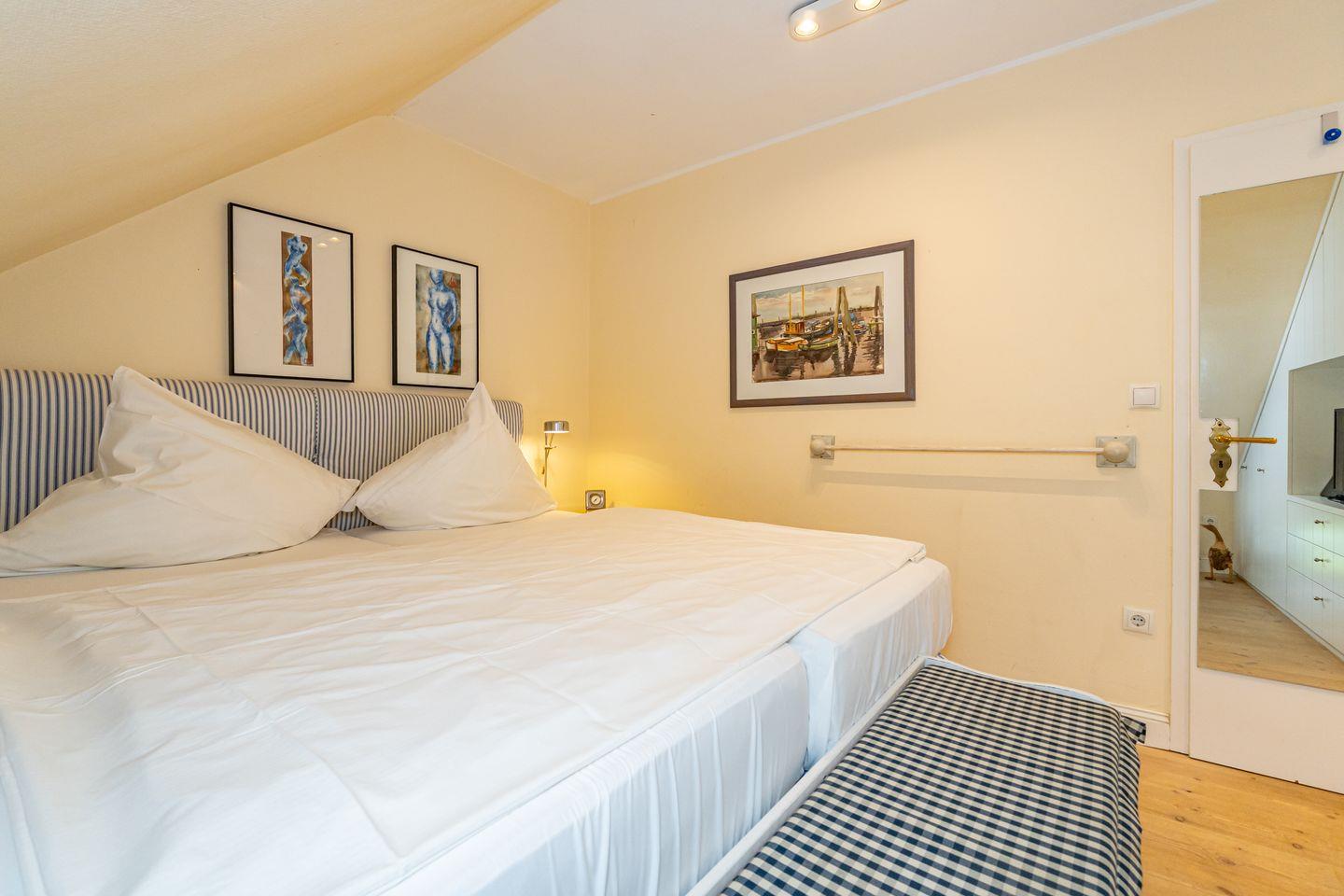 Der Küchenbereich überzeugt mit moderner Ausstattung. Hier finden Sie unter anderem einen Ceranherd, eine Mikrowelle, eine Spülmaschine, einen Kühlschrank mit Gefrierfach, sowie eine Kaffeemaschine als auch eine Espressomaschine. Der angrenzende Wohnbereich bietet ein bequemes Sofa, einen Fernseher und einen Esstisch für 4 Personen. Das Badezimmer ist mit einer bodengleichen Dusche, einem WC, einem Waschbecken, einem Spiegel und einem Haartrockner ausgestattet und bietet somit Funktionalität und Komfort. Das erste Schlafzimmer liegt auf der selben Ebene wie der Wohn- und Essbereich und verfügt über ein Doppelbett und einen Fernseher. Hier spiegelt sich der friesische Charme mit gemütlichen Dachschrägen wieder. Das zweite Schlafzimmer erreichen Sie über eine Treppe und ist offen zum Wohn- und Essbereich gestaltet, ohne Zimmertür. Hier erwarten Sie zwei Einzelbetten.