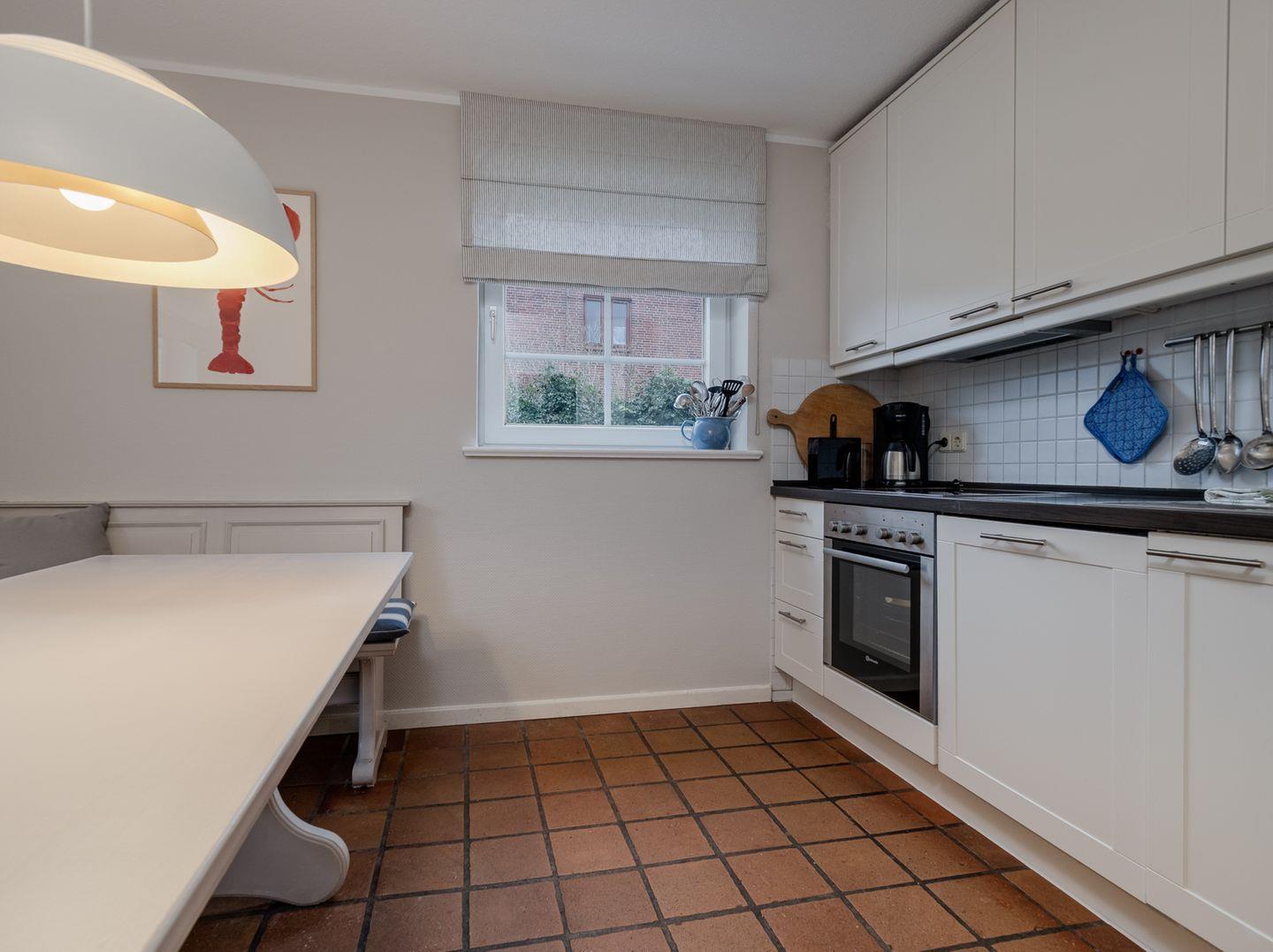 Die geschlossene und gut ausgestattete Wohnküche lädt zu gemütlichen Koch- und Spieleabenden mit Familie und Freunden ein. Das Herzstück ist der große Holz-Esstisch mit Eckbank, der viel Platz zum Sitzen bietet.