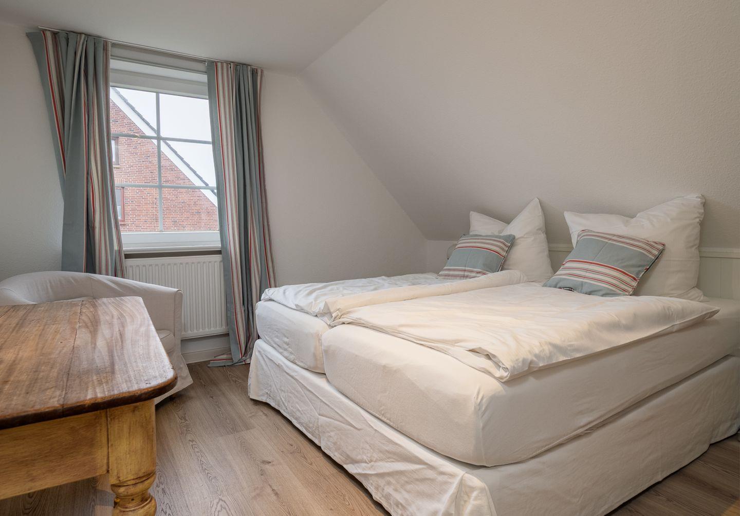 Schlafzimmer 4: Doppelbett, Kleiderschrank und Fenster.