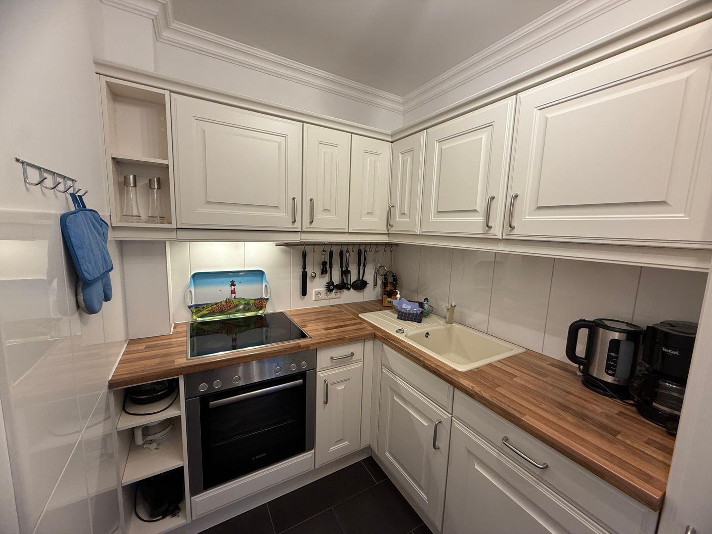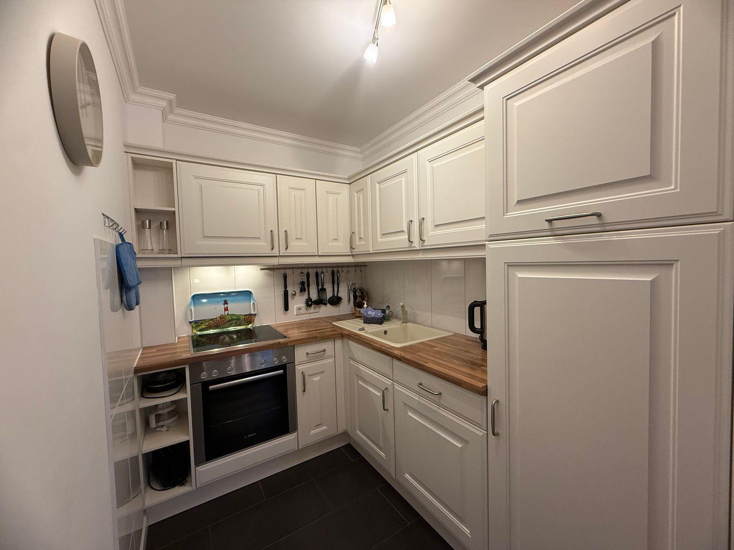 Die lichtdurchflutete Unterkunft ist als klassische Zwei-Zimmer-Wohnung angelegt und präsentiert sich mit ästhetisch abgestimmtem Interieur und wohnlichem Parkettboden, der dem Schlafzimmer und dem Wohnzimmer ein warmes, behagliches Ambiente verleiht. Das offene Raumkonzept verbindet Wohn- und Essbereich mit einer zeitgemäßen, offen gestalteten Küche, die sowohl für umfangreiche als auch für schnelle Mahlzeiten optimal ausgestattet ist: Neben einem modernen Induktionsherd und einem Backofen stehen Ihnen ein großer Kühlschrank mit integriertem Gefrierfach, eine Spülmaschine, Kaffeemaschine, Wasserkocher sowie Toaster und umfangreiche Küchenutensilien zur Verfügung. Für gemeinsame Mahlzeiten ist ein Esstisch vorhanden.
