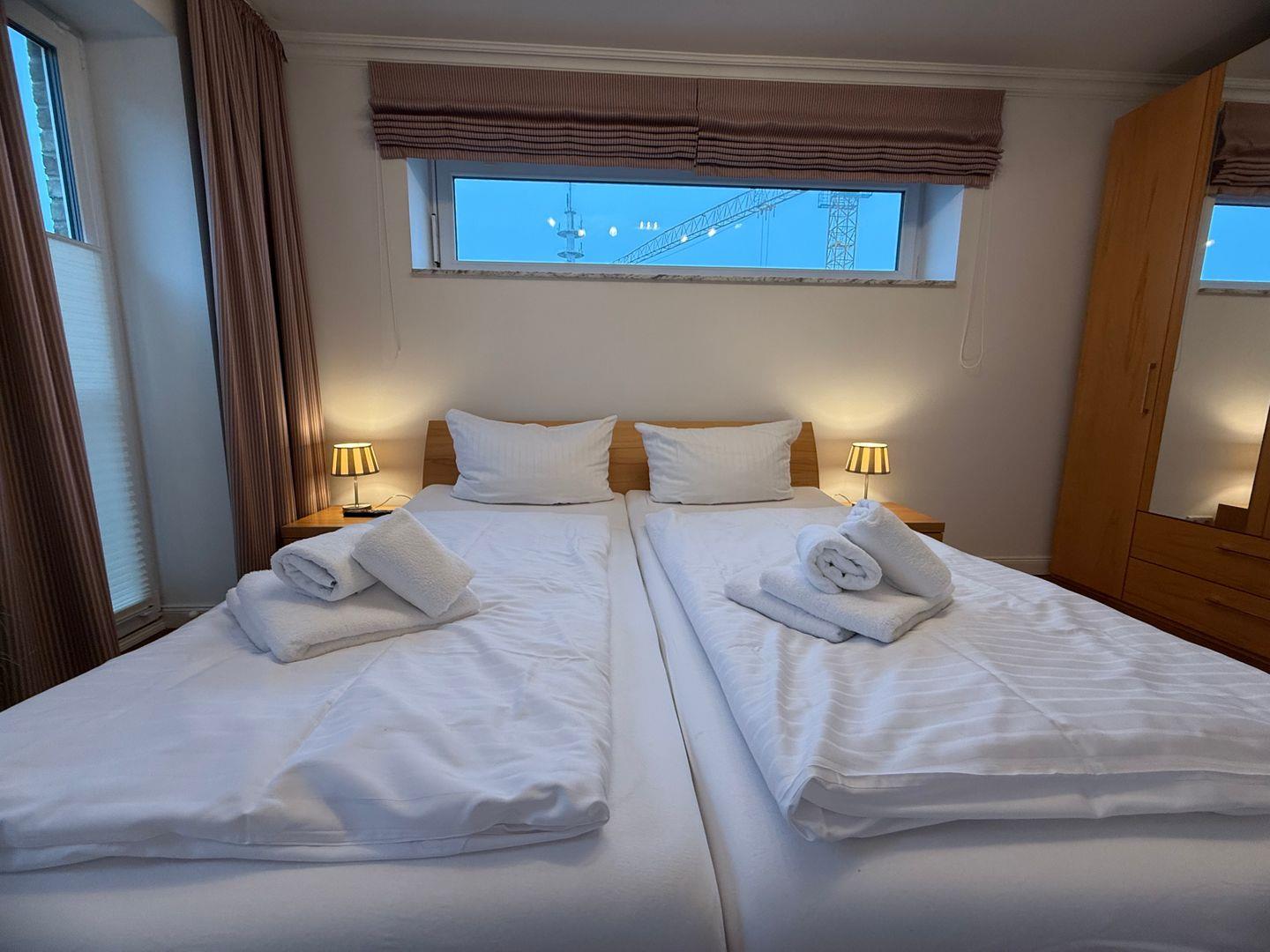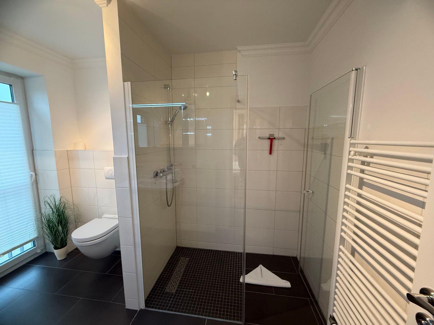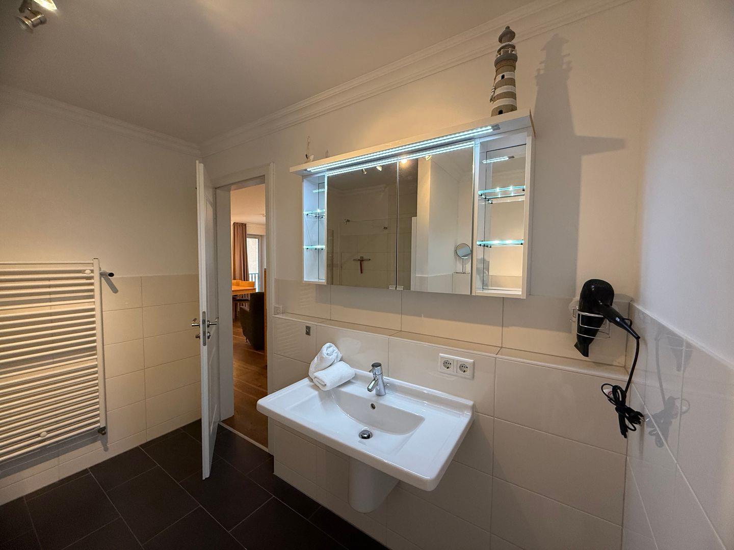 Das separate Schlafzimmer bietet ausreichend Platz und ist mit einem komfortablen Doppelbett und einem geräumigen Kleiderschrank eingerichtet. Im Schlafzimmer befindet sich der zweite Fernseher. Das Badezimmer ist modern gehalten und verfügt über eine bodengleiche Dusche, Haartrockner, Waschbecken, Spiegel sowie warmes Wasser. Frische Handtücher werden bereitgestellt. Weitere Annehmlichkeiten wie eigener Staubsauger, Ganzkörperspiegel sowie gemeinschaftlich nutzbare Waschmaschine und Trockner im Haus sorgen für zusätzliche Bequemlichkeit – die Nutzung erfolgt gemeinschaftlich und unterstützt längere Aufenthalte.