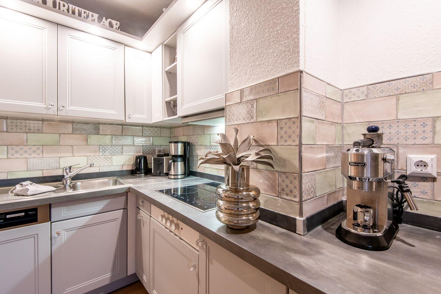 Die offene Küche ist vollständig ausgestattet – inklusive Ceran-Kochfeld, Kühlschrank und Toaster – und bietet alles, was Sie brauchen, um sich kulinarisch zu verwöhnen. Starten Sie den Tag mit einem frisch aufgebrühten Kaffee und genießen Sie die erste Mahlzeit des Tages in entspannter Atmosphäre.