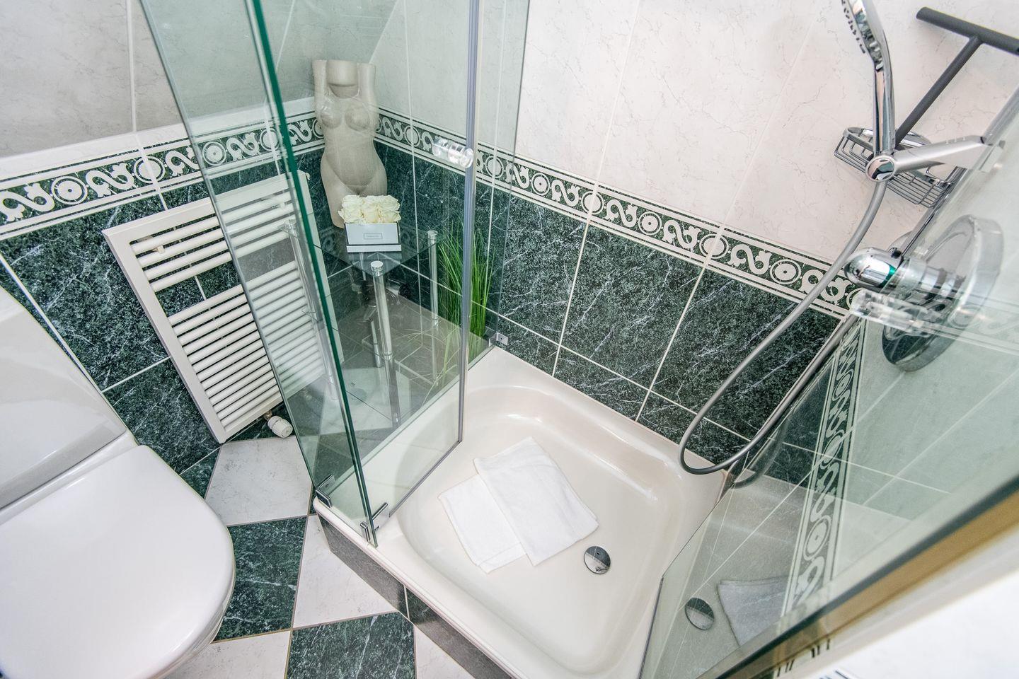 Das moderne Duschbad mit bodengleicher Dusche sorgt für einen angenehmen Start in den Tag. Hell und funktional – hier beginnt Ihr Morgen mit einer belebenden Erfrischung.