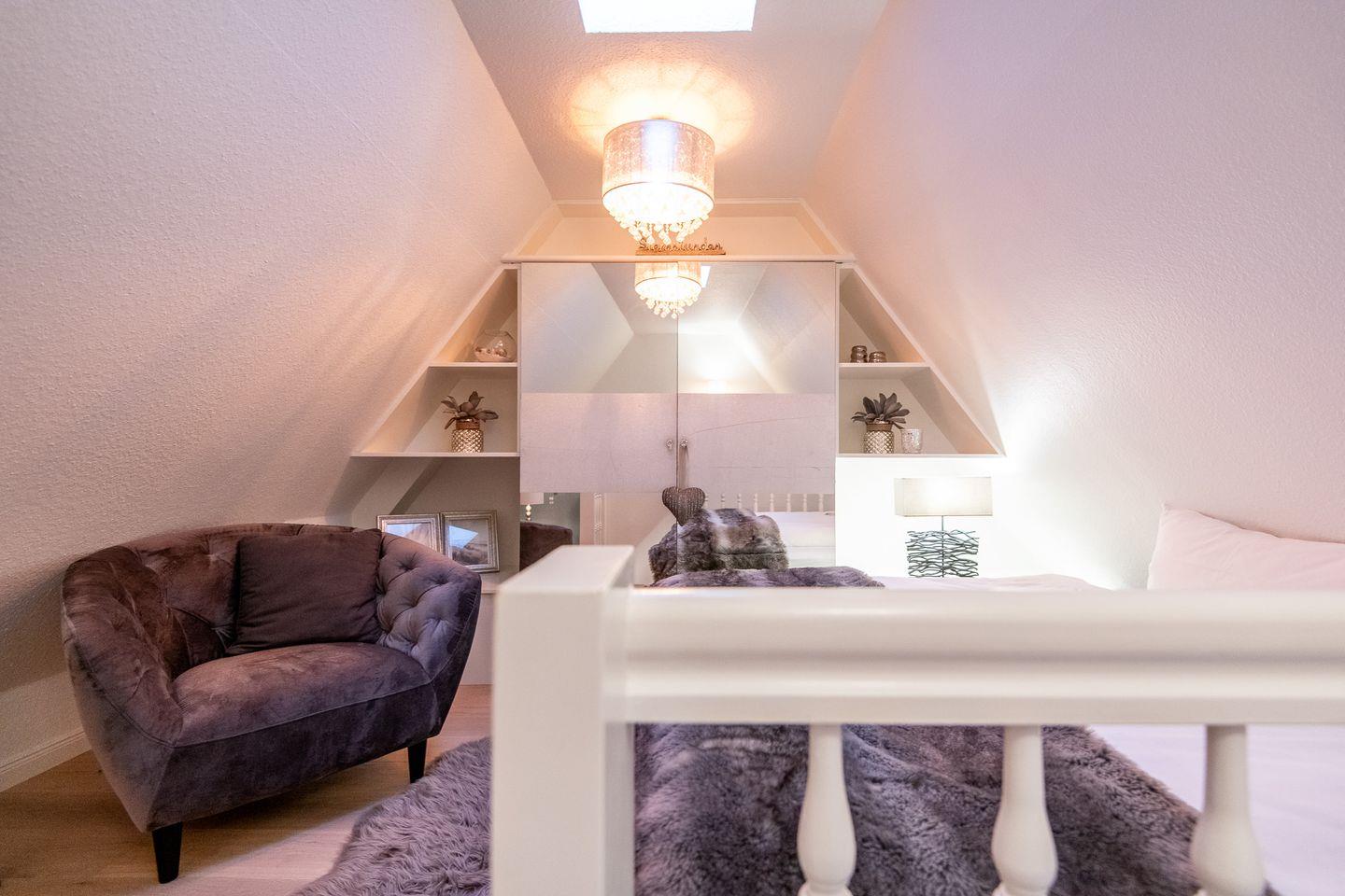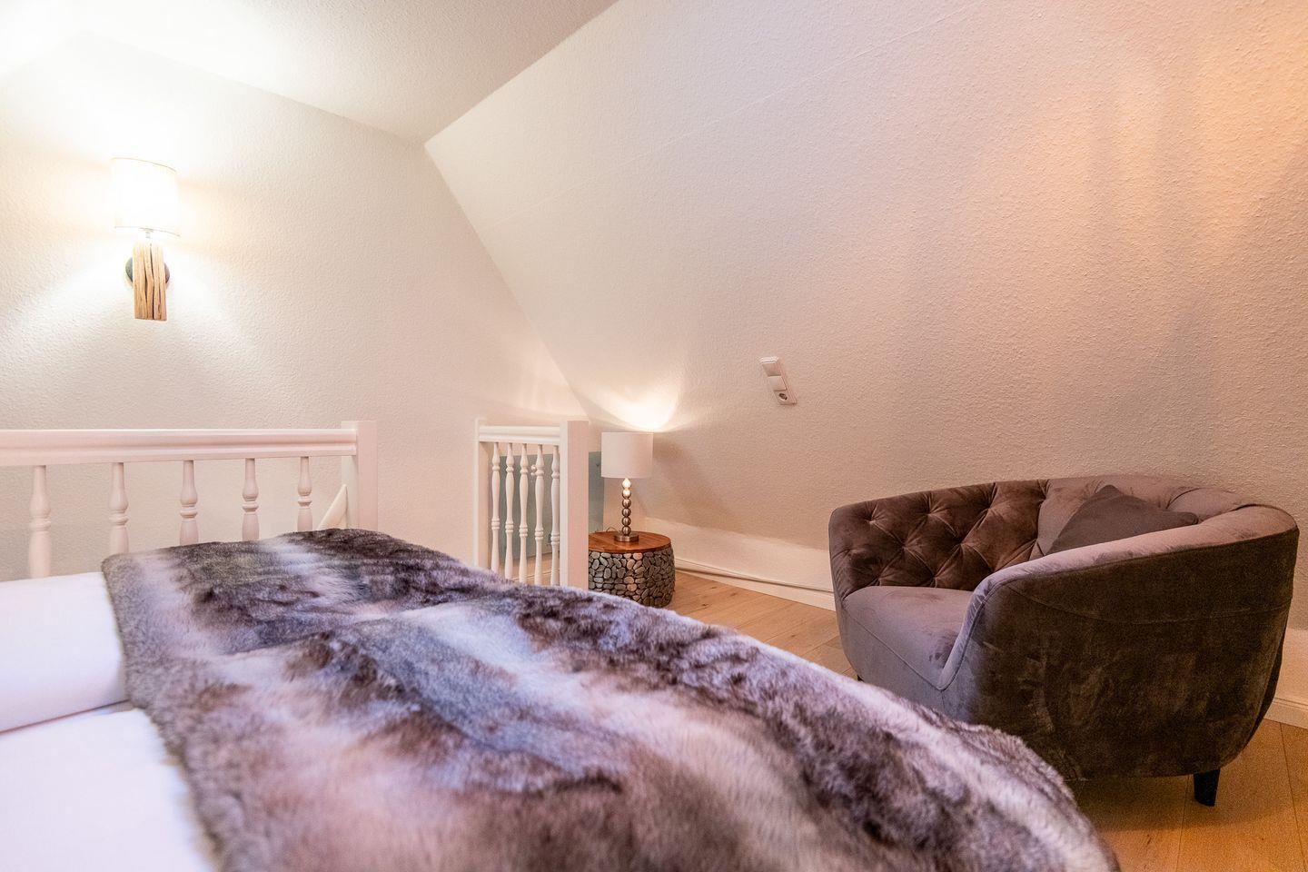 Im gemütlichen Schlafzimmer mit bequemen Bett, Kleiderschrank und einem Sessel finden Sie Ihre wohlverdiente Ruhe. Hier oben unter dem Reetdach schlafen Sie besonders geborgen – ideal, um die Eindrücke eines Urlaubstags Revue passieren zu lassen.