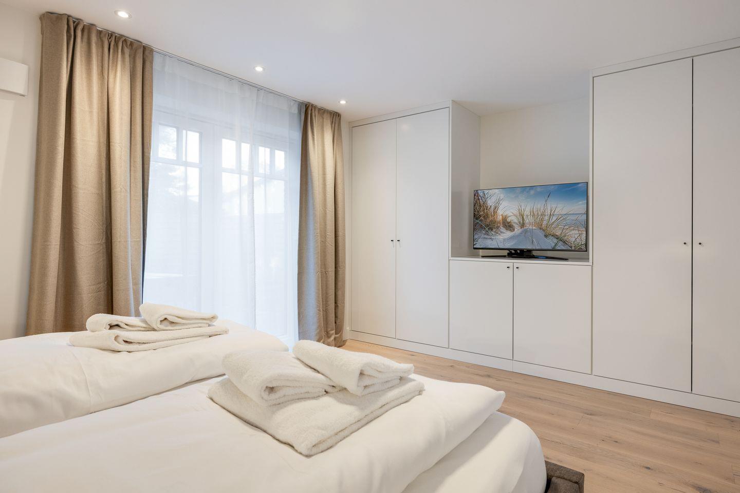 OG: Schlafzimmer mit Doppelbett und TV, Bad mit Dusche, WC und Waschtrockner