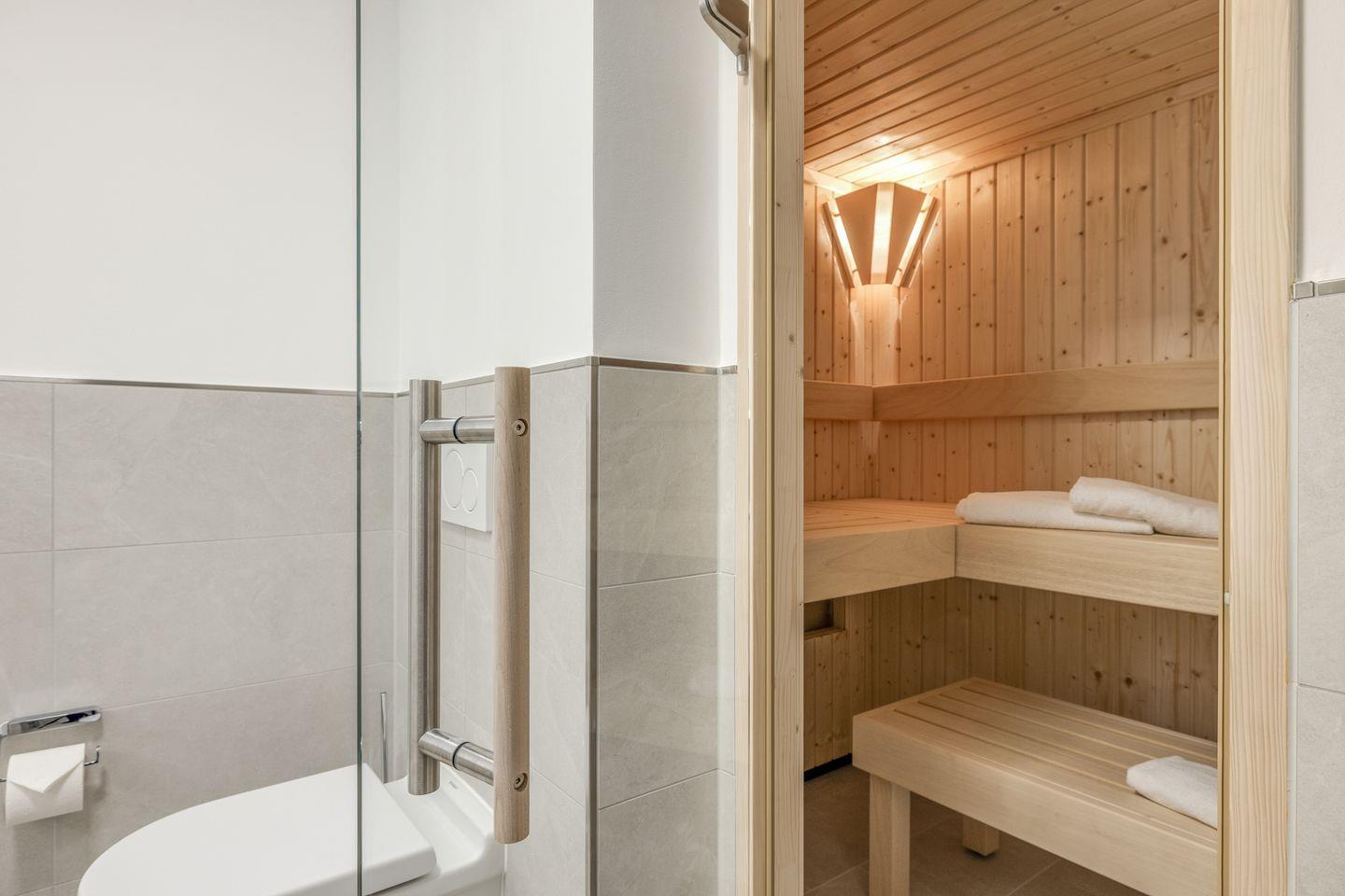 UG: Schlafzimmer mit Doppelbett und TV, Bad mit Dusche, WC und Sauna
