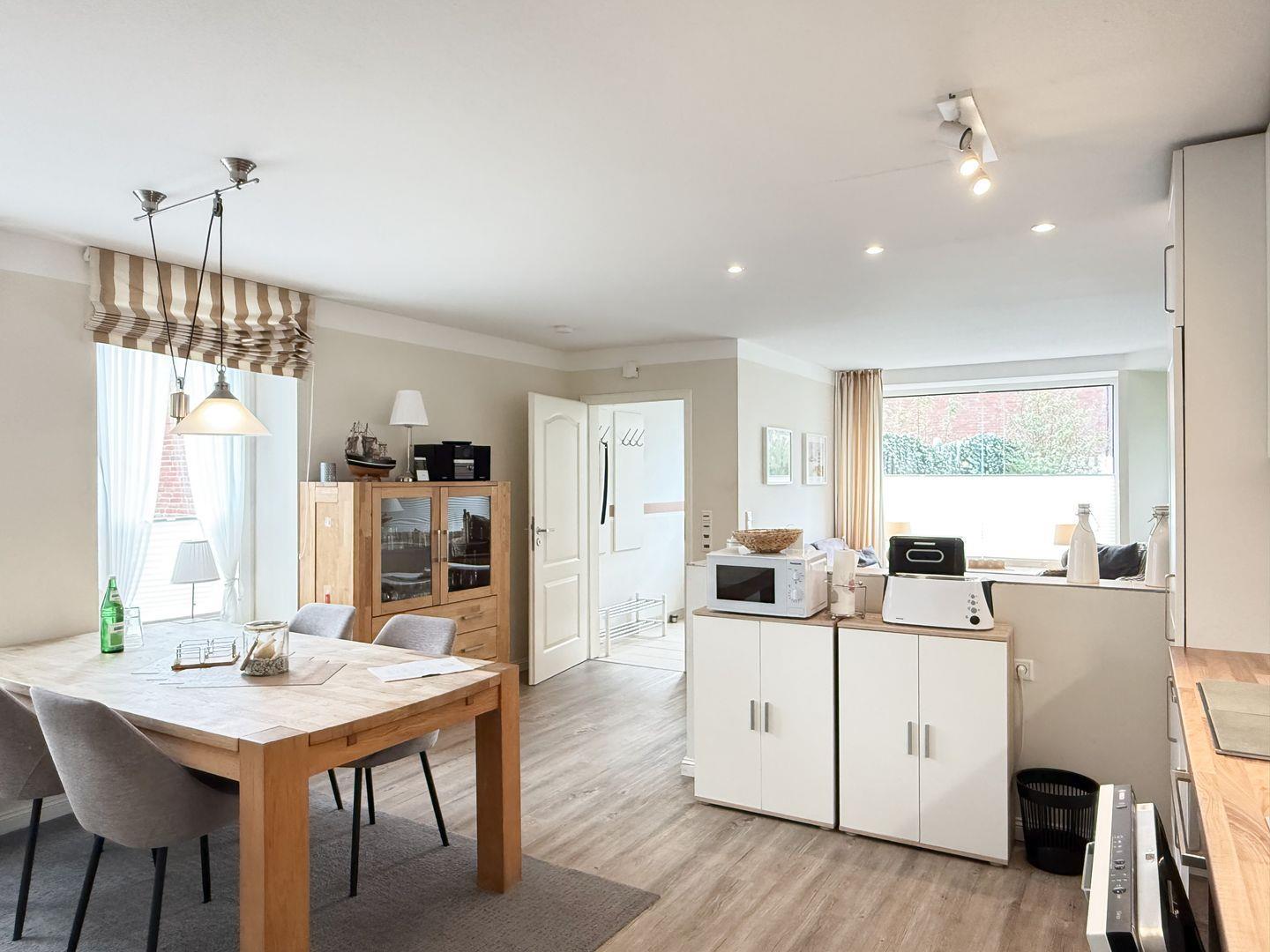 Im Außenbereich erwartet Sie eine eigene Terrasse mit Gartenmöbeln sowie Zugang zum gepflegten Garten. Hier können Sie erholsame Stunden im Freien verbringen oder einen ereignisreichen Tag an der frischen Nordseeluft ausklingen lassen. Ihr Fahrzeug parken Sie auf dem hauseigenen, kostenfreien Parkplatz.